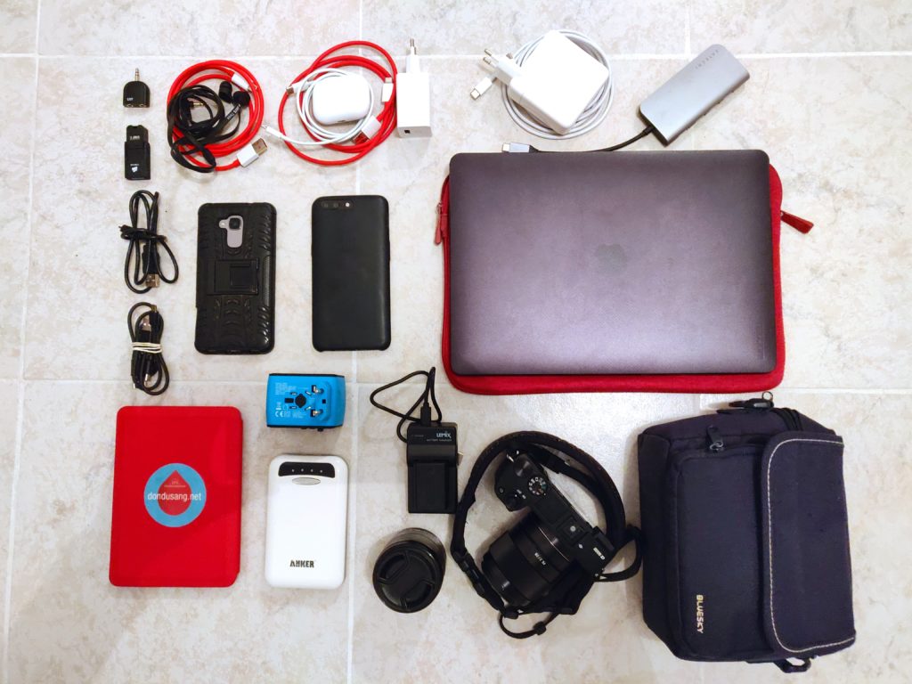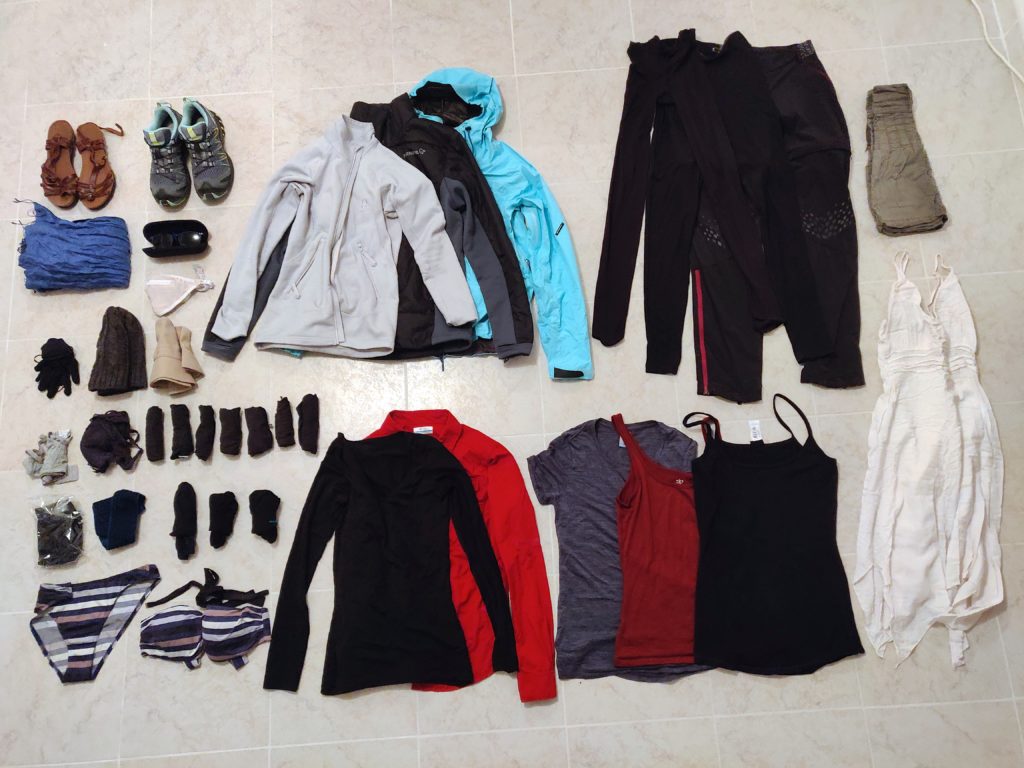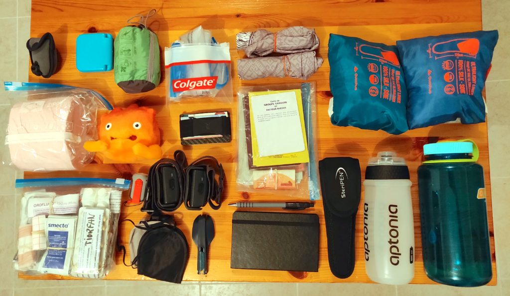 On s’est donc basés sur leurs conseils selon lesquels la moyenne de ce que les gens emportent, 14kg, est trop, et on a essayé de prendre le minimum vital. On a à peu près suivi leurs recommandations (ils ont un article très complet sur le matériel et même un Excel à télécharger du matériel indispensable selon eux, 10kg pour les femmes et 11kg pour les hommes), à part sur quelques points où on n’a pas vraiment réussi à limiter : l’ordinateur (ça c’est Romain qui veut pouvoir coder confortablement), l’appareil photo, et quelques « au cas où » de la trousse de toilette et pharmacie. Sinon on est plutôt bien :