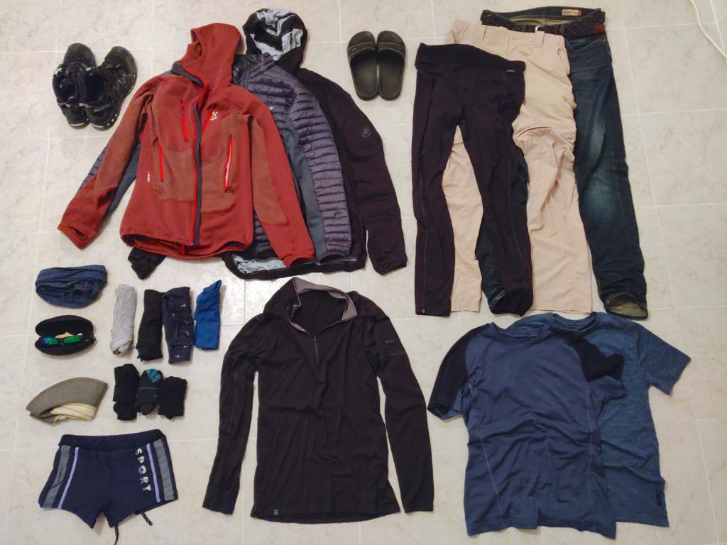 On a suivi les conseils de tous les sites de voyageurs pour les chaussures : les chaussures de running/trail (modèle avec tiges pour nous qui voulons pas mal marcher) qui sont le meilleur compromis pour la ville, la randonnée, le trek, etc. et une paire en plus pour la plage, l’hôtel, les douches suspectes…