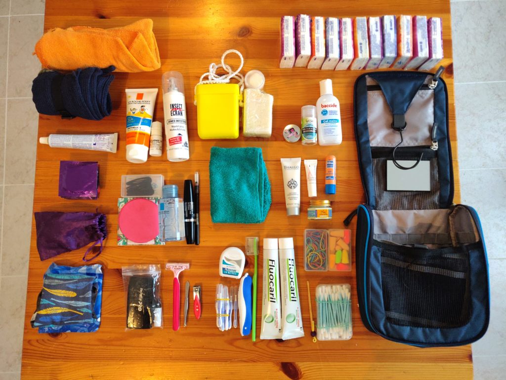 Bon, là aussi, on était partis sur du très minimaliste avec la liste de tourdumondiste, mais après notre voyage-test à Ibiza, on est un peu revenus sur certaines décisions (entre autres exemples, Camille malade a besoin de beaucoup trop de mouchoirs 😢 , le dentifrice solide c’est vraiment pas bon, et une serviette pour deux… mmgroumf). Au final, la trousse est pas mal pleine, mais comme on va utiliser les produits au fur et à mesure, elle ne fera que s’alléger 😬 !