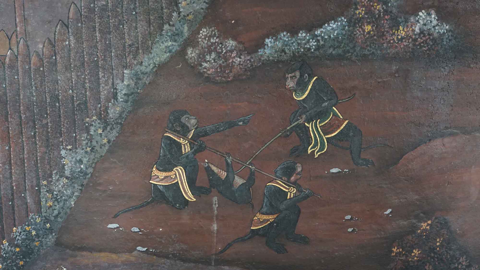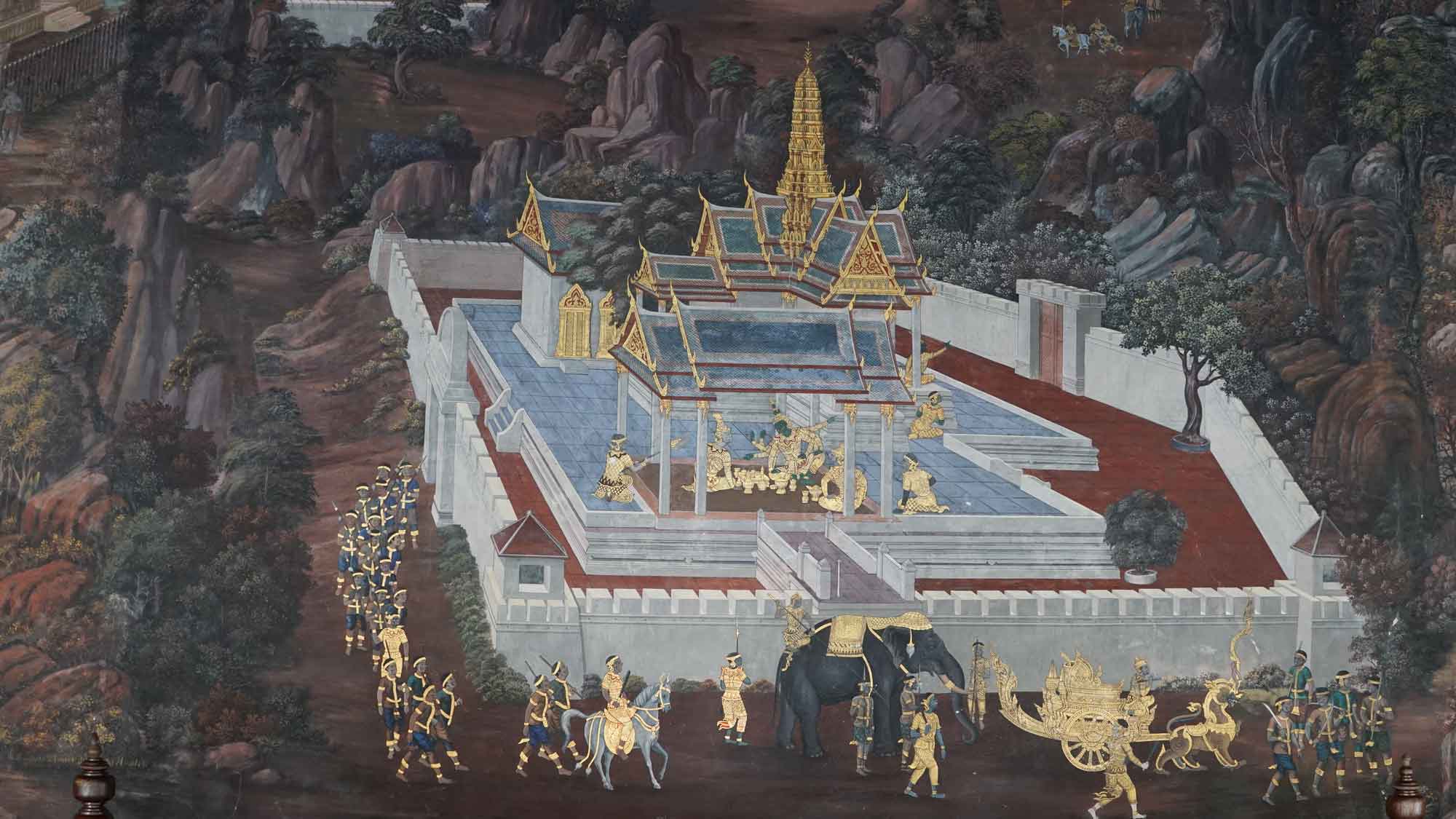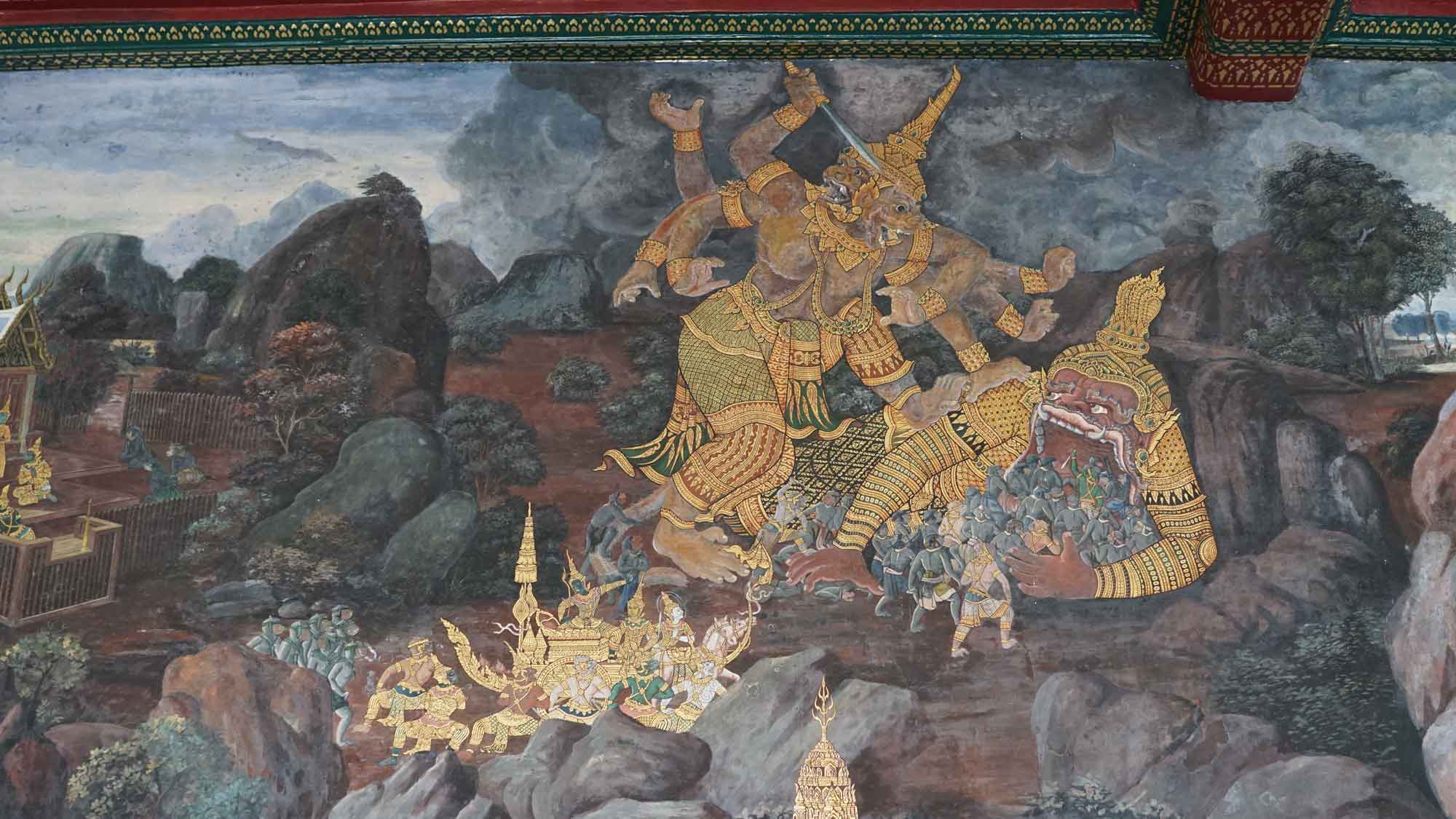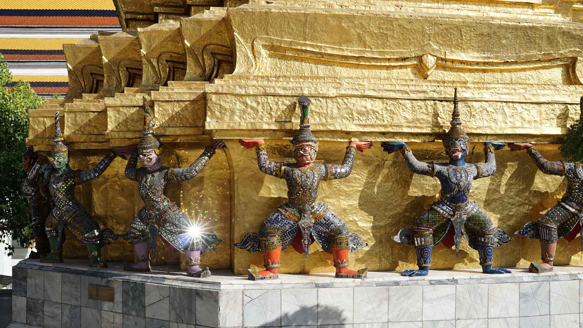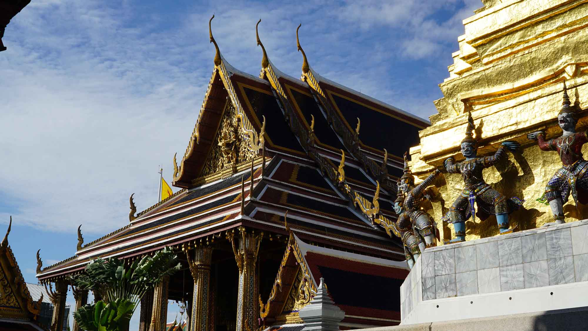 Le lendemain, nous décidons de nous lever tôt pour aller visiter le Grand Palais — ancienne résidence du roi. Sur Internet, on nous recommande d’être dans les premiers à rentrer pour éviter les dizaines de bus remplis de touristes chinois, qui ont la réputation (totalement justifiée) d’être extrêmement irrespectueux envers n’importe quel environnement. Nous suivrons ces précieux conseils et profitons d’une visite assez peu perturbée (à chaque fois qu’un groupe arrive, nous fuyons vers la suite de la visite). Après la magnifique zone du Temple du Bouddha d’Émeraude et son impressionnante fresque qui court tout le long du mur d’enceinte, nous passons devant le Grand Palais proprement dit, puis visitons (seuls !) le musée du Grand Palais, expliquant les grands travaux de rénovation au rez-de-chaussée et présentant une sélection d’offrandes de différents endroits du monde au premier étage. Un panneau explique les différentes positions de Bouddha, correspondant aux jours de la semaine (avec une en plus pour le mercredi après-midi !). Une petite musique d’ambiance un peu anachronique (morceaux de piano classique occidental) rend l’atmosphère fort sympathique, jusqu’à l’arrivée d’un premier groupe. Fuyons !