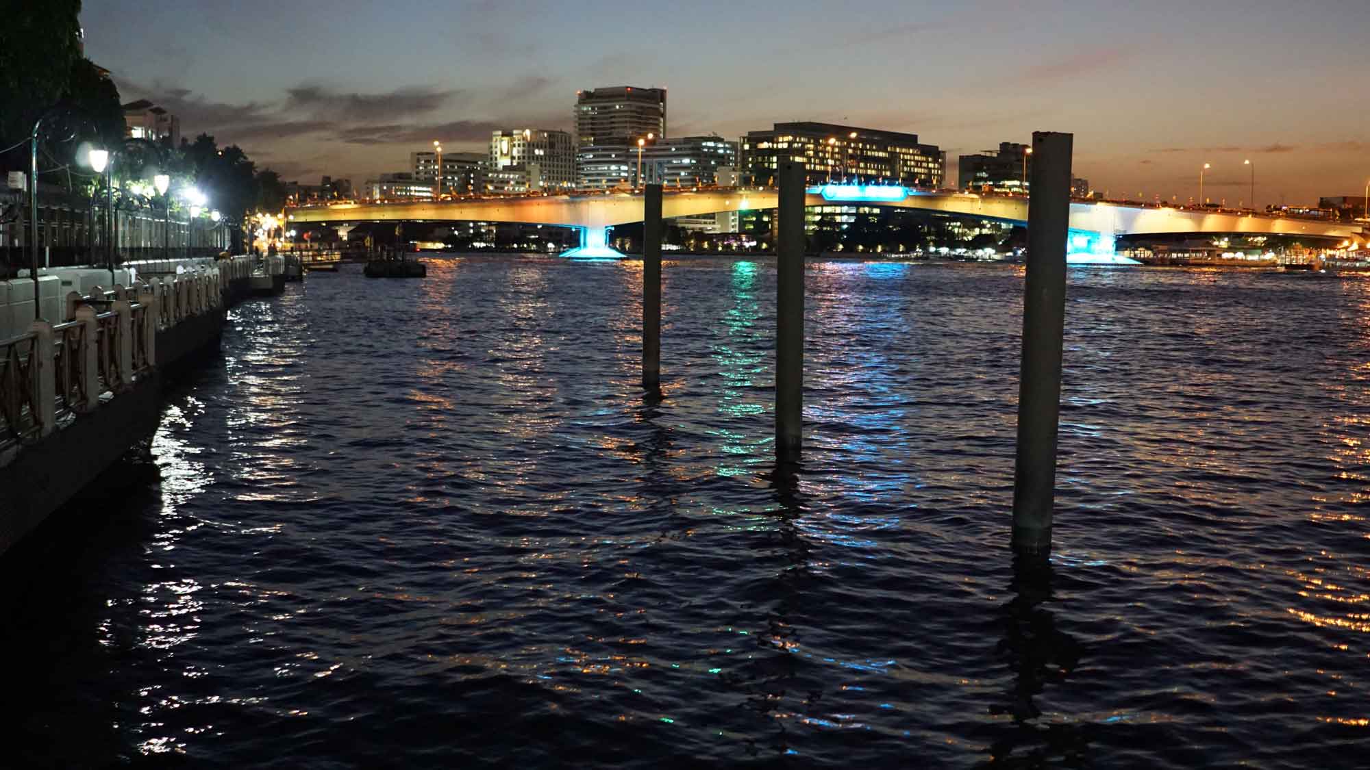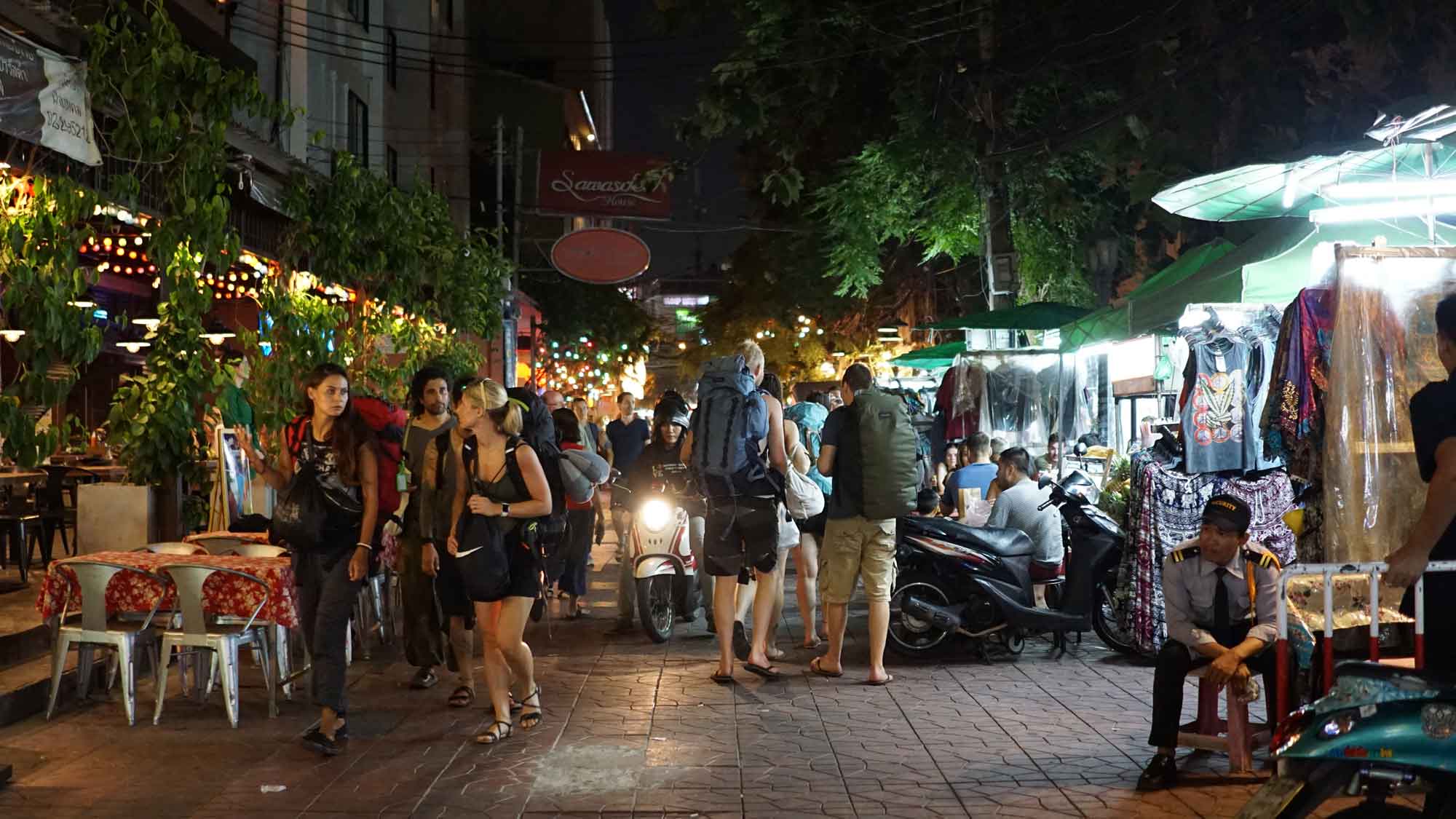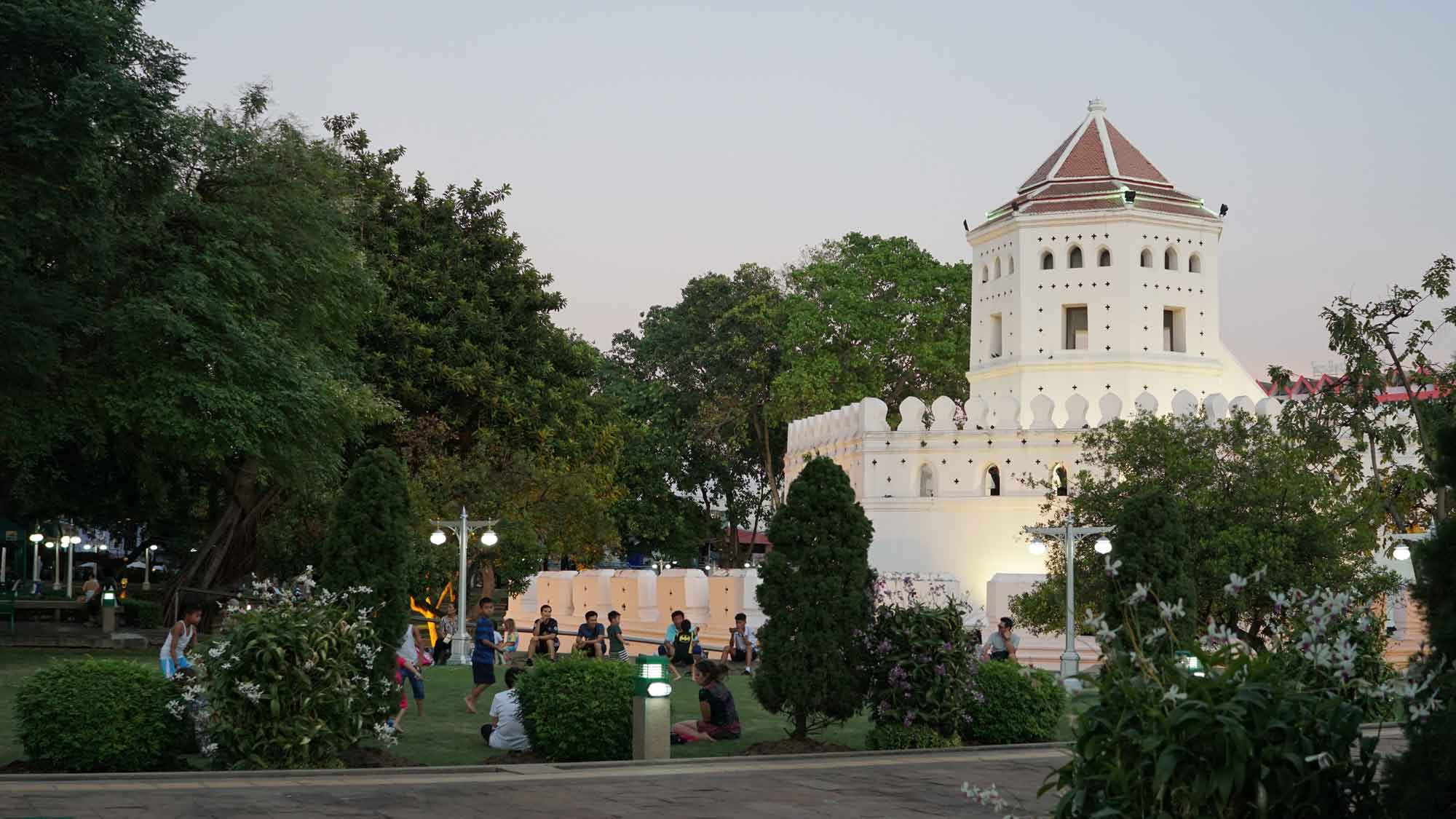Le soir arrive doucement, et nous nous rapprochons du fleuve vers le Phra Sumen Fort pour admirer les jolies couleurs du coucher de soleil, avec une toile de fond originale : un cours thaïlandais de zumba en plein air ! Le seul occidental à essayer le cours était bien en peine de suivre, et nous n’avons même pas tenté. Nous marchons le long du fleuve, éclairés par les lumières de ville nocturne ; c’est beau ! En rentrant, on passe dans une supérette acheter un repas tout prêt, pas trop cher pour économiser un peu, qu’on mangera à même le sol dans notre petite chambre. On ressort ensuite dans la Rambuttri Alley, une petite rue avec un night market, près de la célèbre (mais trop touristique) rue Khao San Road : très sympa et beaucoup moins bondée de touristes et de vendeurs de rue. On s’y pose pour siroter une noix de coco et un énième Mango Juice pour Camille.