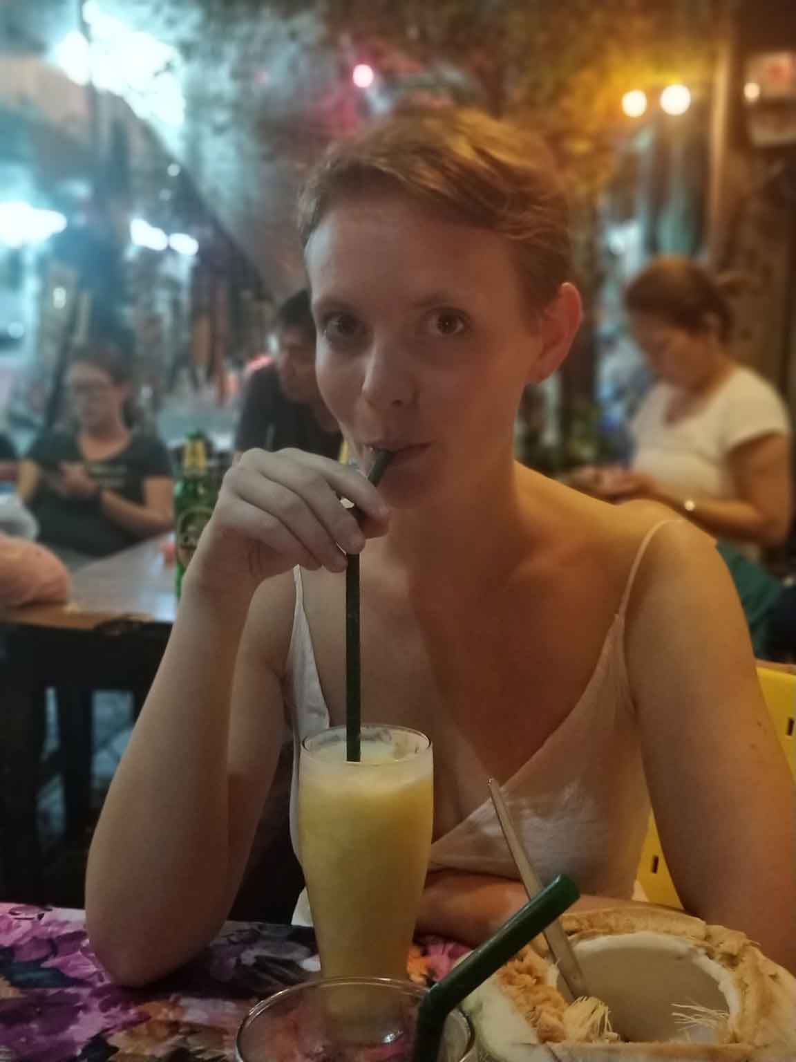 Vu que nous sommes complètement décalés, nous rentrons vers l’hôtel et mangeons à 11h. Camille craquera pour un délicieux Mango Shake qui accompagnera son Yellow Curry with Vegetables.