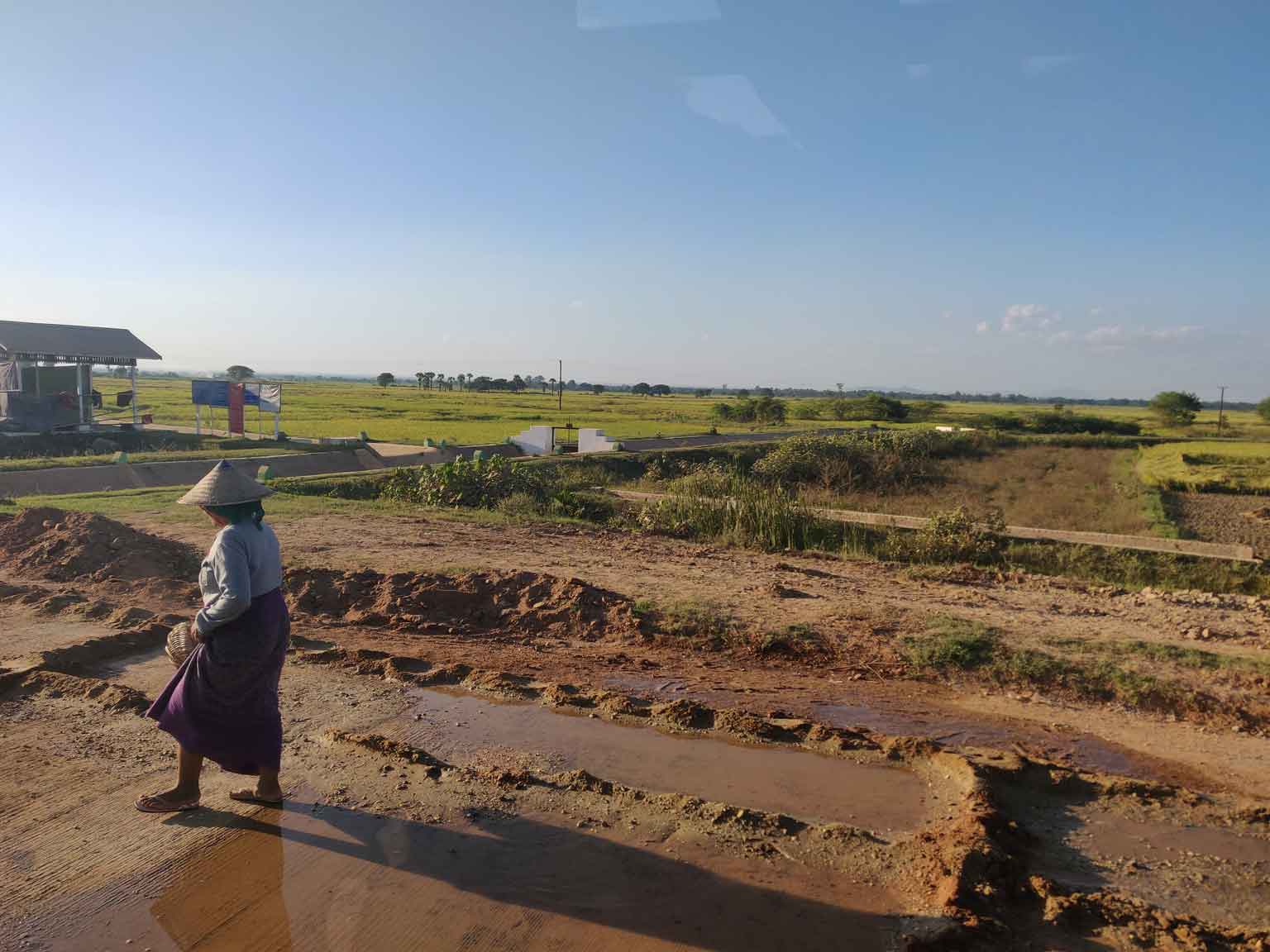 Le bus que nous avons pris à Mandalay met une heure de moins que prévu, ça c’est chouette… Par contre il ne nous pose pas du tout devant l’hôtel mais à la station de bus. Nous voilà obligés de prendre un taxi ; on économise un tout petit peu en partageant la course avec un couple italo-slovène arrivé en même temps que nous. Sur le chemin, on voit la différence avec Mandalay : au revoir la ville, c’est vraiment des villages ici ! Aucun bâtiment de plus de trois étages et encore, ce sont uniquement des hôtels.