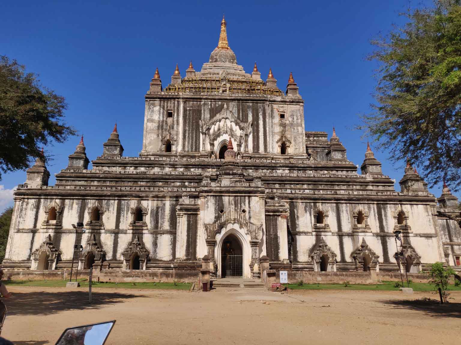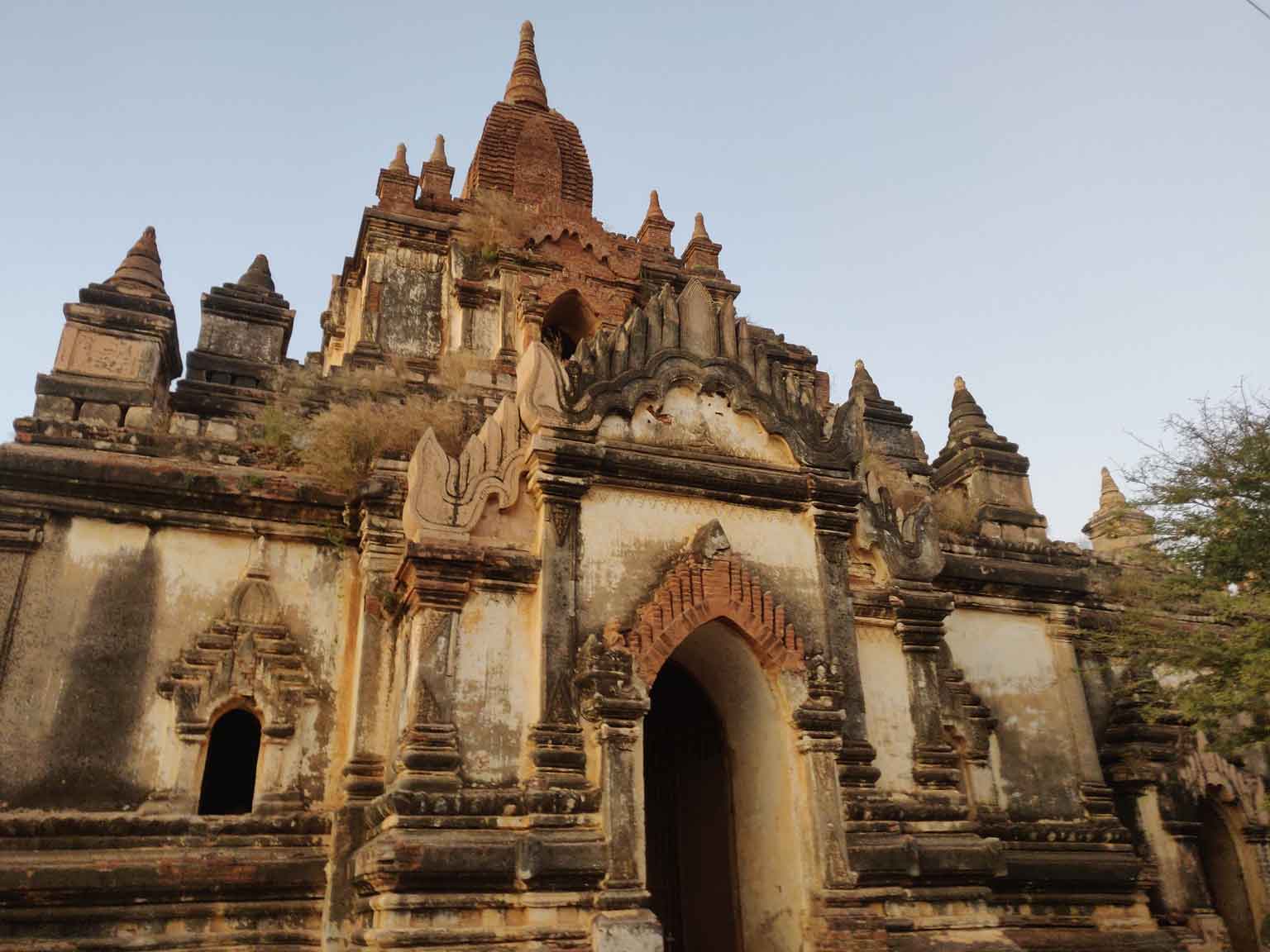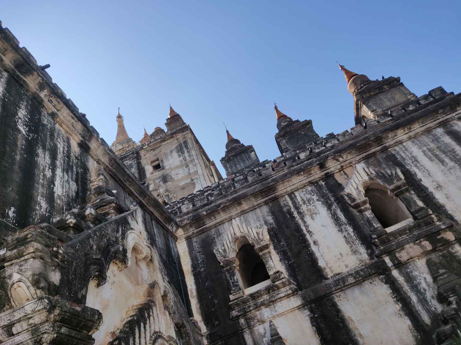 En continuant sur la route, Camille repère le Thaathbinyu, qui restera son architecture préférée ! Murs blancs (même si la pluie a laissé des traces) et surtout petites pointes crénelées au sommet qui se détachent sur le ciel.