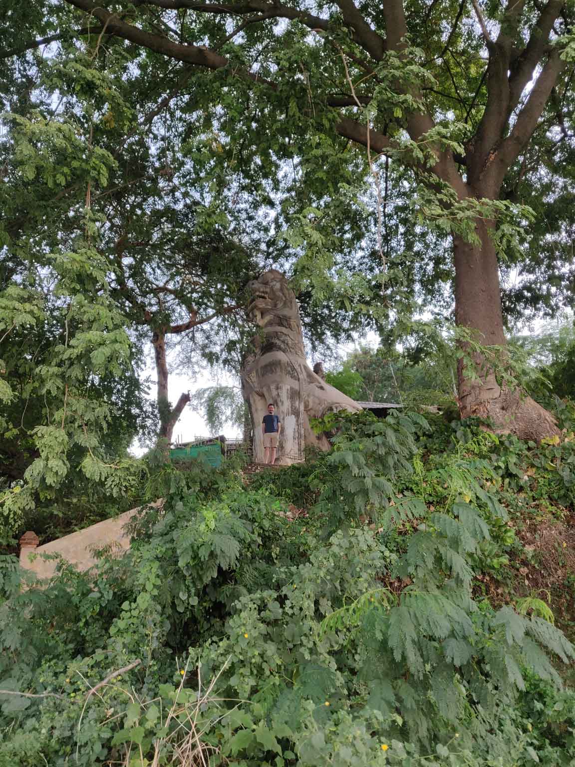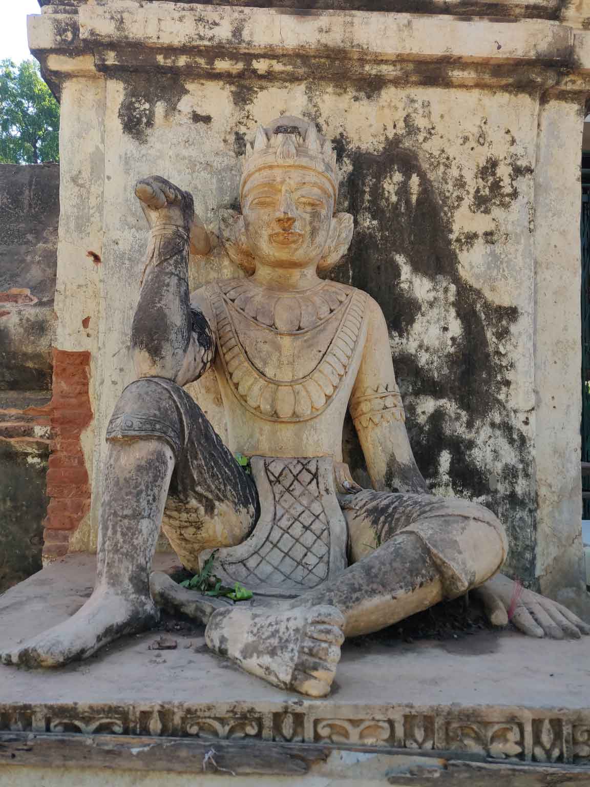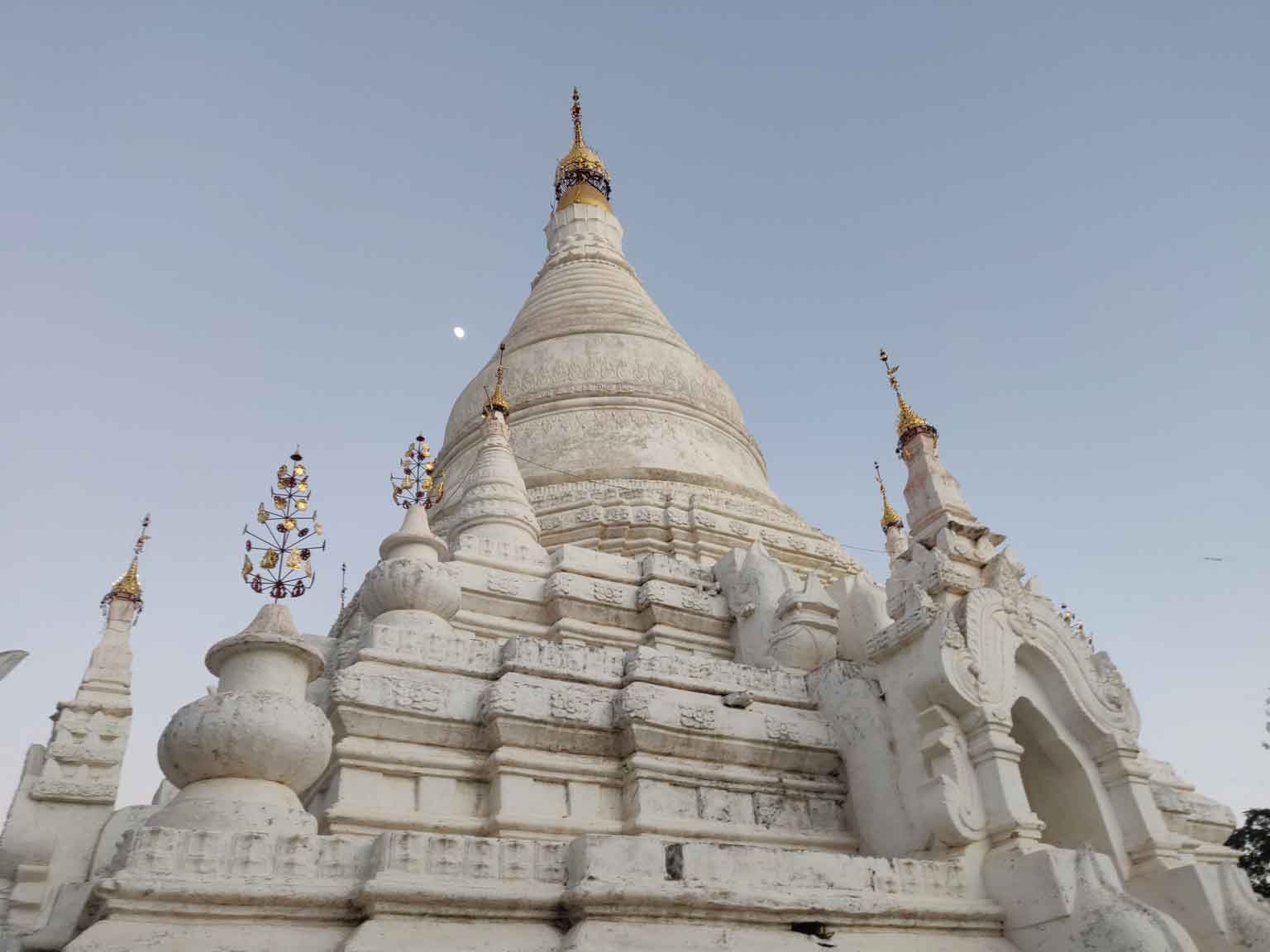 En continuant sur la route, Camille repère le Thaathbinyu, qui restera son architecture préférée ! Murs blancs (même si la pluie a laissé des traces) et surtout petites pointes crénelées au sommet qui se détachent sur le ciel.