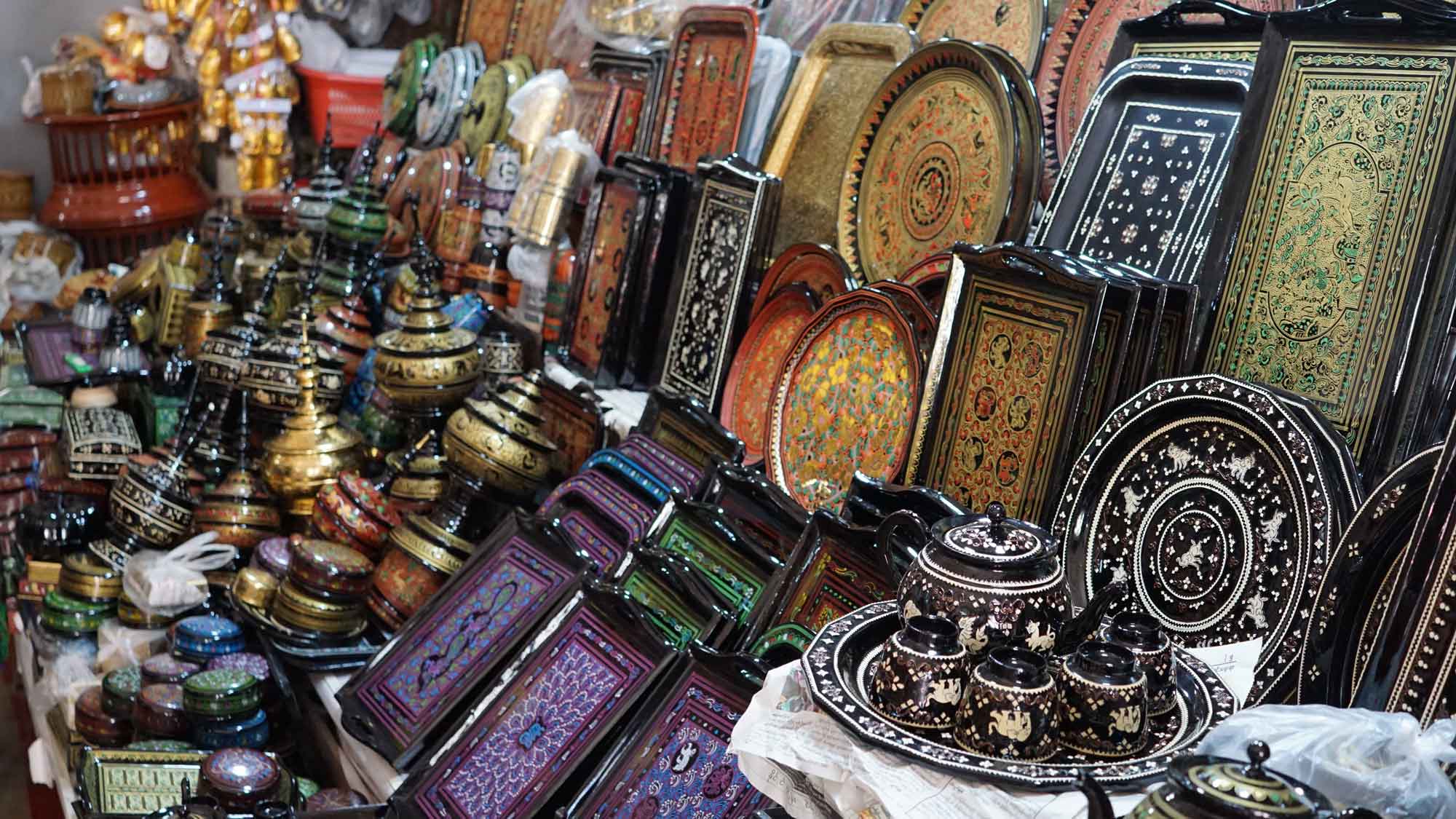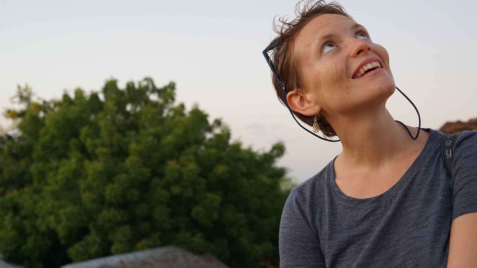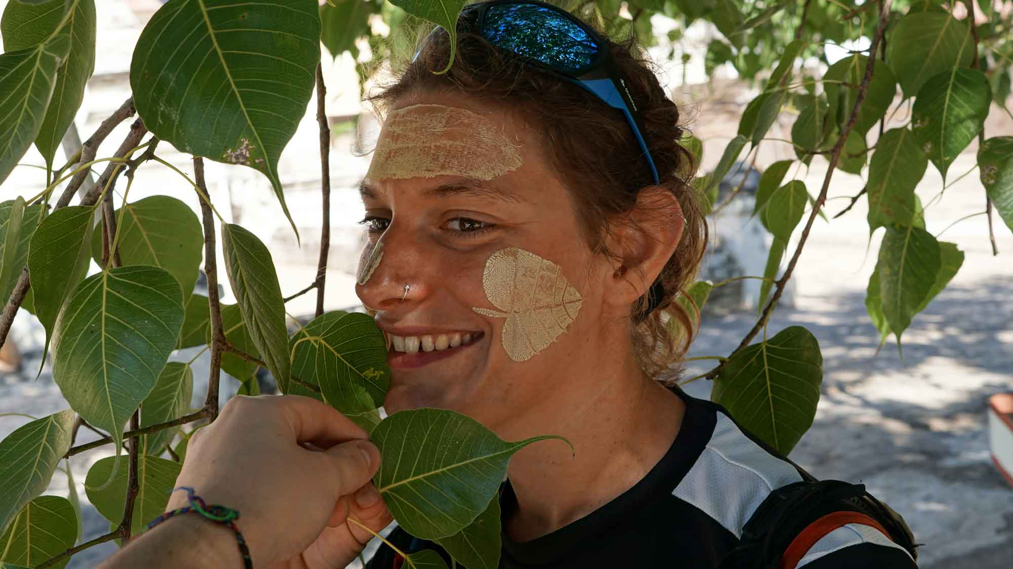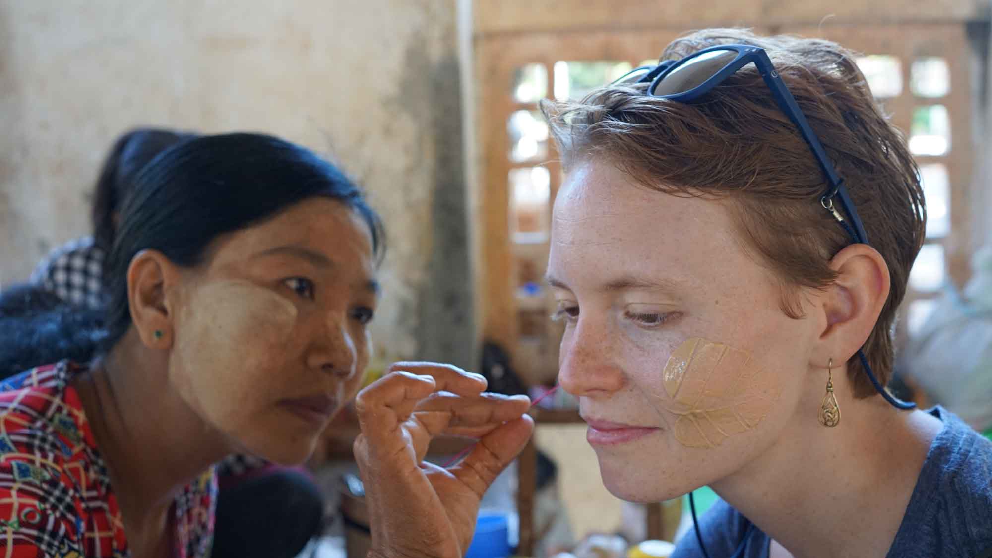C’est parti pour la tournée des temples : d’abord la Shwezigon Pagoda juste à côté, avec sa grande stupa dorée, un gros tambour de cérémonie… On sent la différence entre Bagan et Mandalay quand les vendeurs devant l’entrée viennent essayer de nous alpaguer. Bagan, c’est un peu comme la Tour Eiffel. En entrant, Sara se fait maquiller avec le thanaka, une tradition du Myanmar présente partout dans le pays : en mélangeant de l’eau avec du bois de thanaka, on obtient une pâte jaune très clair que les femmes et les enfants s’appliquent sur les joues, le nez et le front. Ça protège du soleil, c’est bon pour la peau, et esthétique quand on dessine des motifs comme des feuilles sur les joues, ce que la dame fera pour Sara et Camille. En discutant un peu, on apprend qu’elle a perdu son mari récemment et qu’elle s’occupe de ses deux enfants grâce à ses ventes de thanaka dans le temple. Un peu plus loin, on regarde les services traditionnels en bambou laqué (bols, théières, plateaux), c’est super beau !