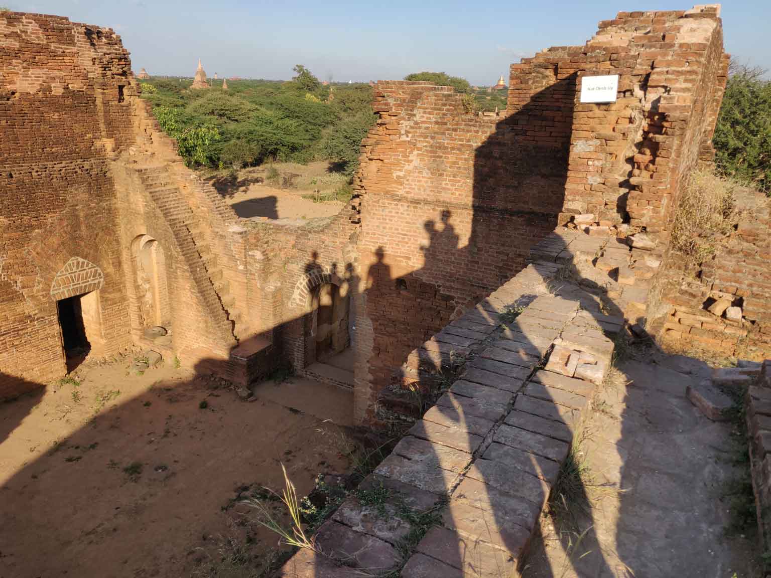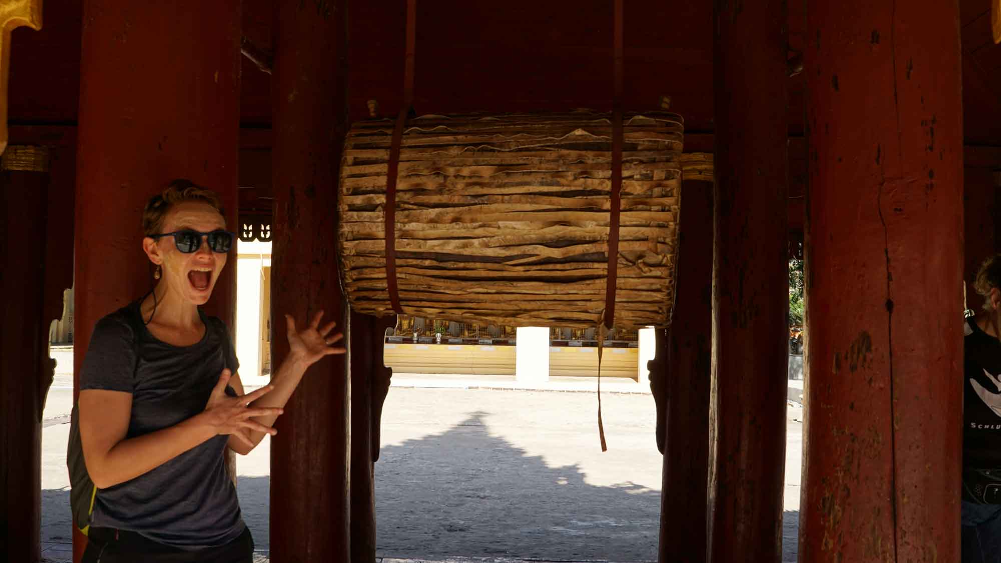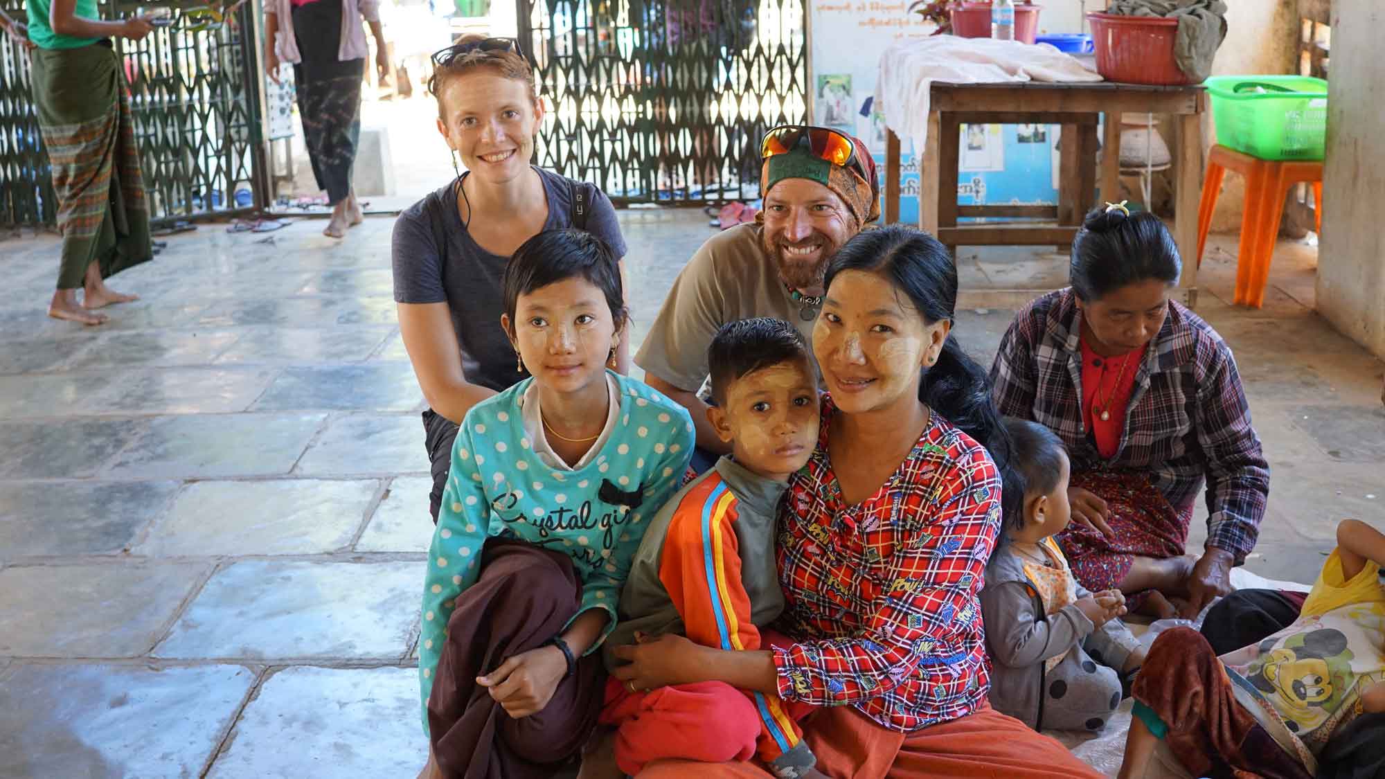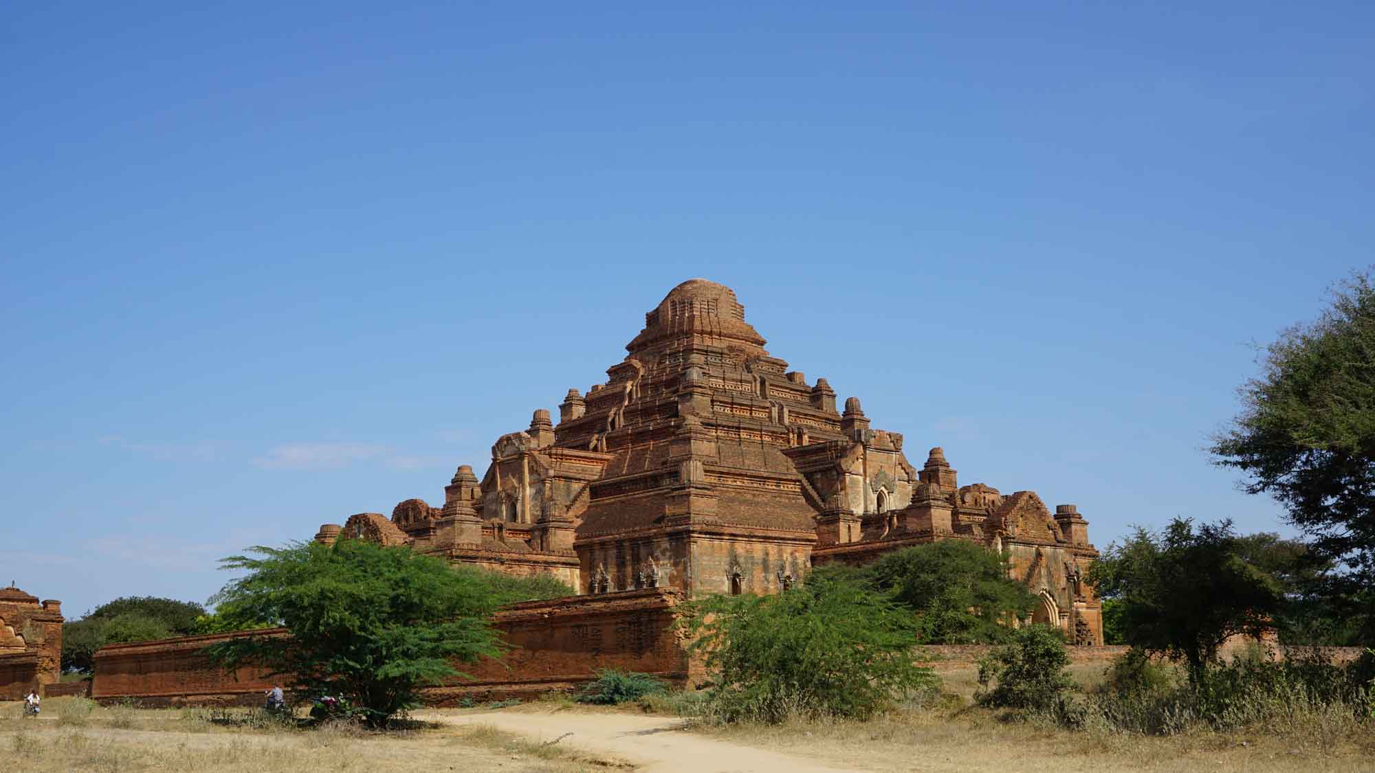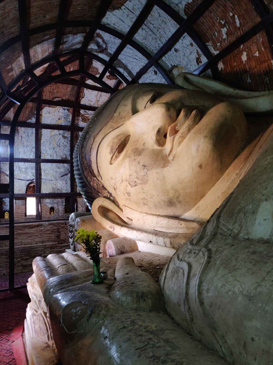 À 9h, Juan et Sara viennent nous chercher et on repart ensemble pour un marathon de temples : le Htilo Minlo et ses fresques murales antiques, le Shwe Gu Gyi qui offre un beau point de vue sur les temples au-dessus d’un océan de végétation ; puis le préféré de Camille pour la journée, la pagode Shwe San Daw, sorte d’immense pyramide entourée d’un petit jardin très mimi et surtout flanquée d’un deuxième bâtiment qui ne paye pas de mine de l’extérieur mais qui contient un « reclining buddha ». C’est un Bouddha couché : cette position représente la mort de Bouddha et le principe philosophique bouddhiste selon lequel tout a une fin (les experts du bouddhisme, dites-nous si on dit des bêtises). Celui-ci est immense, il fait dix-huit mètres de long !