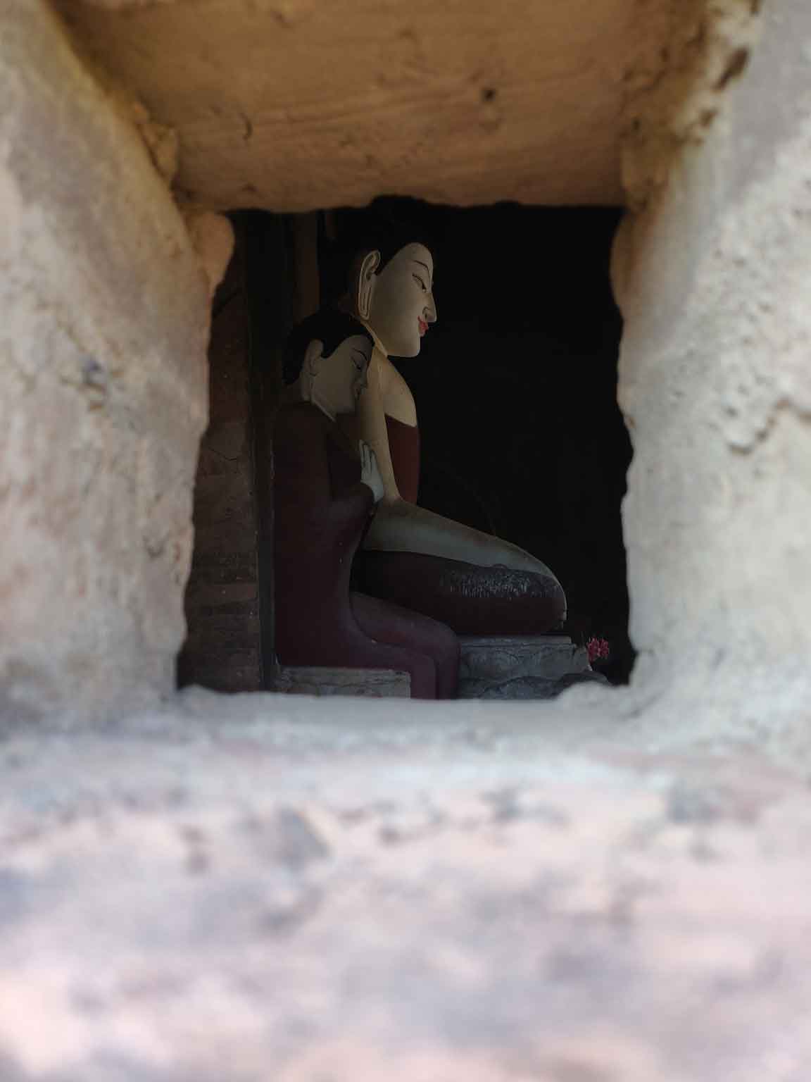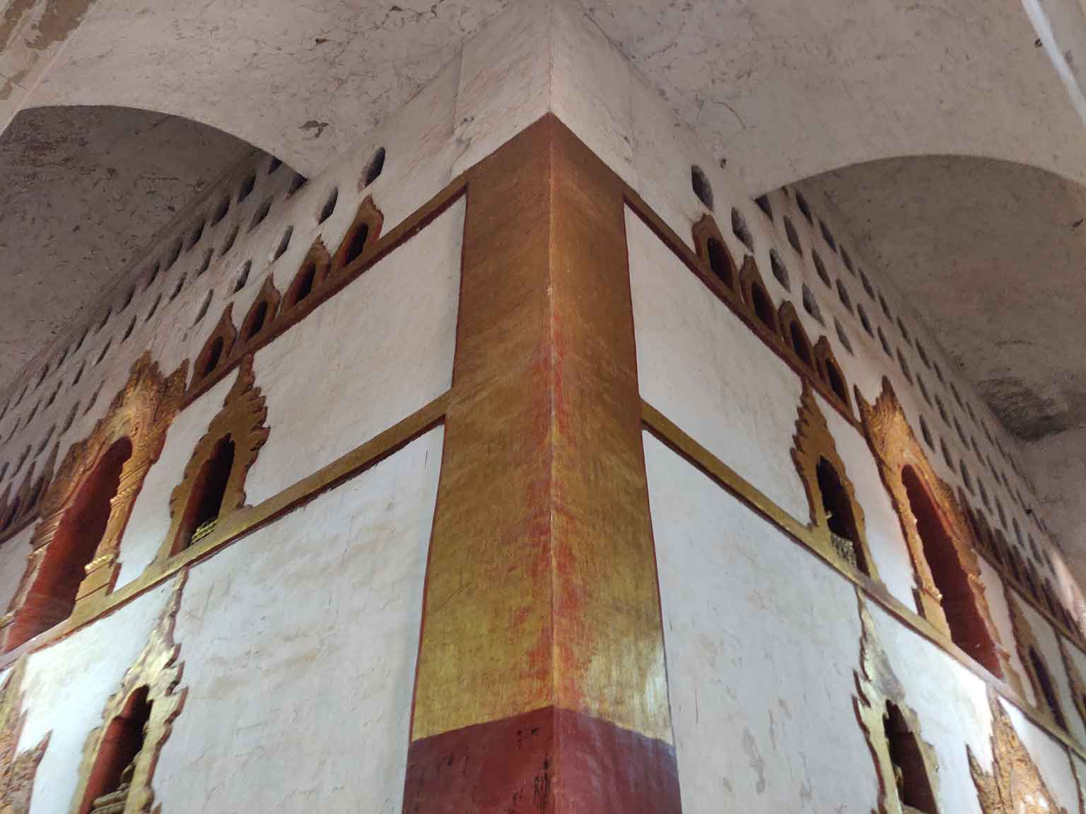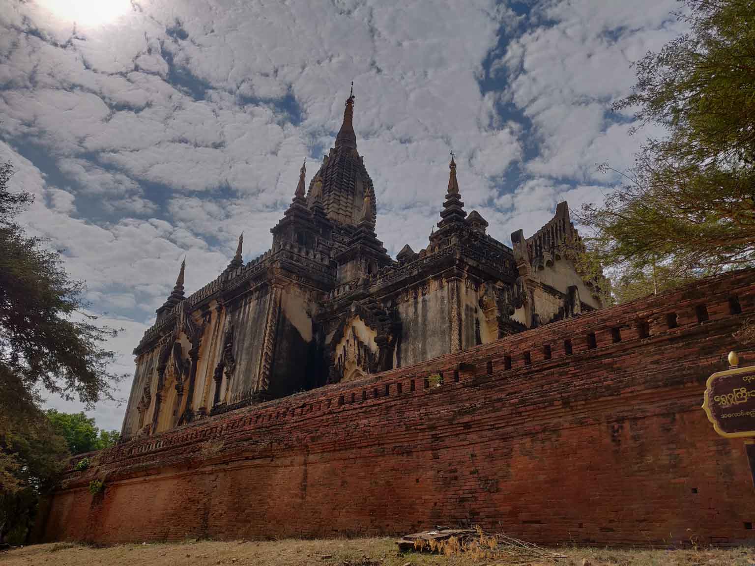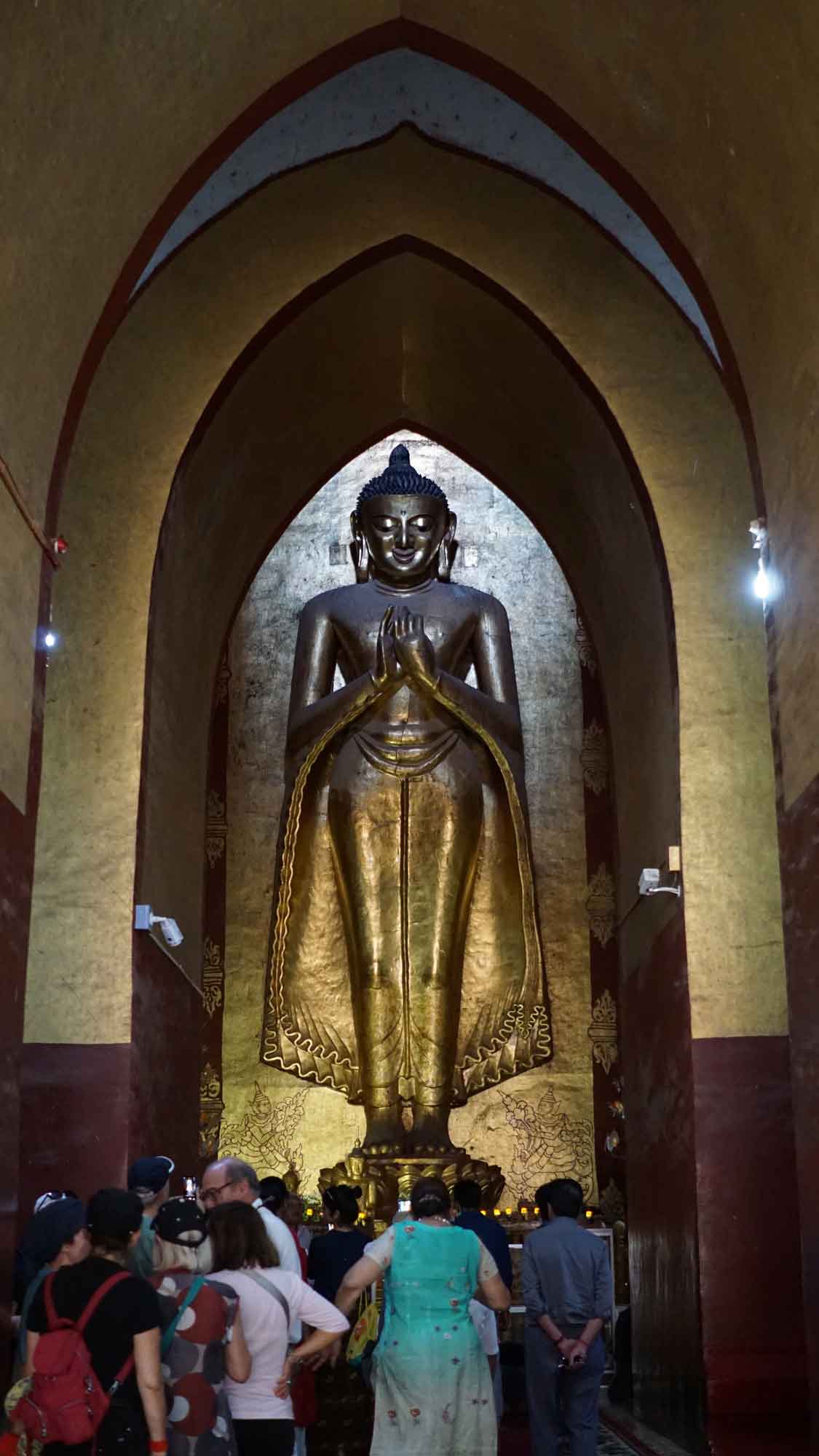 Le temple suivant est à dix minutes en e-bike en suivant la route principale : il est hors de Nyaung-U, sur le chemin de Old Bagan. Il s’agit de l’Ananda Patho, le temple Ananda, très reconnaissable avec son sommet doré à la forme différente des autres et à ses murs blancs. Comme beaucoup de temples, il possède quatre bouddhas disposés en carré, un à chaque point cardinal, avec leurs petites spécificités de position et de style ; et c’est sans compter les centaines de petits bouddhas présents dans les alcôves au sein des murs, qui donnent comme une sensation d’infini. À l’entrée est, des photos explicatives montrent le temple avant et après sa rénovation suite au gros tremblement de terre de 1975 (il y en a eu un autre depuis, en 2016).