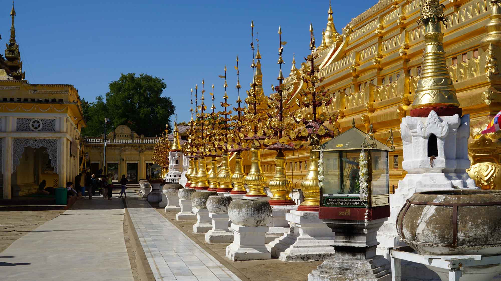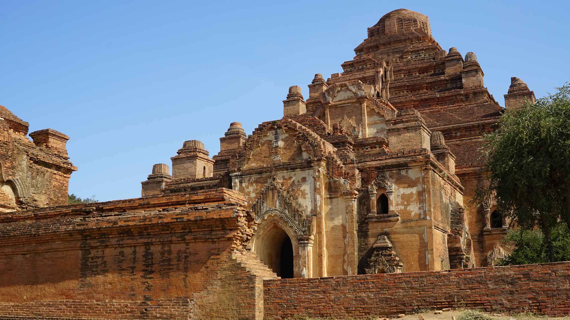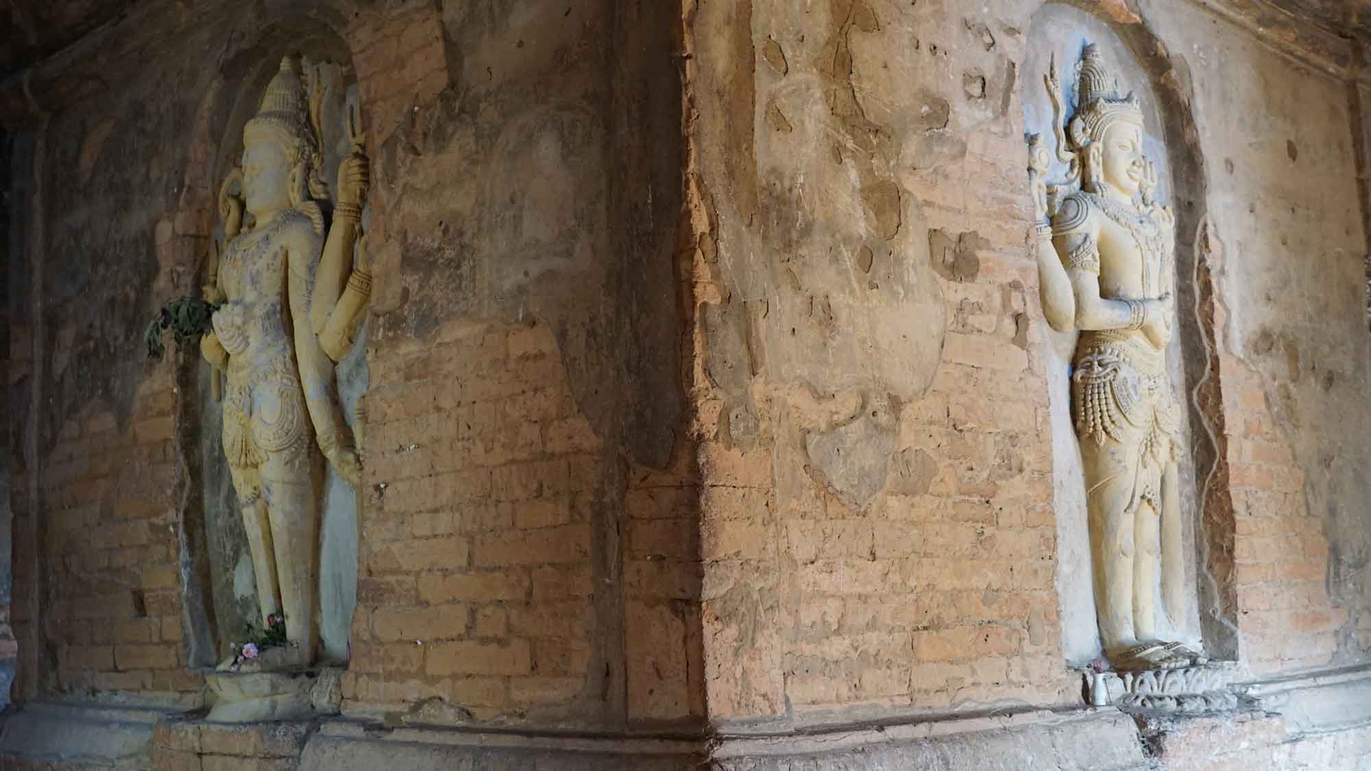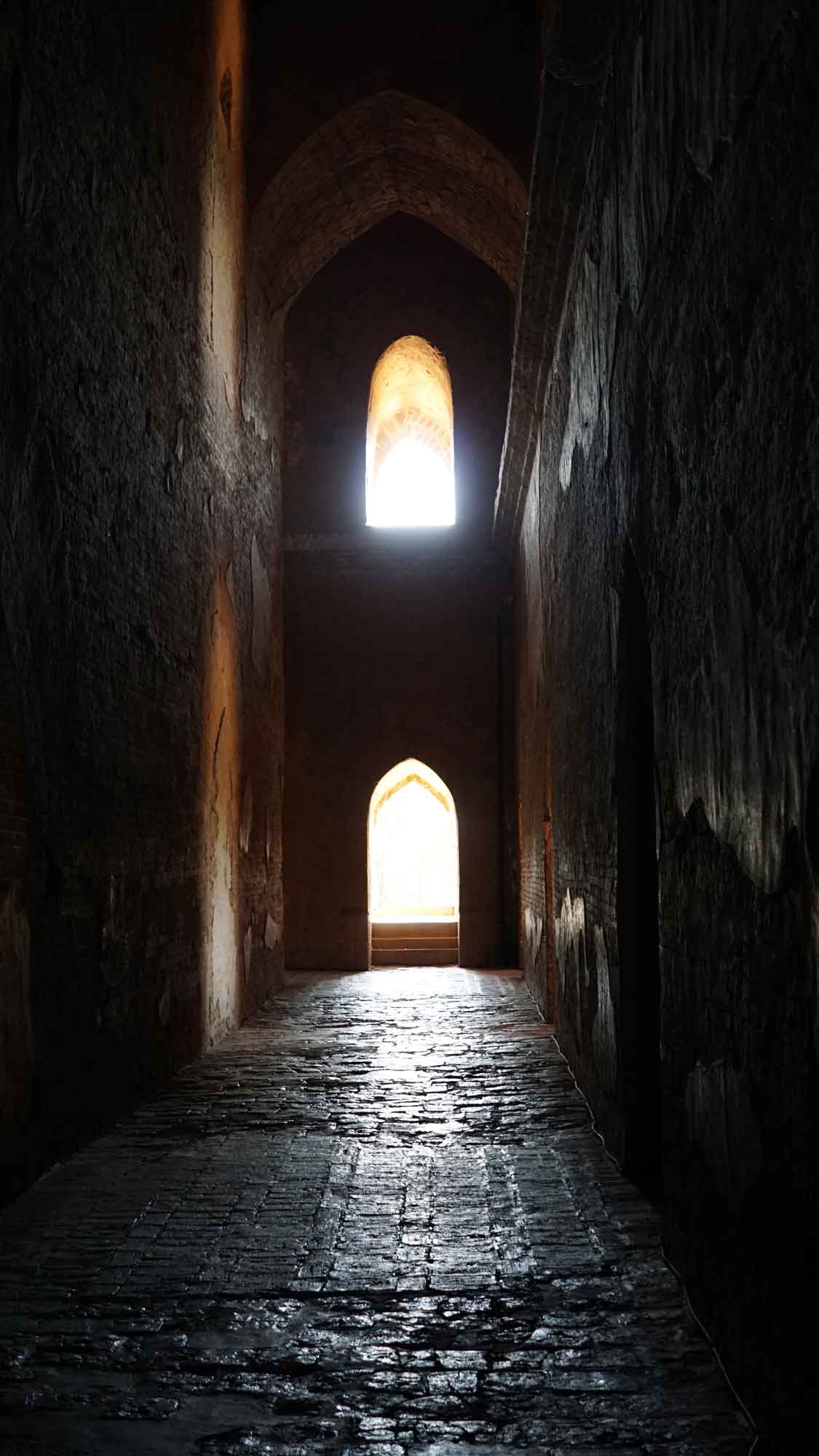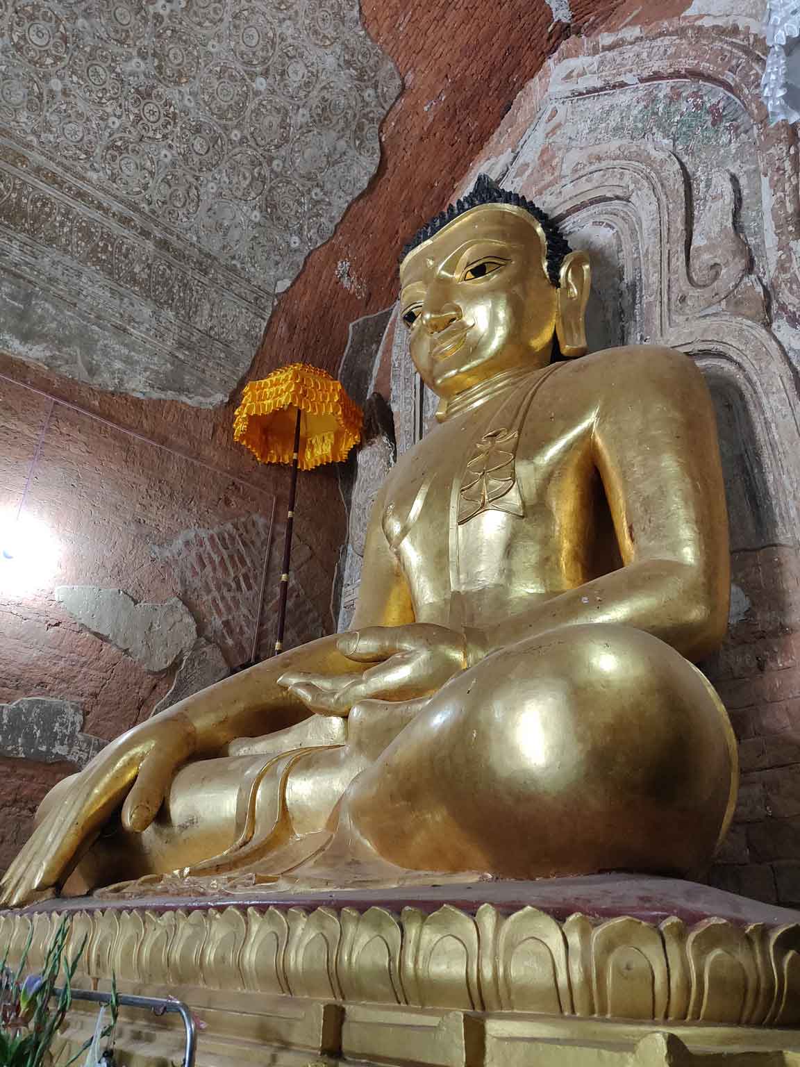 Le temple suivant est à dix minutes en e-bike en suivant la route principale : il est hors de Nyaung-U, sur le chemin de Old Bagan. Il s’agit de l’Ananda Patho, le temple Ananda, très reconnaissable avec son sommet doré à la forme différente des autres et à ses murs blancs. Comme beaucoup de temples, il possède quatre bouddhas disposés en carré, un à chaque point cardinal, avec leurs petites spécificités de position et de style ; et c’est sans compter les centaines de petits bouddhas présents dans les alcôves au sein des murs, qui donnent comme une sensation d’infini. À l’entrée est, des photos explicatives montrent le temple avant et après sa rénovation suite au gros tremblement de terre de 1975 (il y en a eu un autre depuis, en 2016).