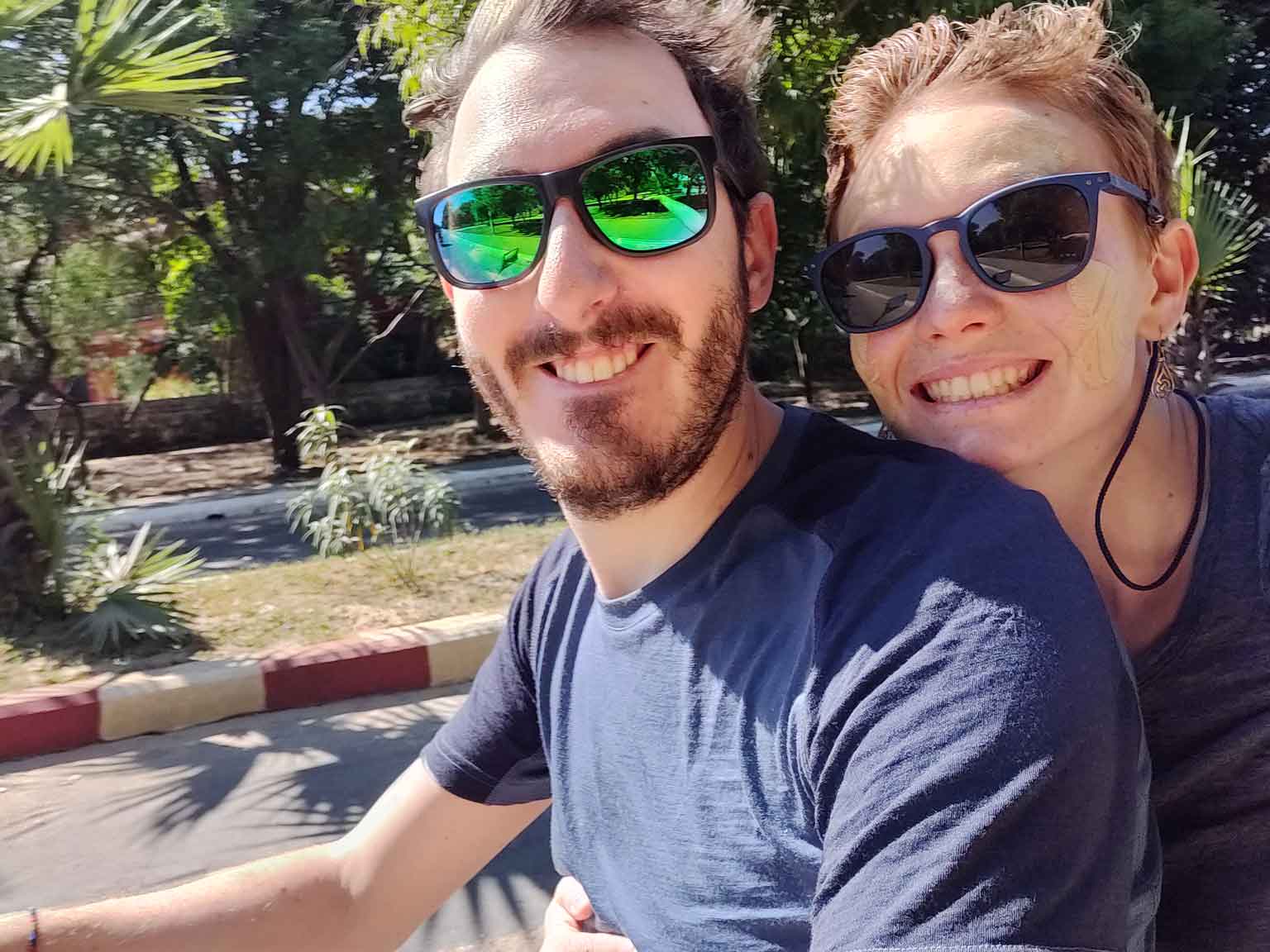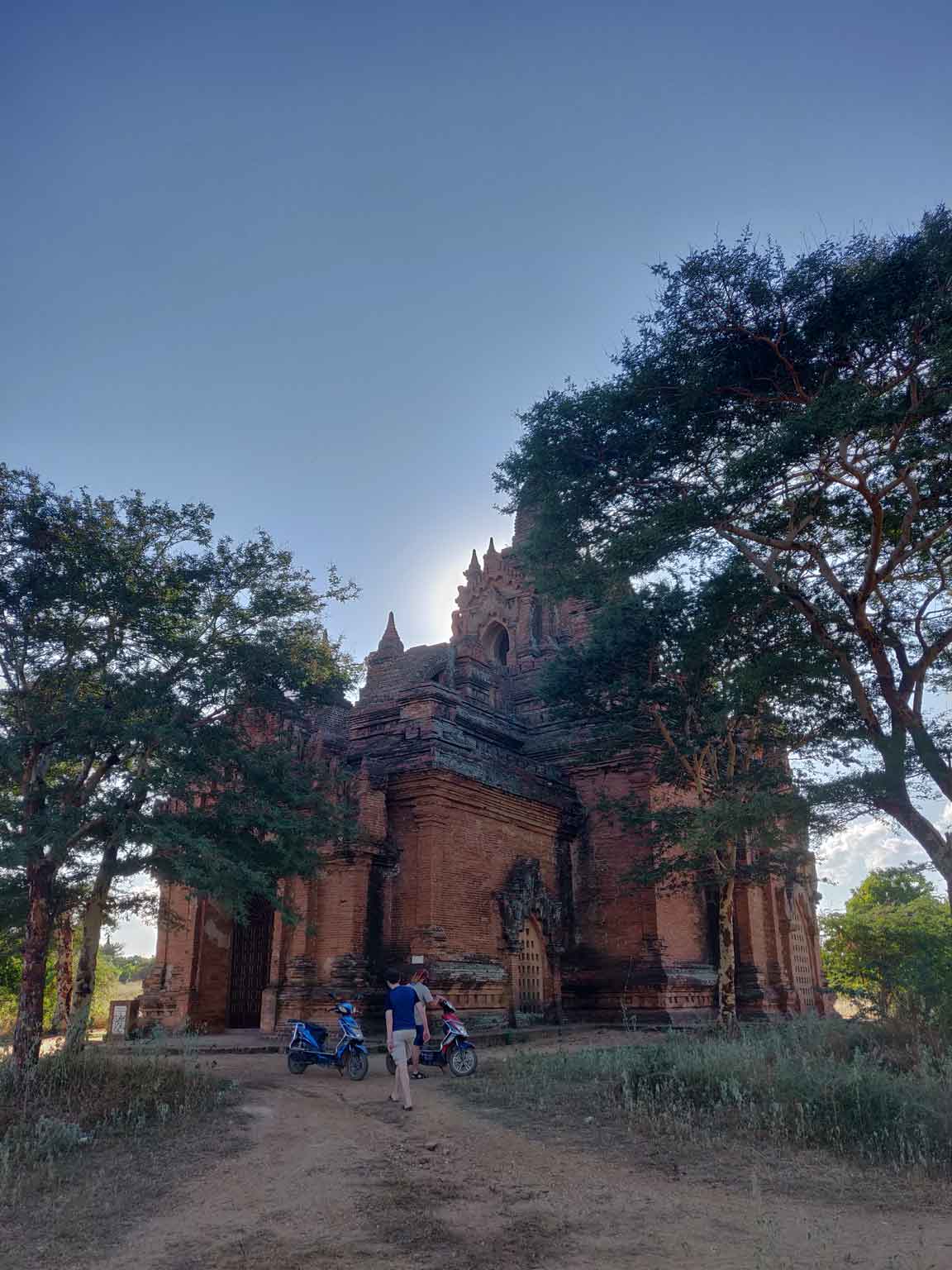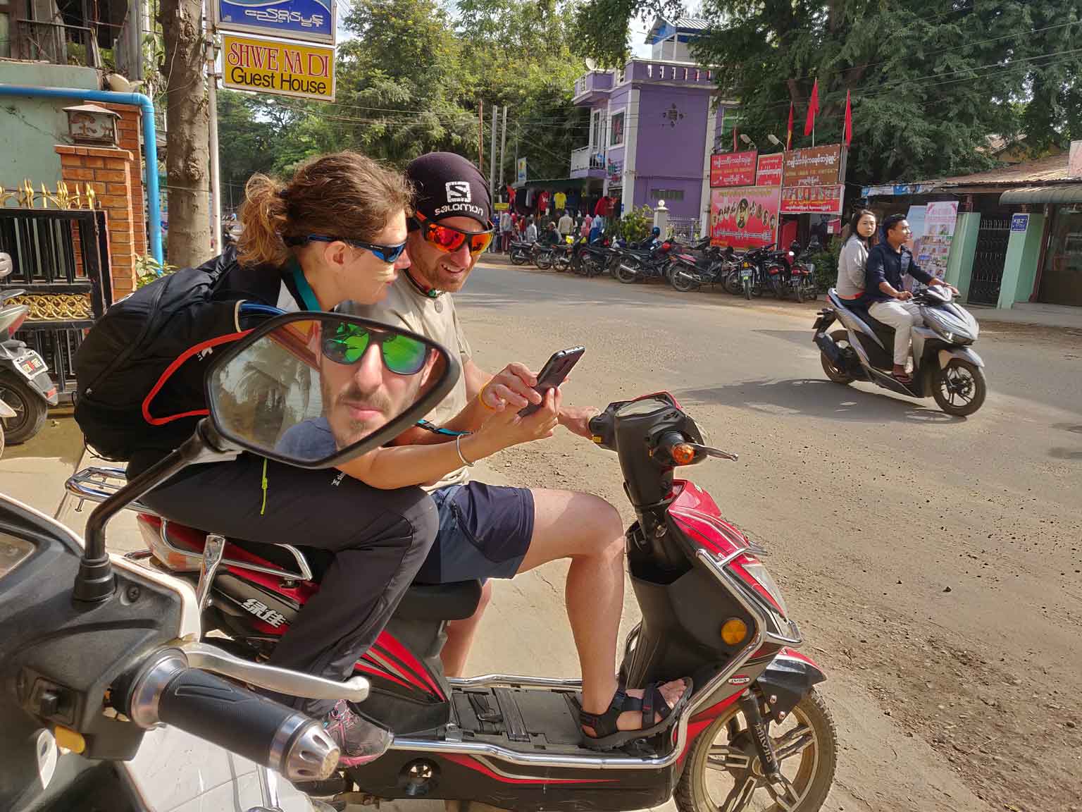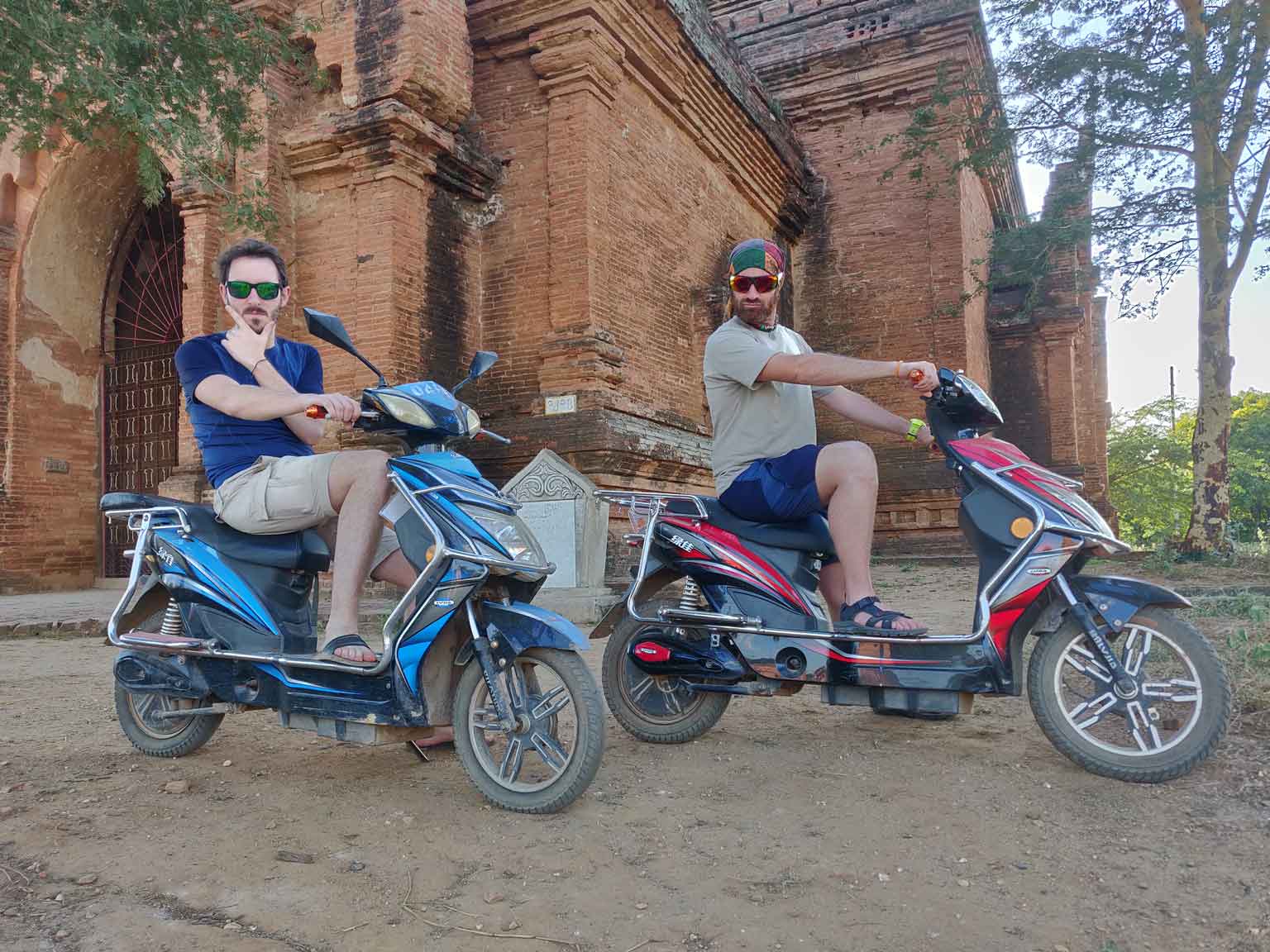 Juan et Sara nous rejoignent, et on récupère nos e-bikes ! Petite explication : la zone de Bagan se divise en trois « villes » : Old Bagan, où il n’y a que des temples et quelques hôtels de luxe ; New Bagan, d’autres temples et davantage d’habitations ; et enfin Nyaung-U, la ville où nous logeons et où les hôtels sont bien plus accessibles. Un simple vélo risque donc de ne pas suffire pour couvrir tout ce périmètre sans trop se fatiguer, à moins d’être cycliste olympique. Sauf que les scooters sont interdits aux étrangers, et que les autres options (tuk-tuk, carrioles et taxi) ne sont pas trop dans nos objectifs de prix. L’option la plus intéressante est donc le e-bike, scooter électrique pour deux personnes (trois si vous êtes des oufs). En plus ça fait pas de bruit !