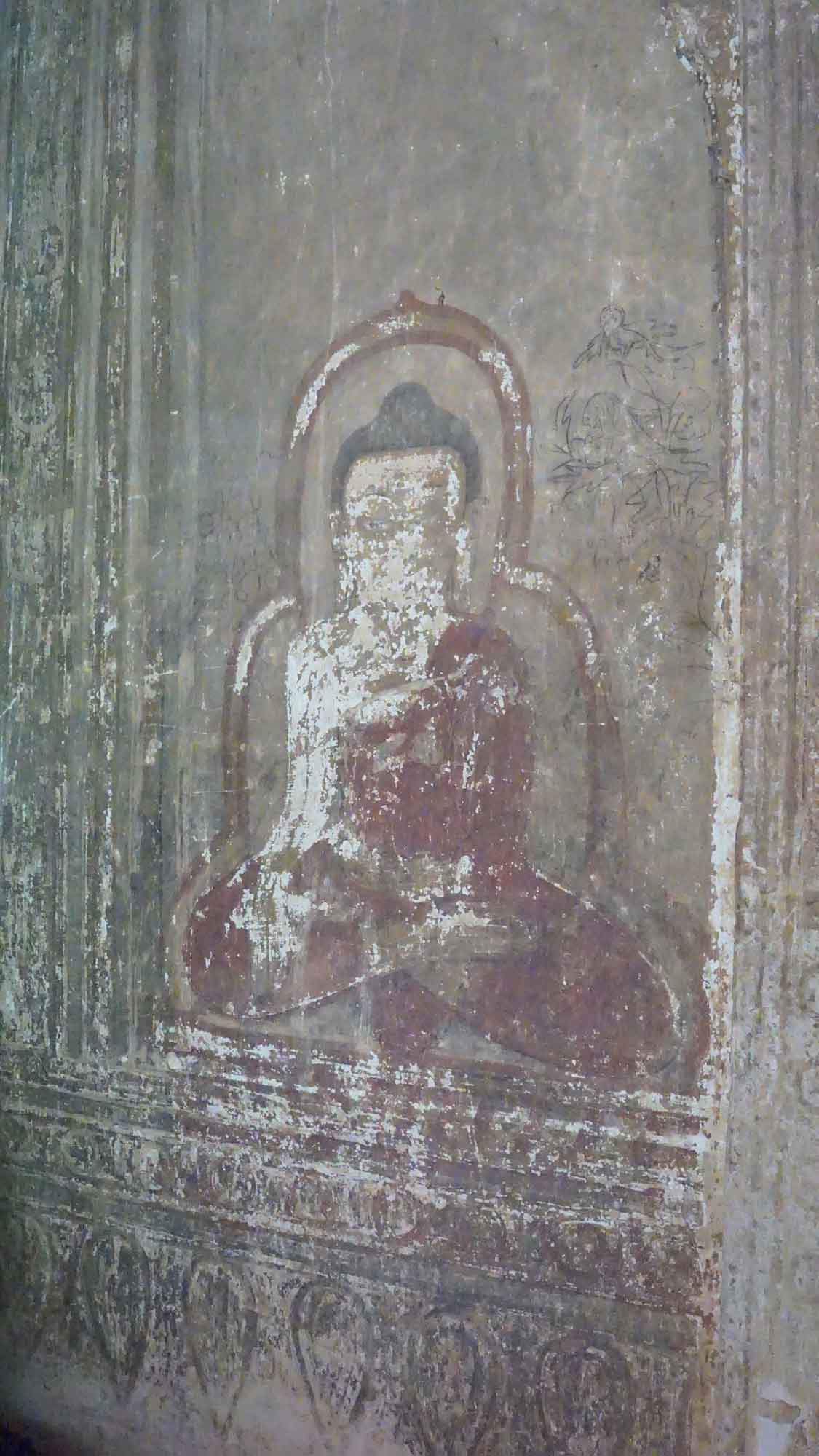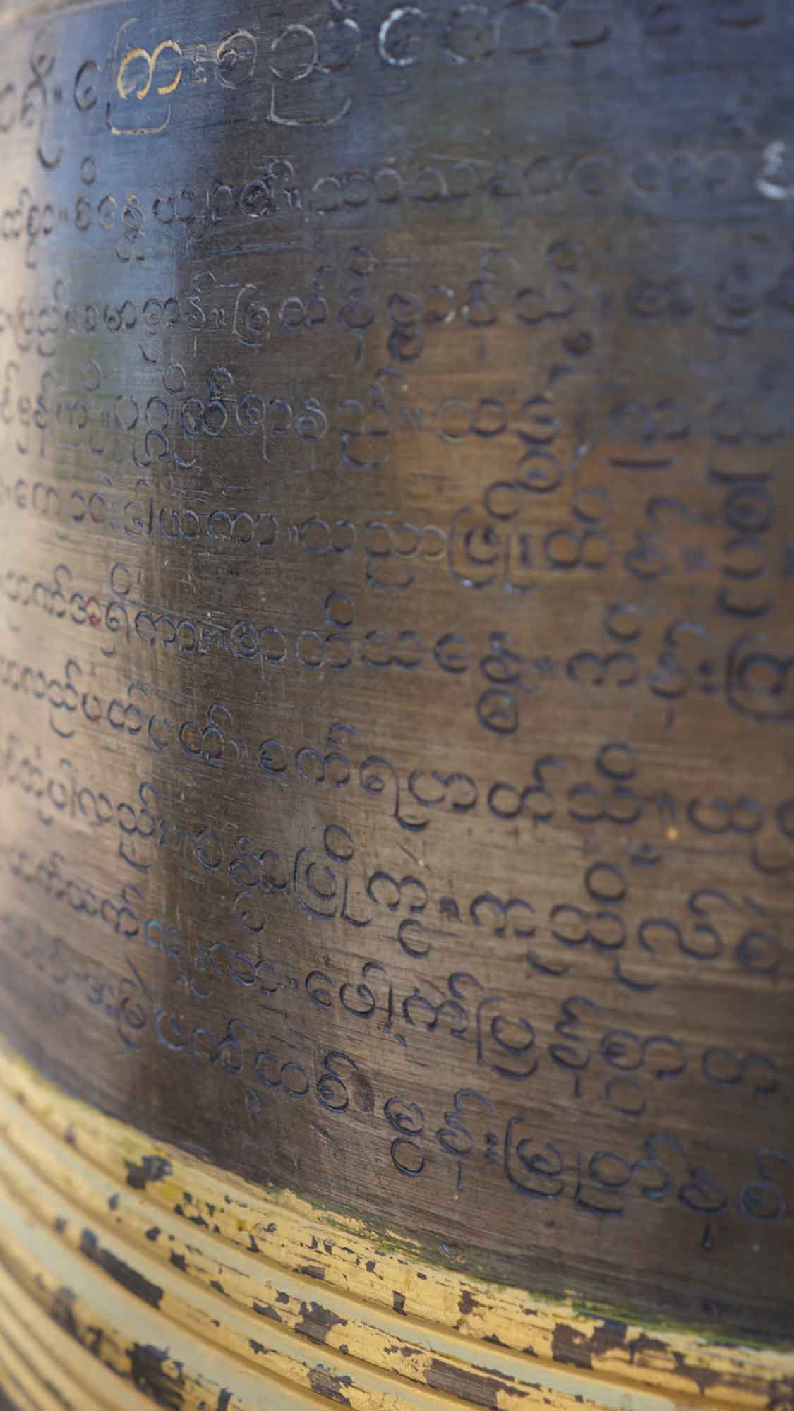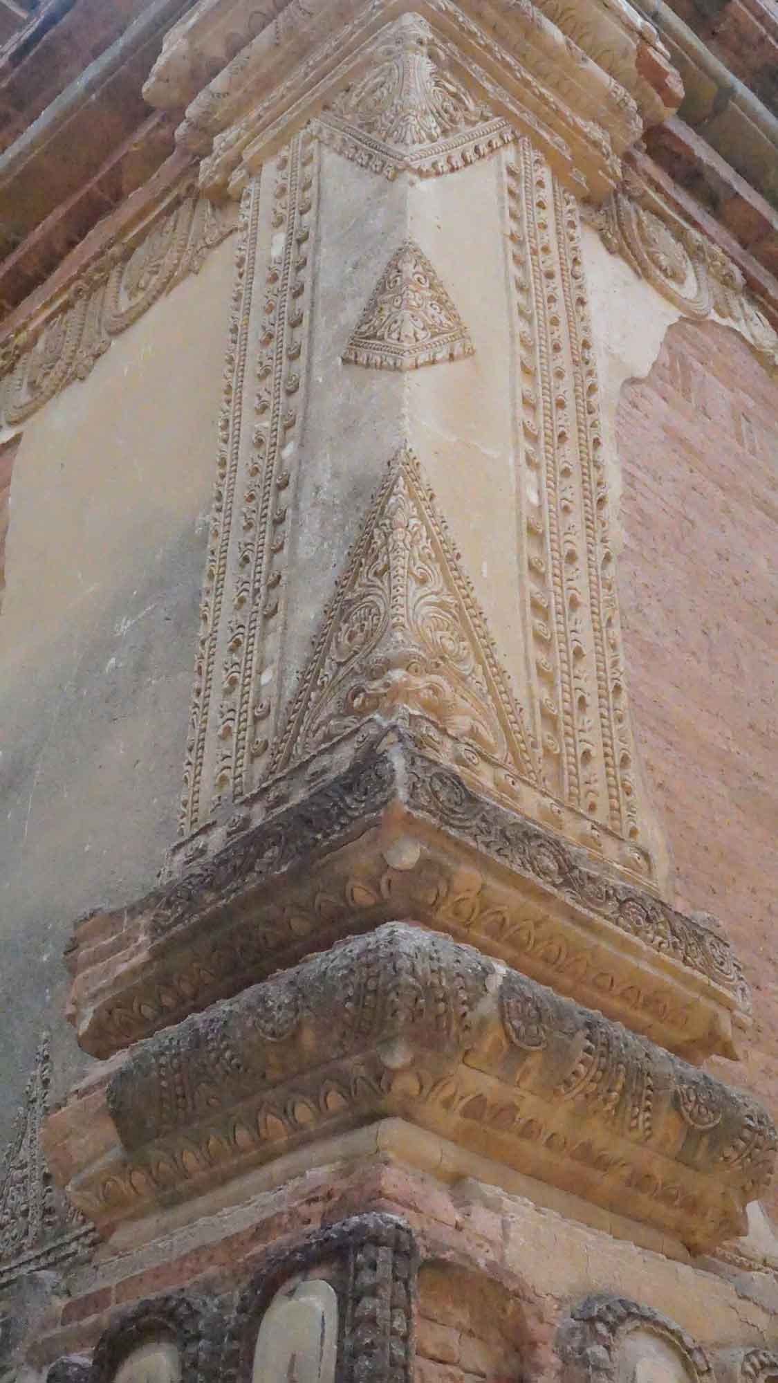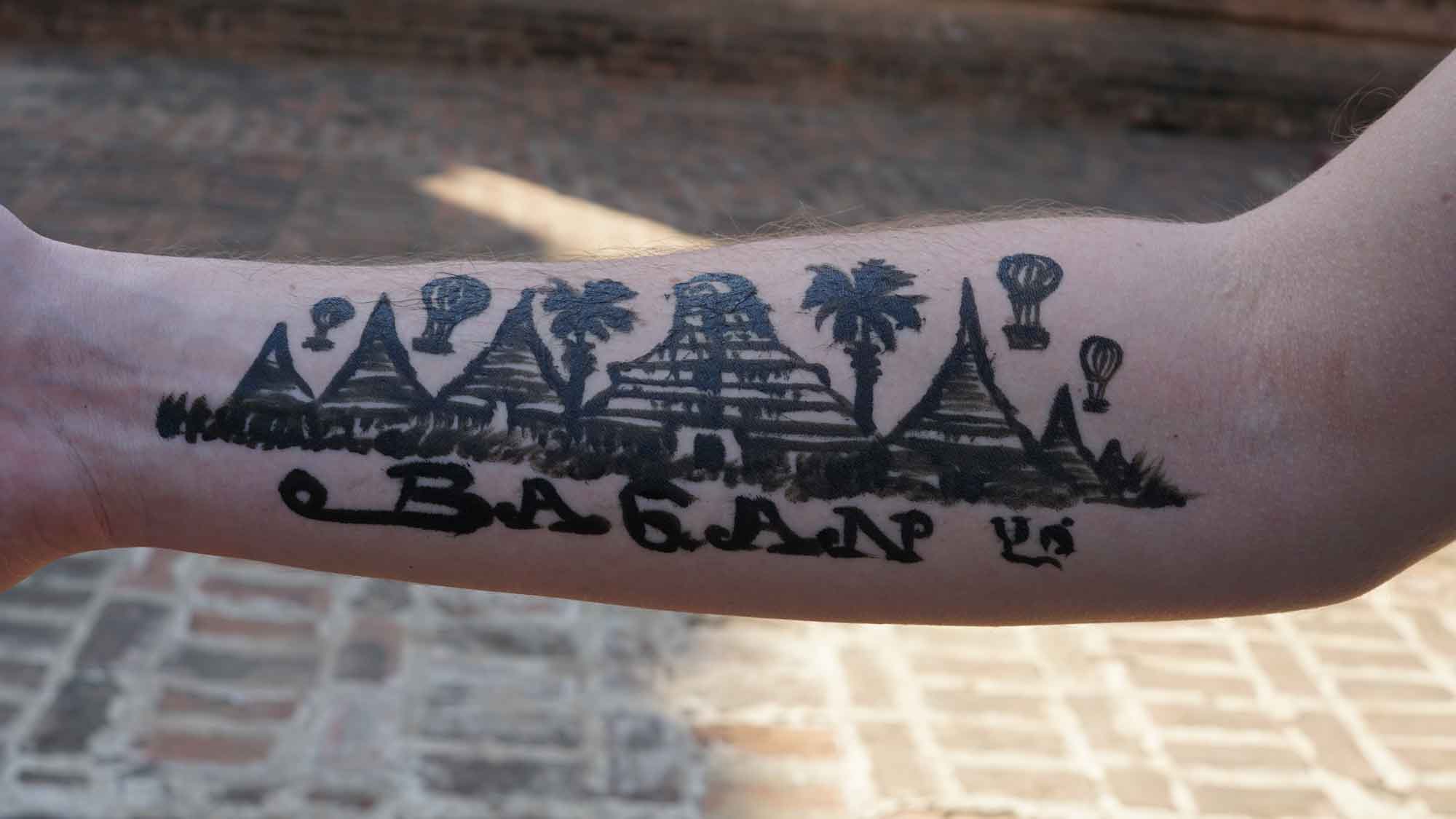 Ensuite, on roule pendant un moment sur un petit chemin bien ensablé (on va doucement pour ne pas se casser la figure, c’est pas évident) jusqu’au titanesque Dhammayangyi, la plus grosse pagode du coin. Elle est vraiment impressionnante, tant à l’extérieur que dans ses immenses couloirs intérieurs. Puis on repart vers le sud-ouest, avec le Mingalazedi puis le Mya Zedi Temple, où un vendeur très talentueux nous offre des petites esquisses qu’il réalise devant nous. Il fera même un tatouage de Bagan sur l’avant-bras de Romain, pendant que Camille qui fait le tour repère la pierre gravée de Mya Zedi, classée au patrimoine mondial de l’Unesco : c’est la plus ancienne du Myanmar (elle date de 1113) et sur chacune de ses faces est gravé un même texte dans un dialecte différent.