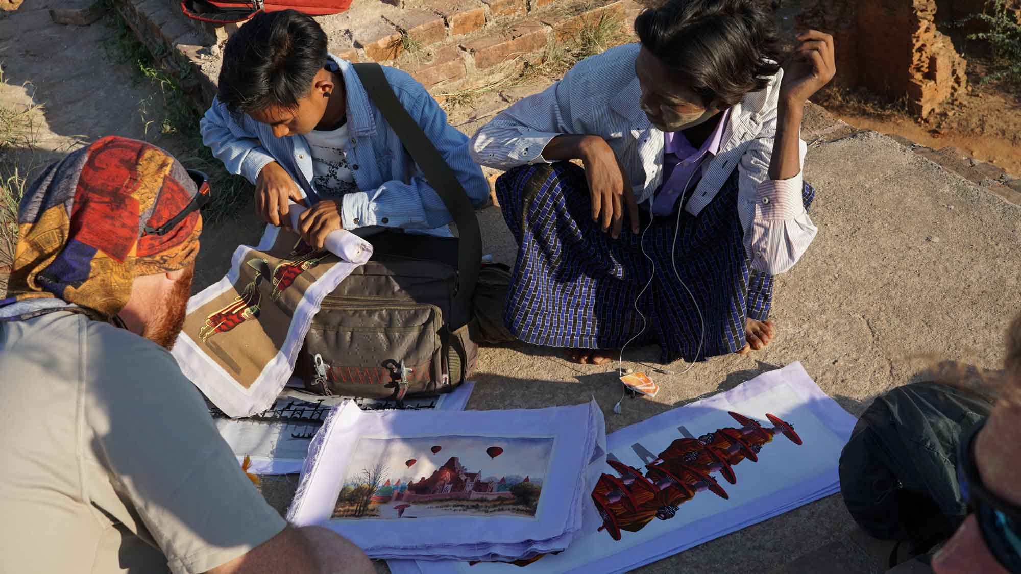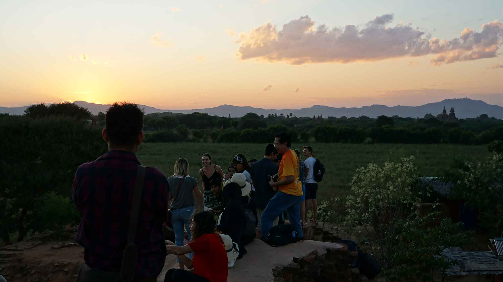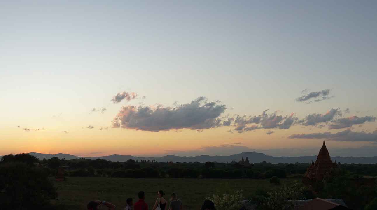 Petite pause restau le midi, Camille goûte un curry d’aubergine (elles sont vertes au Myanmar) à tomber par terre, puis on s’amuse à se perdre sur une petite route qui dévie vers le sud. La balade est belle (on est tout seuls), on s’arrête pour voir un petit temple en ruine, c’est top. En se mettant doucement en quête d’un endroit pour voir le coucher du soleil d’après les repérages de Juan, on croise deux jeunes en scooter qui nous conseillent un spot pas loin. C’est plutôt bienvenu, puisque depuis trois ans, pour des raisons de sécurité et de conservation des temples, le gouvernement a quasiment tout fermé (les touristes escaladaient n’importe comment pour aller prendre leurs photos, se mettant eux-mêmes en danger et détériorant les temples). Il ne reste que quelques emplacements autorisés. L’inconvénient, c’est qu’on n’est clairement pas tout seuls, même si on est arrivés les premiers. Ce n’est pas dramatique non plus, on voit les temples au loin se teinter de rouge vif au fur et à mesure que le soleil descend, c’est beau 🙂. Les deux jeunes se révèlent étudiants en peinture traditionnelle (peinture sur coton imprégné du sable de la rivière) et nous montrent leurs travaux. On négocie pour leur acheter deux toiles, afin d’en offrir une à Sara et Juan qui partent le surlendemain ; ils nous suivent jusqu’à l’hôtel pour qu’on récupère de la monnaie. Le trajet retour en e-bike pique un peu, il fait bien plus froid la nuit ici qu’à Mandalay ! Ensuite, soirée posée à la terrasse de l’hôtel de Sara et Juan avec de la street food.