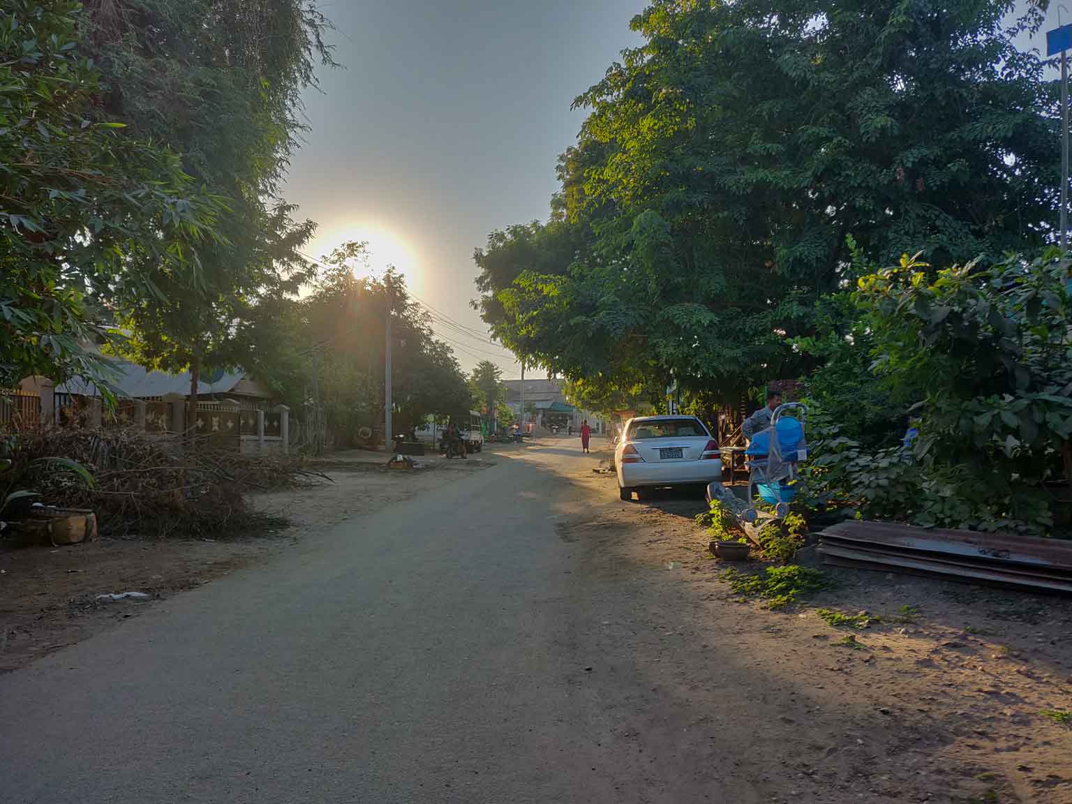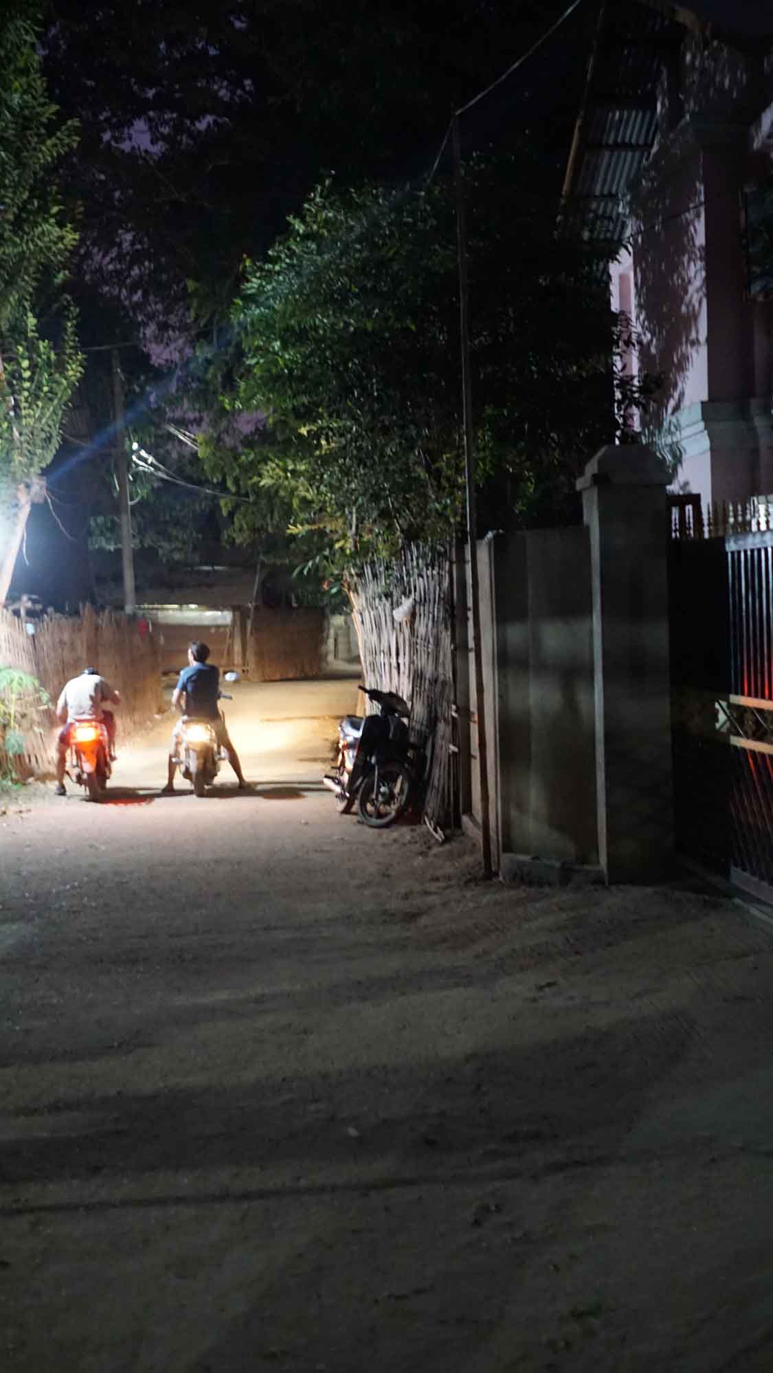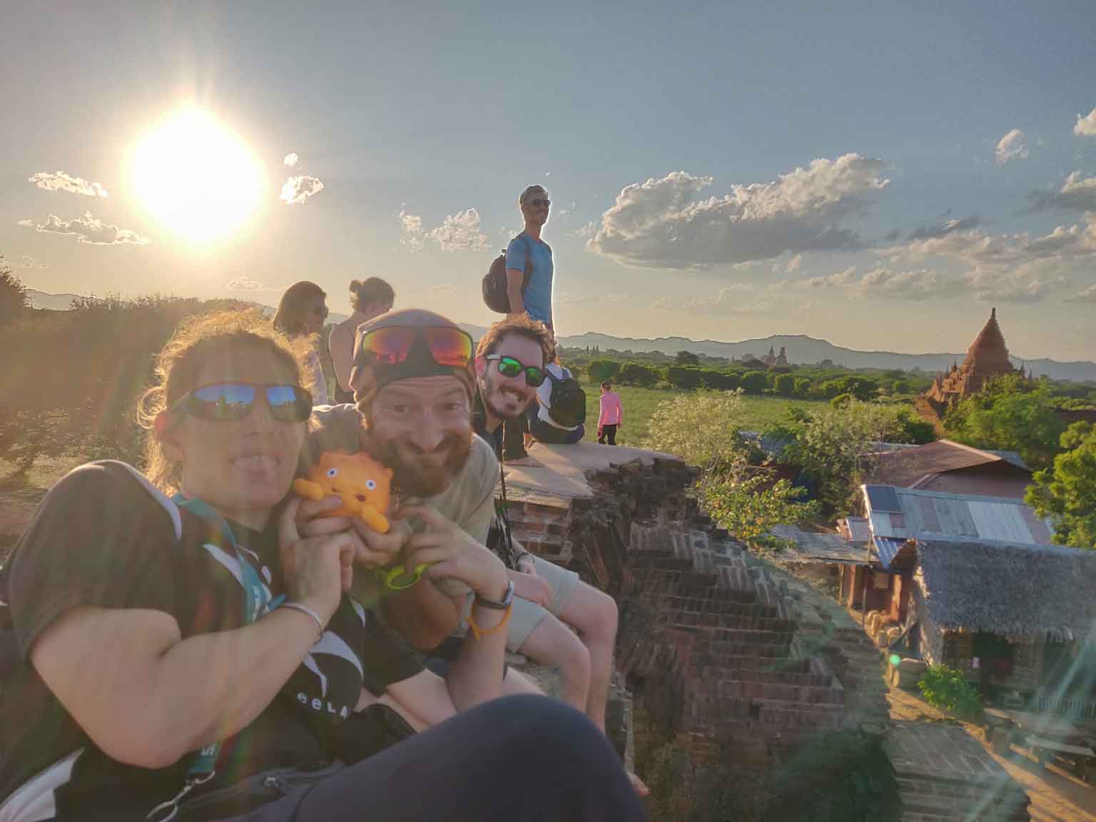 Petite pause restau le midi, Camille goûte un curry d’aubergine (elles sont vertes au Myanmar) à tomber par terre, puis on s’amuse à se perdre sur une petite route qui dévie vers le sud. La balade est belle (on est tout seuls), on s’arrête pour voir un petit temple en ruine, c’est top. En se mettant doucement en quête d’un endroit pour voir le coucher du soleil d’après les repérages de Juan, on croise deux jeunes en scooter qui nous conseillent un spot pas loin. C’est plutôt bienvenu, puisque depuis trois ans, pour des raisons de sécurité et de conservation des temples, le gouvernement a quasiment tout fermé (les touristes escaladaient n’importe comment pour aller prendre leurs photos, se mettant eux-mêmes en danger et détériorant les temples). Il ne reste que quelques emplacements autorisés. L’inconvénient, c’est qu’on n’est clairement pas tout seuls, même si on est arrivés les premiers. Ce n’est pas dramatique non plus, on voit les temples au loin se teinter de rouge vif au fur et à mesure que le soleil descend, c’est beau 🙂. Les deux jeunes se révèlent étudiants en peinture traditionnelle (peinture sur coton imprégné du sable de la rivière) et nous montrent leurs travaux. On négocie pour leur acheter deux toiles, afin d’en offrir une à Sara et Juan qui partent le surlendemain ; ils nous suivent jusqu’à l’hôtel pour qu’on récupère de la monnaie. Le trajet retour en e-bike pique un peu, il fait bien plus froid la nuit ici qu’à Mandalay ! Ensuite, soirée posée à la terrasse de l’hôtel de Sara et Juan avec de la street food.