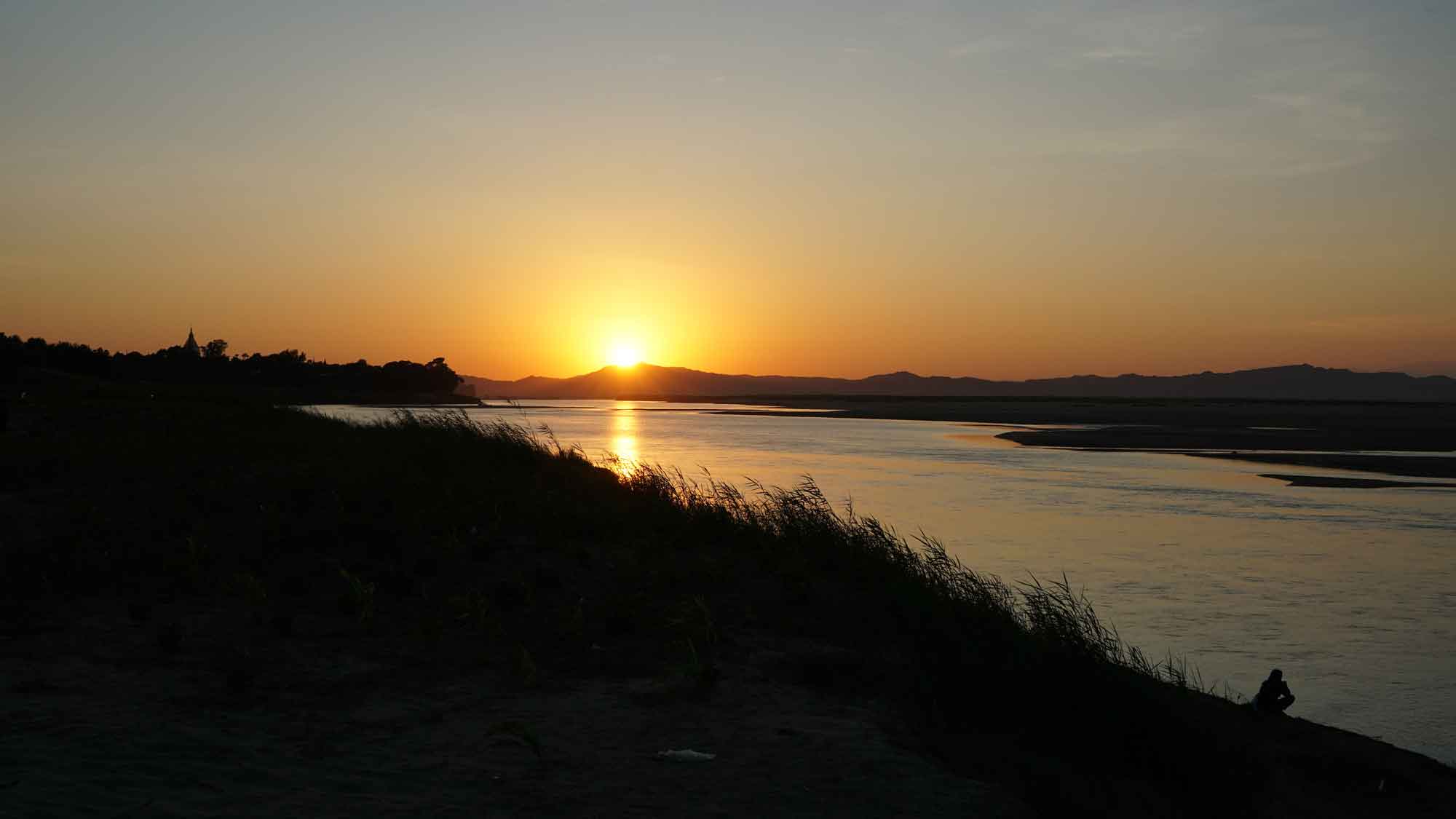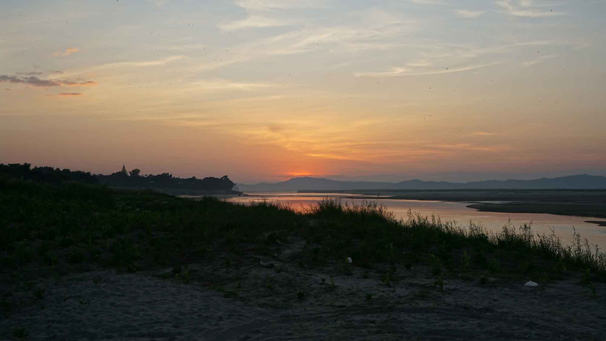Le dernier jour, on avait prévu de peut-être sortir l’après-midi, mais c’est un échec ; on est tout pâteux, et on reste à l’hôtel pour s’occuper des préparatifs du départ le lendemain vers Kalaw (réserver le bus et faire les sacs) et finir l’article du blog (on est en retard !). On sort juste en fin d’après-midi pour faire un tour à pied dans Nyaung-U, loin de la rue centrale et des hôtels. On croise les habitants du coin, les enfants qui jouent et sortent de l’école, les grands-mères qui nous font des grands sourires quand on leur dit « Mingalabar »… C’est tout paisible, ça fait du bien. Un ultime coucher de soleil sur la rivière (on ne s’en lasse pas !) et retour à l’hôtel pour la dernière nuit.