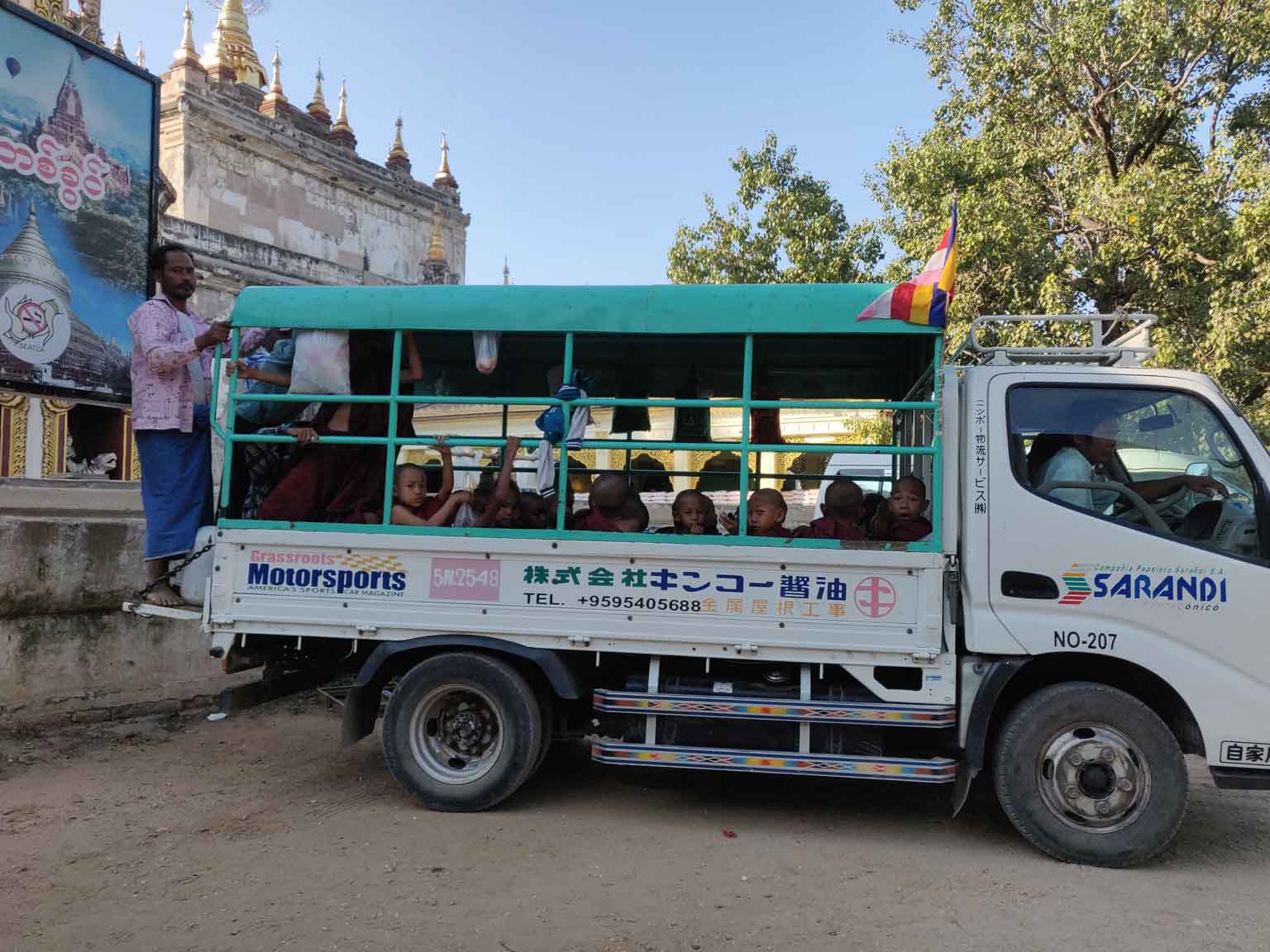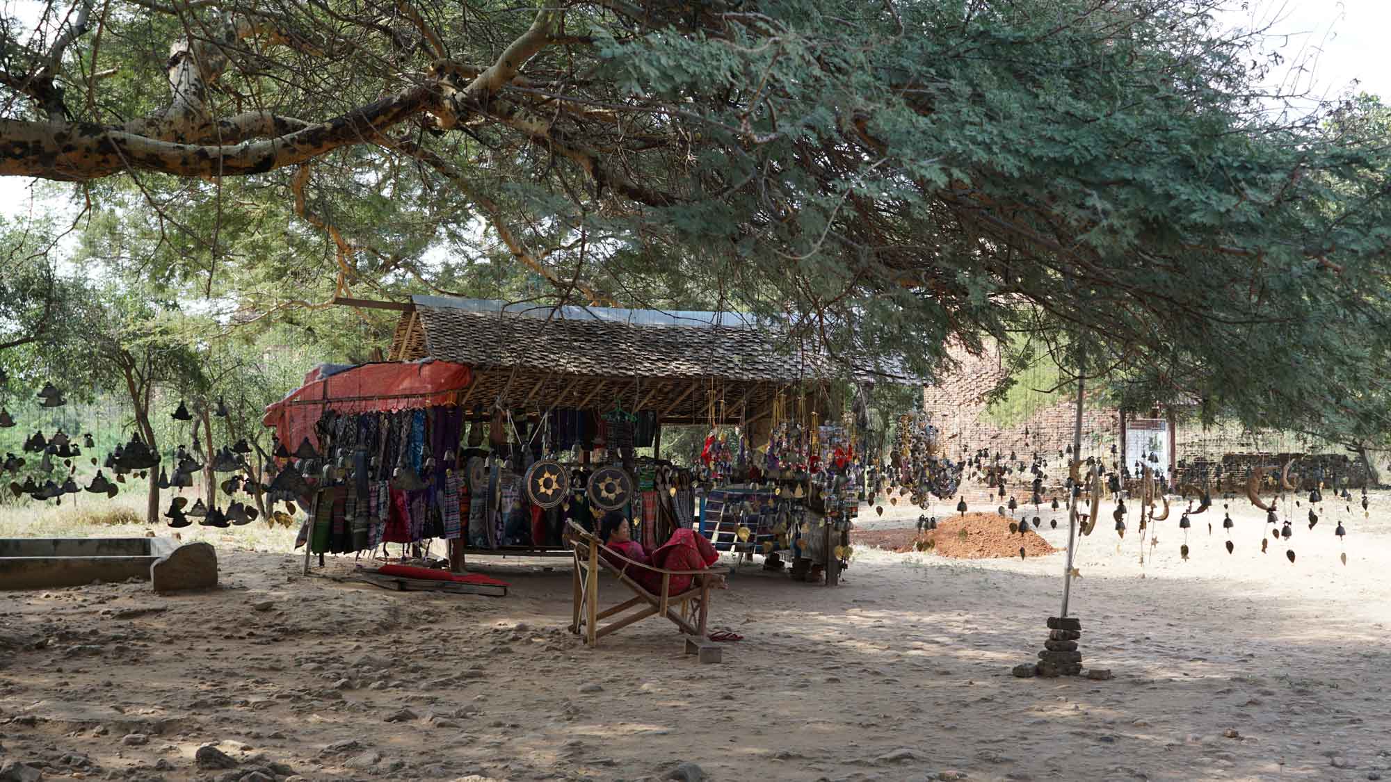Ensuite, on passe voir une curiosité de Bagan, le Nat Hlaung Kyaung : c’est le seul temple hindou parmi tous les temples bouddhistes du site. Dehors, les vendeurs ont accroché une myriade de petites clochettes au branches des arbres qui tintent doucement avec le vent, c’est très beau… Une dame nous accoste quand on arrive et nous fait la visite guidée en français avec un bon petit accent birman ; c’est en fait une des vendeuses de devant et elle applique la technique d’ici pour arriver à convaincre les touristes d’acheter quelques chose en sortant. On refuse au départ, mais finalement Romain repère un mini-drapeau birman à coudre sur un sac, comme on avait prévu d’en acheter ; donc tout le monde finit content. 😀