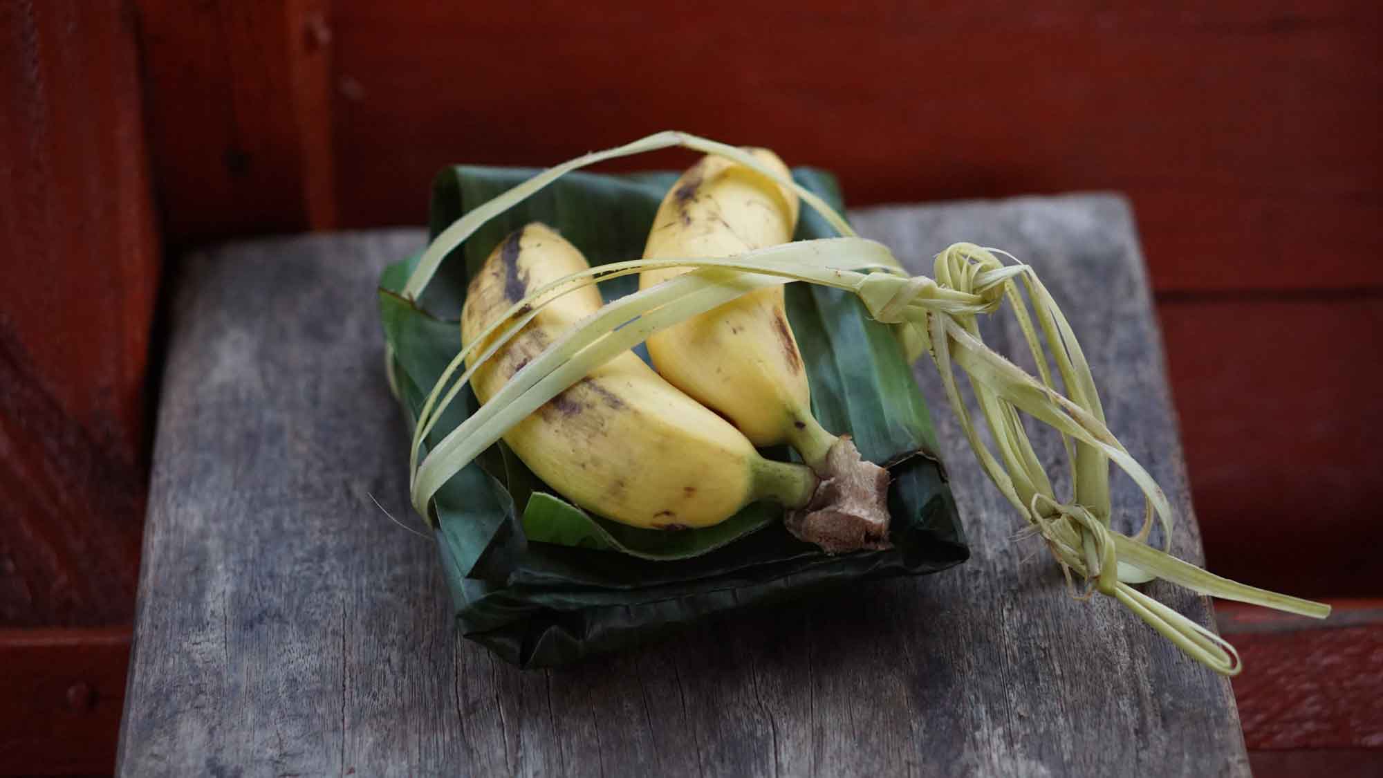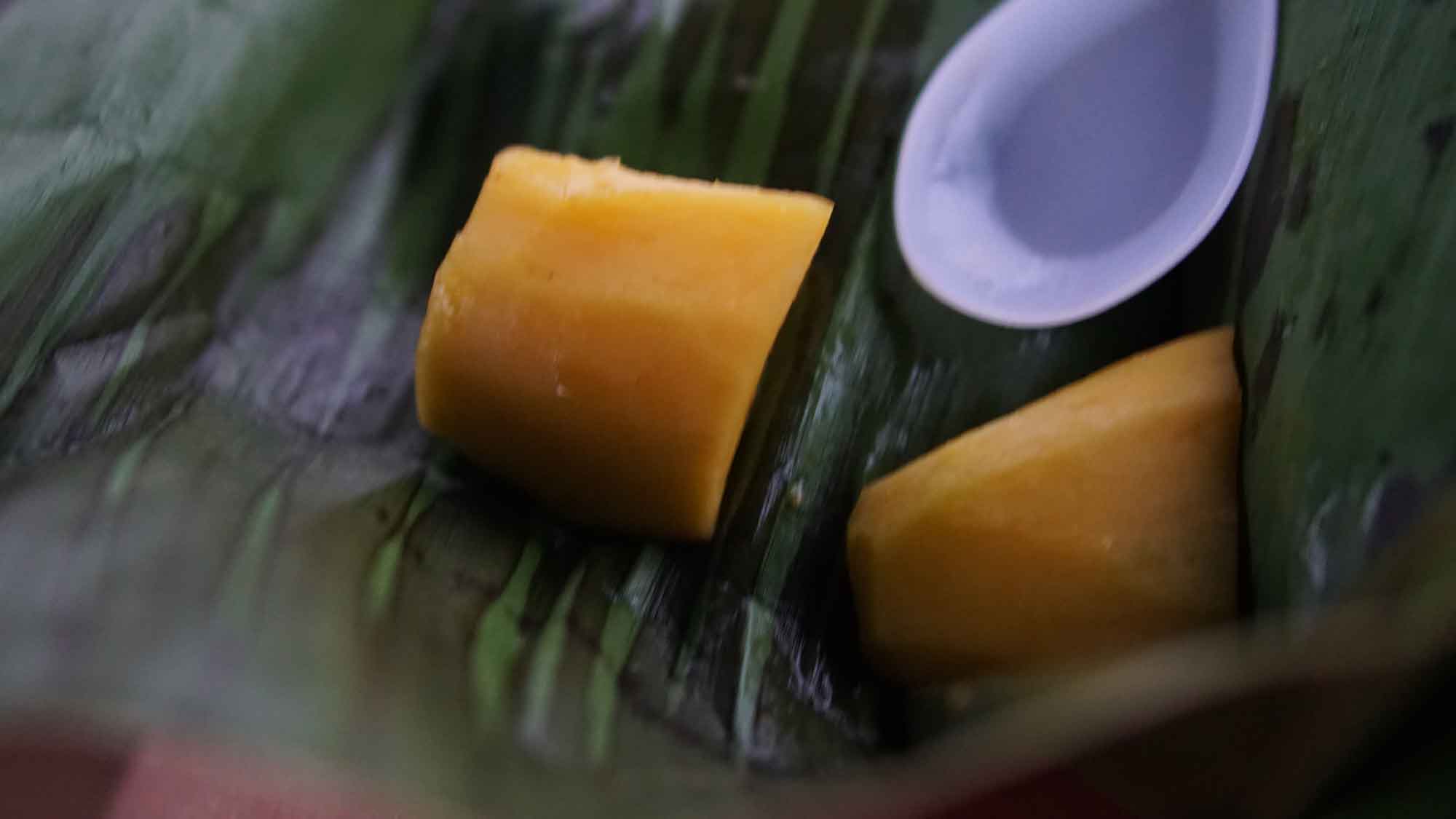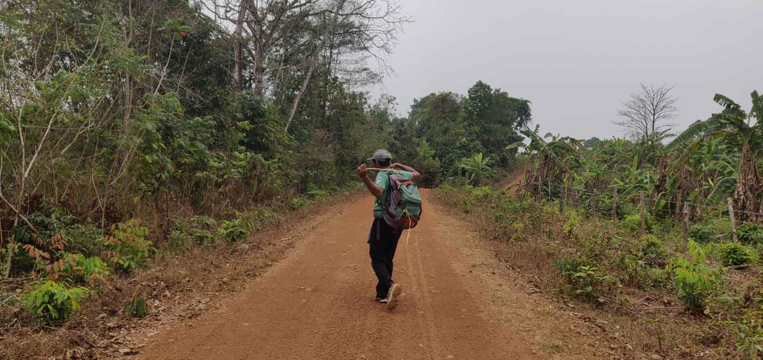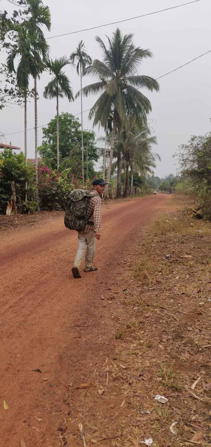 On démarre à 5h20 avec rendez-vous au Community Center pour récupérer les sacs à dos qu’on nous prête, contenant nos hamacs à moustiquaire intégrée et une couverture pour la nuit. On avait hésité à utiliser nos propres sacs à dos, et au final on aurait probablement mieux fait, mais ils n’étaient quand même pas mal 🙂. On nous a aussi remis notre petit déjeuner (un délice de pancakes et bananes avec des morceaux de mangue, le tout savamment empaqueté dans des feuilles de bananier 🥰), puis on part tous les trois avec notre guide Kim et le cuisinier Sowann.