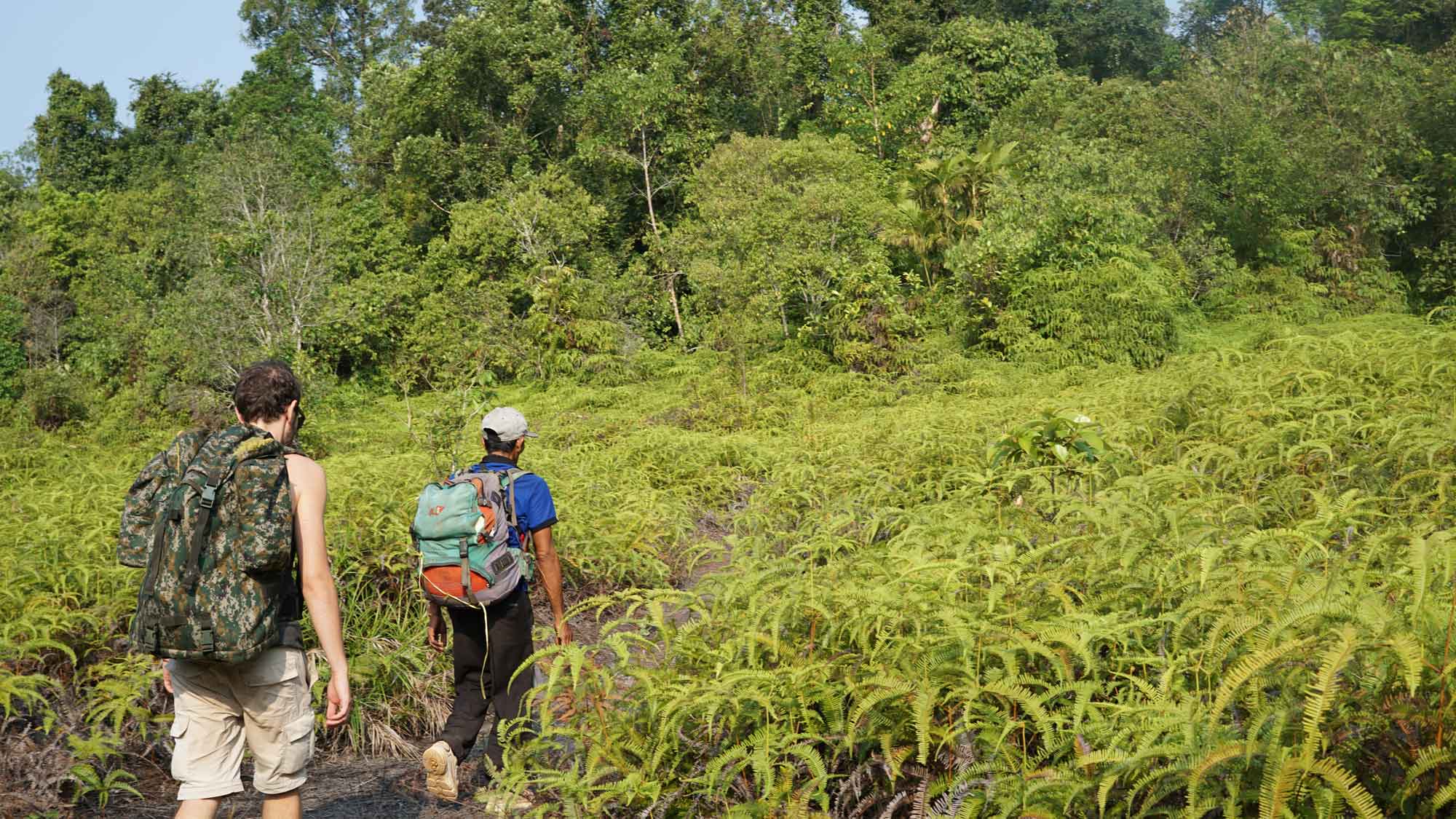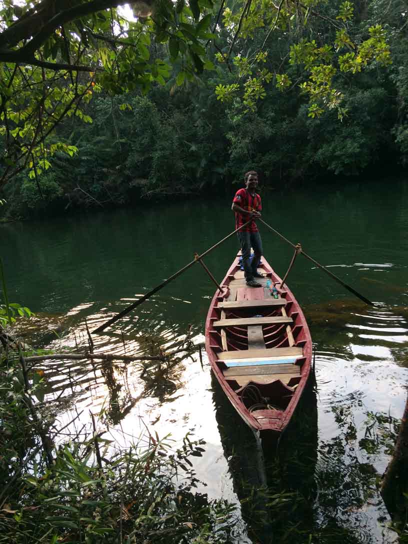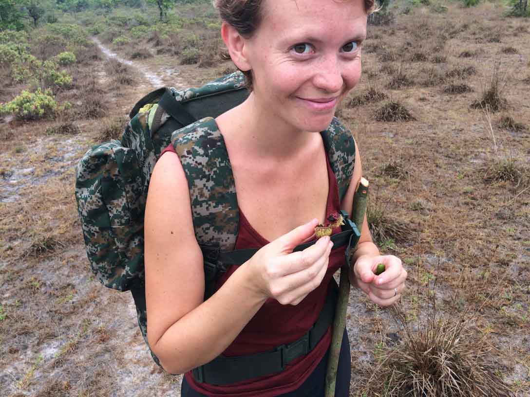 Sowann et lui nous montrent les différentes variétés d’arbres, nous font boire l’eau d’une liane, nous expliquent comment la sève du « coki », qu’une flamme ramollit, sert à isoler la coque des bateaux, et dégagent parfois le chemin à coup de machette (bien affûtée, ça rigole pas). Ils nous confectionnent en deux temps trois mouvements des bâtons de marche qu’on sera bien contents d’avoir tout au long du chemin, et qui seront l’occasion de bien rire de Camille qui oublie systématiquement le sien à chaque pause… 😅
