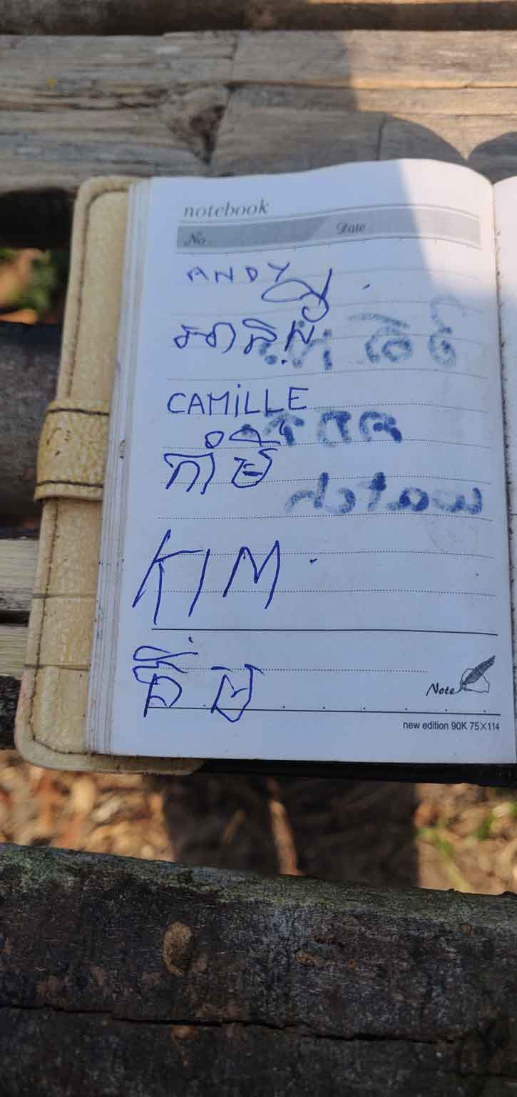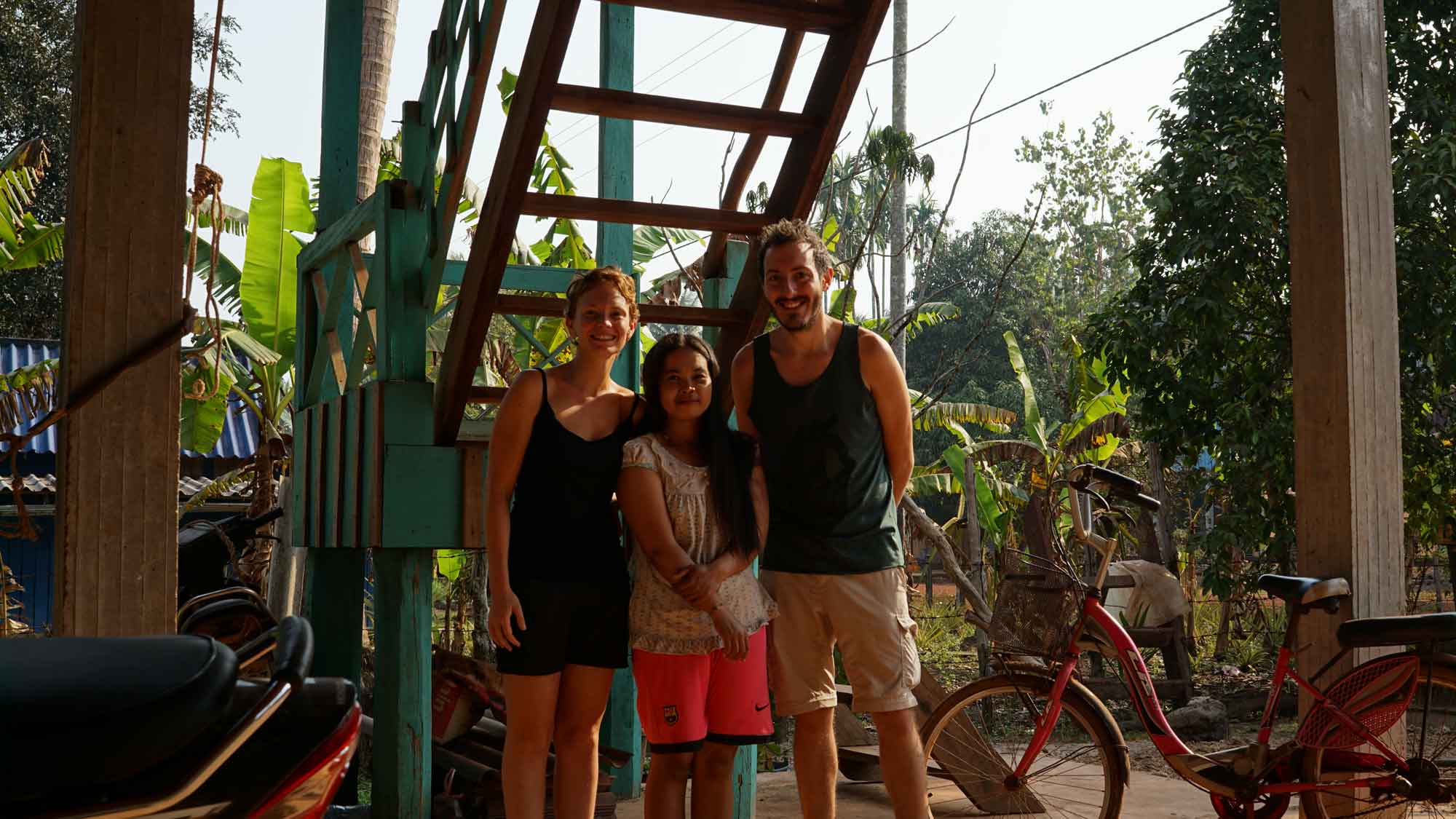 C’est assez drôle de chercher comment jouer ensemble quand on ne parle pas la même langue, les seuls mots de khmer que Camille connaissait étant « Sosdai — bonjour », « Sorkoun — merci » et les chiffres jusqu’à cinq « moey, pey, Baï, bun, prahm ». La maman Srai Phoah en revanche parlait plutôt bien anglais, et on a beaucoup aimé discuter ensemble, des enfants, de ses études, de son mari et sa mère partis loin à leur ferme pour la mise-bas d’une des vaches… On a aussi beaucoup mangé avec eux, et c’était vraiment chouette, on s’est beaucoup attachés.