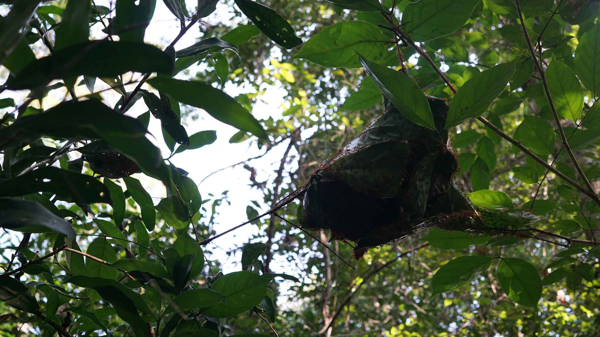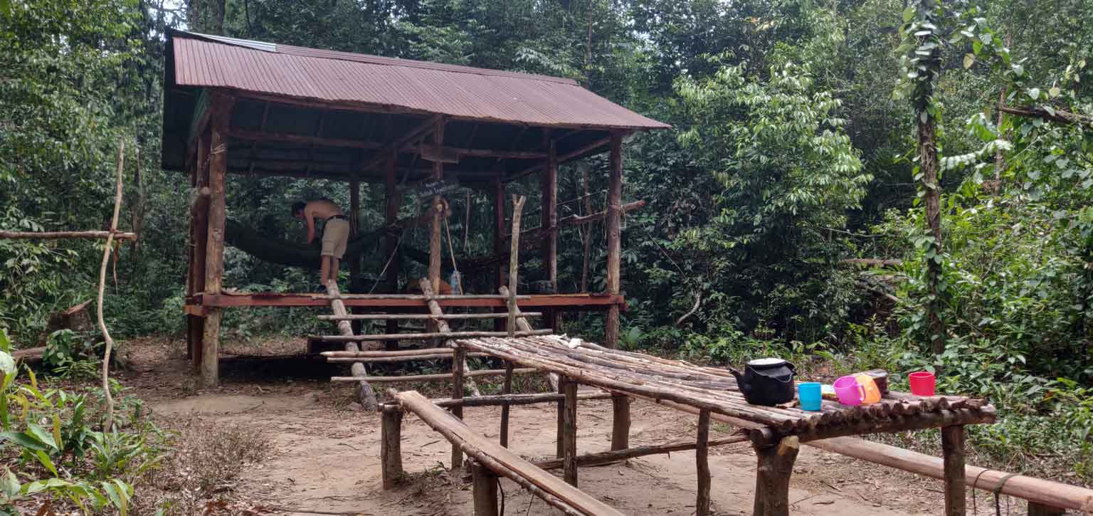 On papote de tout et de rien avec Andy, on aperçoit presque les gibbons et on revoit l’immense Toucan qui passe au-dessus des arbres deux fois (« lucky, lucky! » nous dit Kim). À 16h, on arrive au campement (« Hotel Cambodia! Hahaha! » 😊) où on s’installe pour la nuit : un plancher surélevé, un toit pour protéger de la pluie, et de quoi accrocher nos hamacs 🙂. On se souviendra longtemps de la petite sieste qu’on s’accorde à ce moment-là, bercés par le balancement du hamac et les chants d’ oiseau. On est bien…