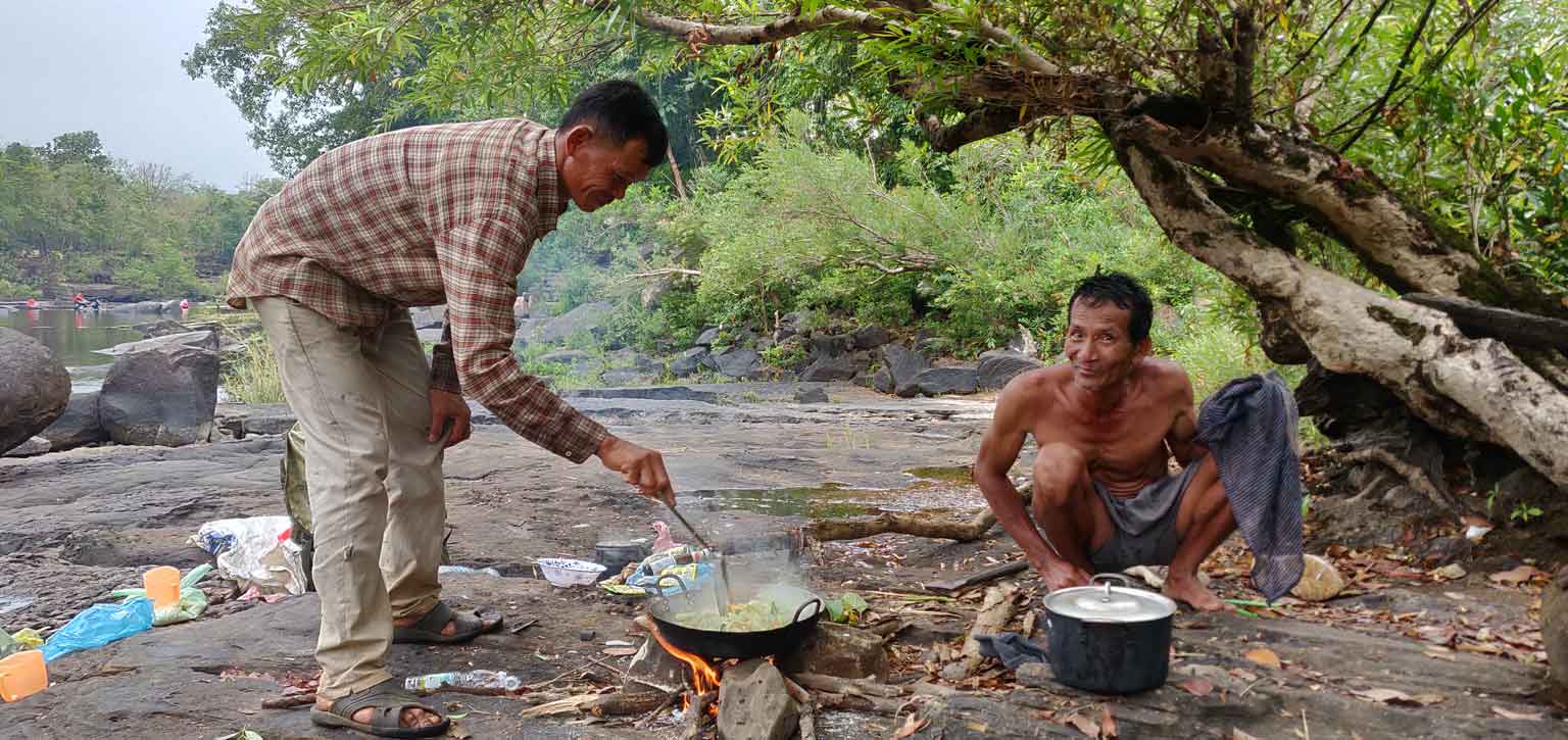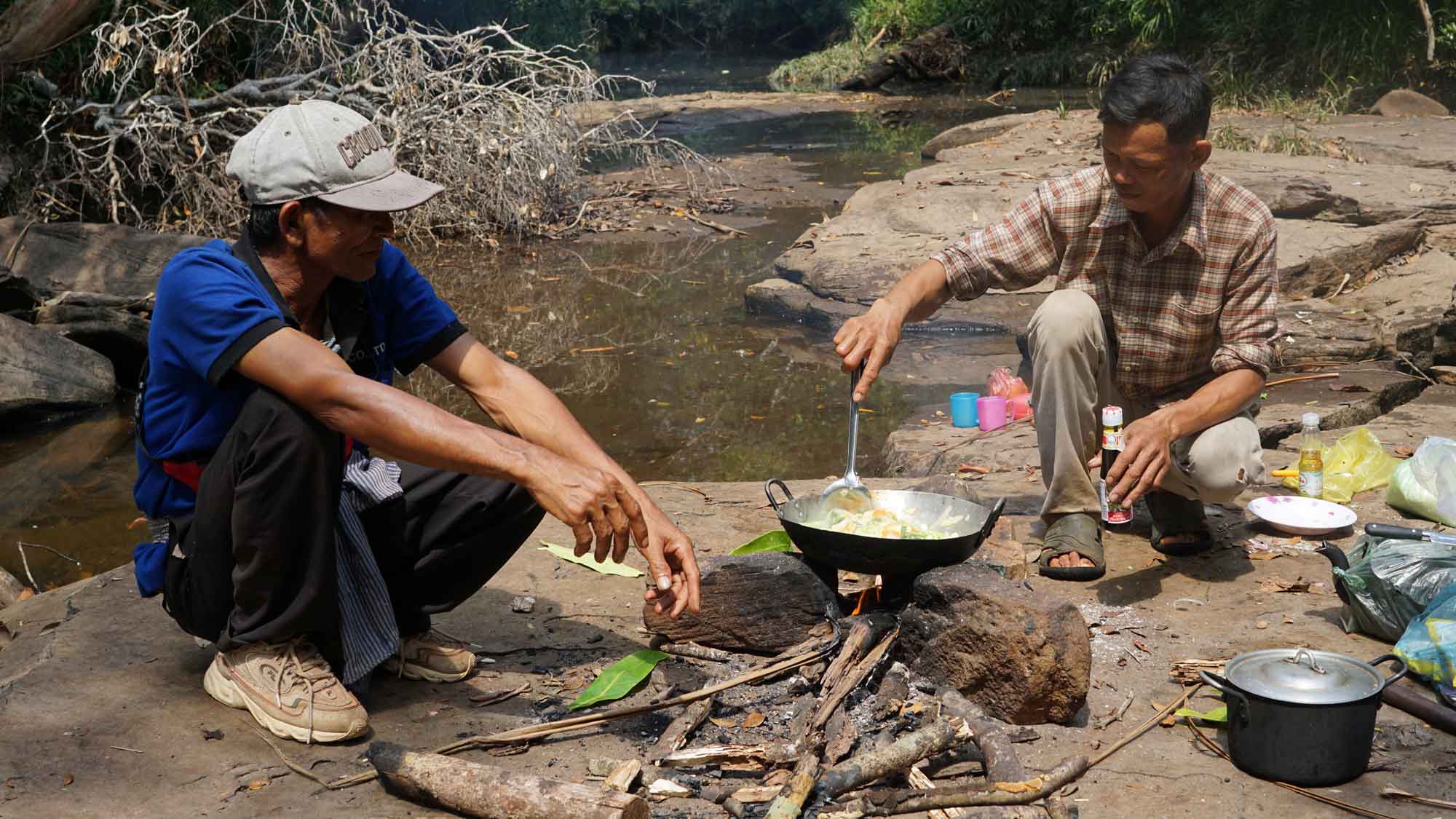 Le midi, pause dans le cours d’une rivière presque à sec, où ils s’installent pour faire un feu et prendre de l’eau. Kim s’esclaffe : « Restaurant Cambodia! » avec son éternel rire contagieux 🙂. Il nous explique qu’en plus d’avoir oublié ses lunettes ce matin, ils ont oublié le savon. On comprend alors que l’eau qui sert à nettoyer les plats, ET à faire la cuisine… c’est l’eau stagnante et franchement suspecte des petites mares, seuls restes de la rivière pendant la saison sèche. Gloups 😩. On décide de faire au moins une petite opération « séchage des assiettes », Andy s’avance bravement, en clamant fièrement que sa mission sera de les essuyer et, tout aussi bravement, glisse sur la pierre et se retrouve dans l’eau, les pieds trempés, son rouleau de papier toilette complètement imbibé 😂. Heureusement il ne s’ est pas fait mal. Romain, fidèle à lui-même, se fera un devoir de le taquiner non stop à ce sujet les trente-six heures suivantes 😆. Au final, on n’aura même pas été malades, comme quoi l’eau bouillie est à la hauteur de sa réputation ! Pendant que la cuisine se fait, Camille en profite pour tourner une autre vidéo pour sa chaîne YouTube de chansons du monde. Le repas est très bon, riz blanc avec légumes frais sautés (carottes, morning glory, courgette…) et poulet, puis on reprend la route !