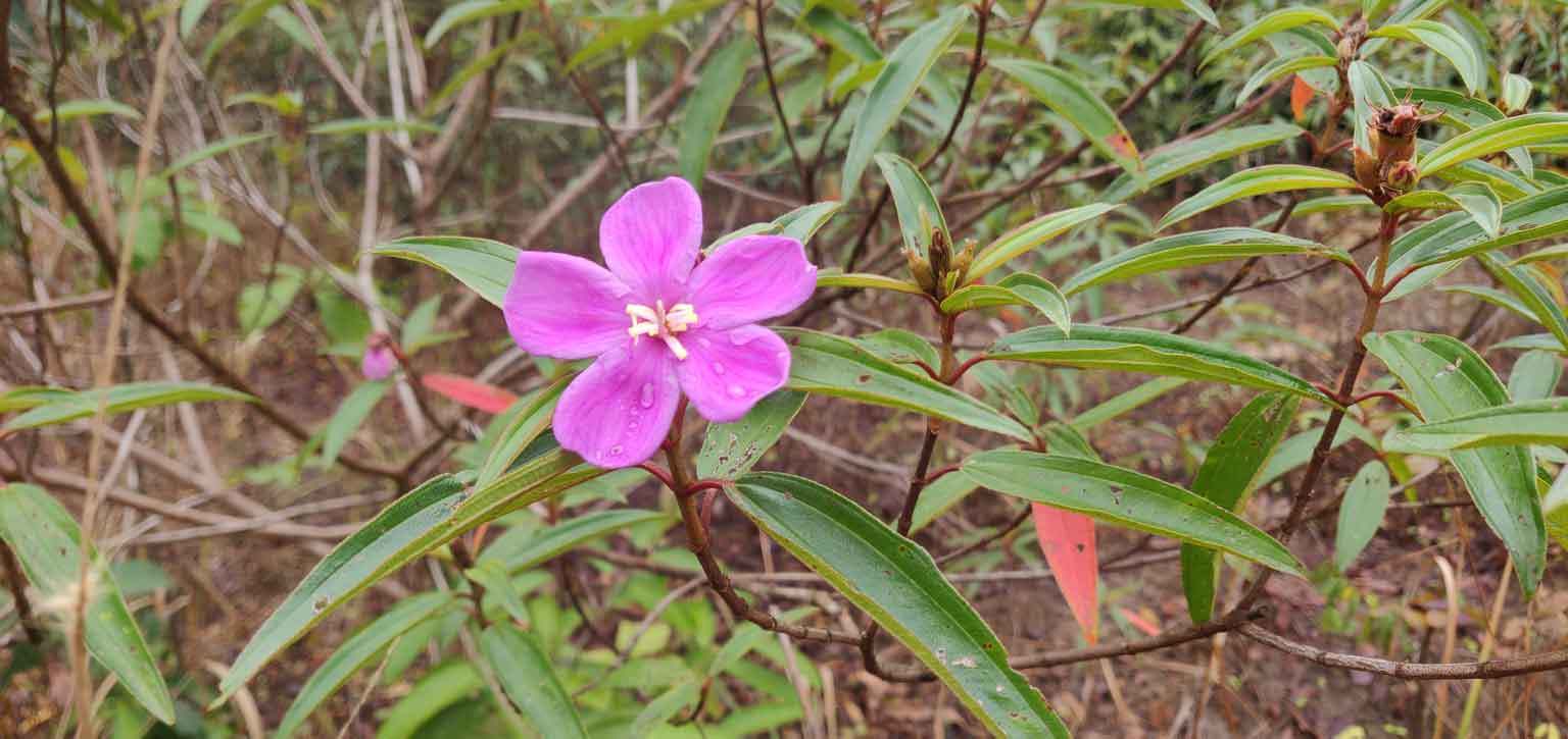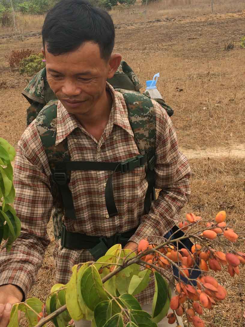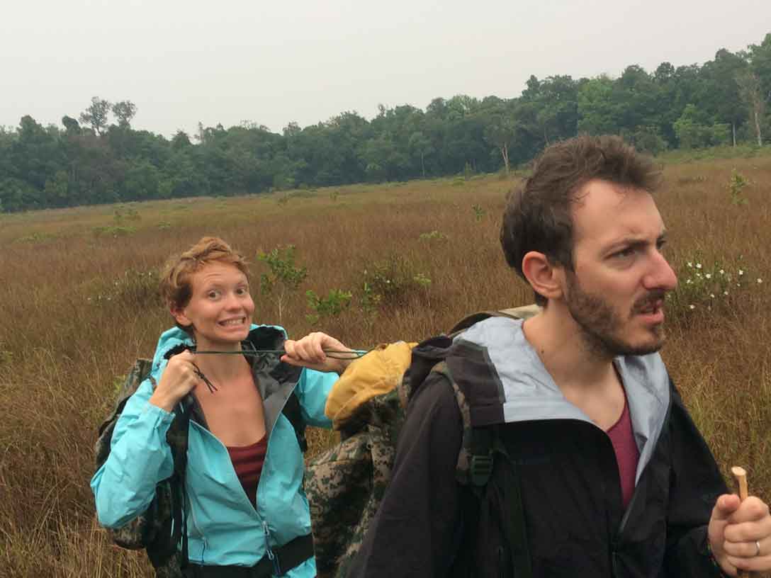 Après un lever un peu difficile pour Romain, on prend notre copieux petit-déjeuner (des nouilles !) et nous revoilà partis. On continue dans la jungle, puis à découvert ; mais grâce à la pluie d’hier et aux nuages encore présents, il fait bien moins chaud 🙂. On discute beaucoup avec Andy, on parle de politique, de voyages, de nos vies, c’est chouette. Dans la descente qui nous ramène doucement à la civilisation (cela fait plus de vingt-quatre heures qu’on n’a croisé personne), Sowann nous montre des fruits du coin : sortes de fraises des bois un peu fripées protégées dans des coques jaunes, et gros fruit jaune très juteux, absolument délicieux quand on arrive d’un trek ! Devant, Romain et Kim voient deux petits écureuils rayés dans un arbre.