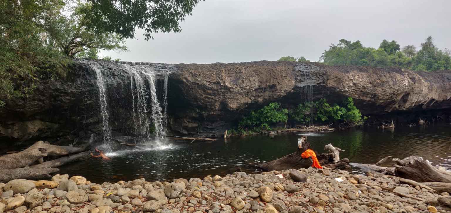 On finit par retrouver les villages, et on arrive devant une petite cascade mimi, où une famille venue en gros 4×4 pique-nique et où plusieurs moines avec leurs tenues traditionnelles orange se baignent. Puis (nous aussi on veut se baigner !), on va un peu plus loin, dans un petit coin contre la rivière qui nous rappelle un peu la Corse. Après avoir fait trempette, Kim et Sowann s’installent et lancent le feu tandis que nous trois allons avec délice nous laisser glisser dans l’eau de la rivière. Quel bonheur après deux jours à transpirer ! La vasque est grande et on nage un moment, puis Andy et Romain sortent tandis que Camille profite de chaque instant de barbotage autorisé jusqu’à ce que le repas soit prêt. Sur les arbres qui bordent la rive, elle aperçoit de nombreux oiseaux, jaunes, verts, noirs, à longue queue, et deux écureuils qui se courent après dans les branches.