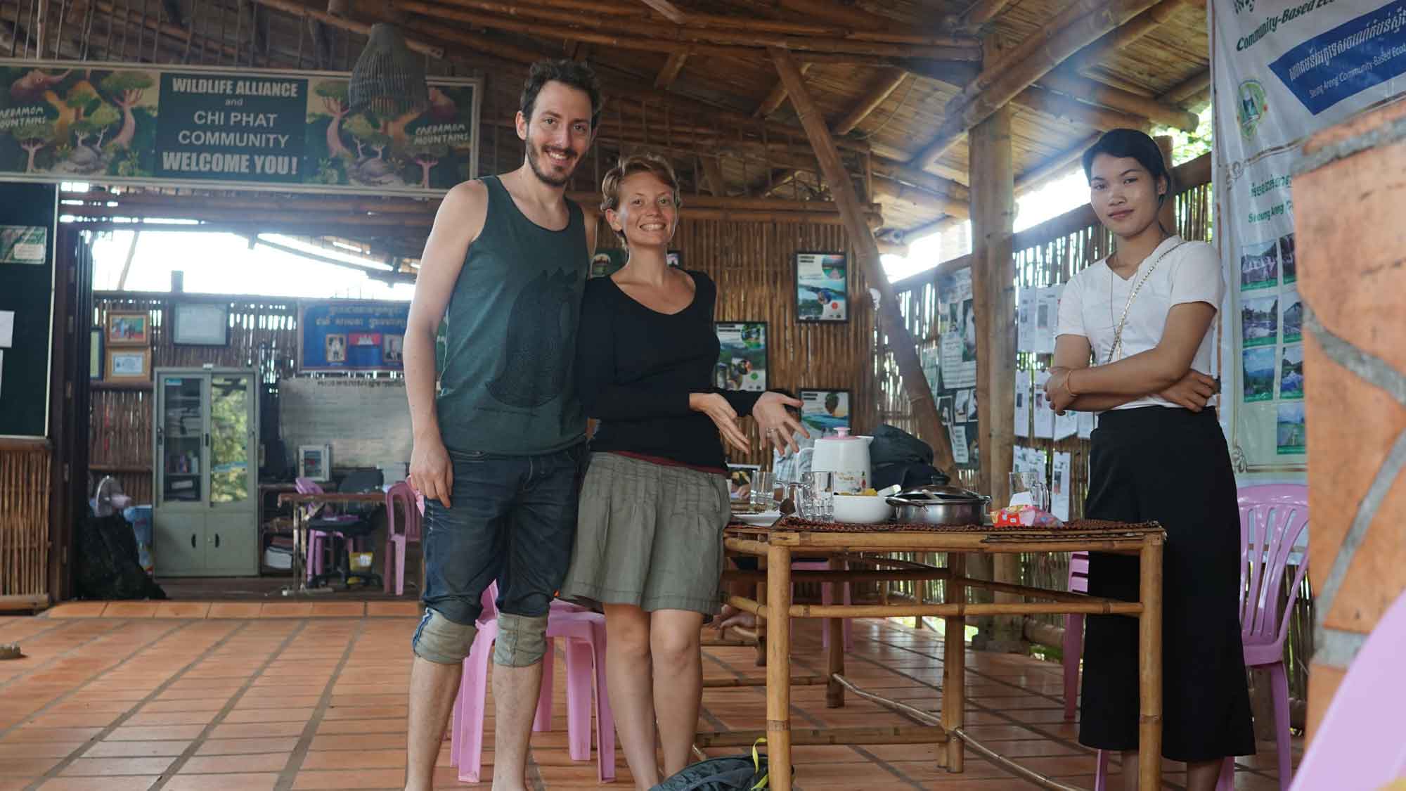 Depuis nos trois semaines perdues à Ko Chang, on rêvait de nature retrouvée, c’est pourquoi nous sommes allés nous perdre au village de Chi Phat, au sud du Cambodge, dans les Cardamom Mountains. Même si c’est un endroit qui se mérite (six heures de bus de Siem Reap à Pnom-Penh, une nuit qui nous a coûté une fortune dans un hôtel pourri, puis cinq heures de bus jusqu’à Andoung Tuek suivies de deux heures de bateau sur le fleuve le long des mangroves), on est très heureux d’avoir fait l’effort d’y venir !