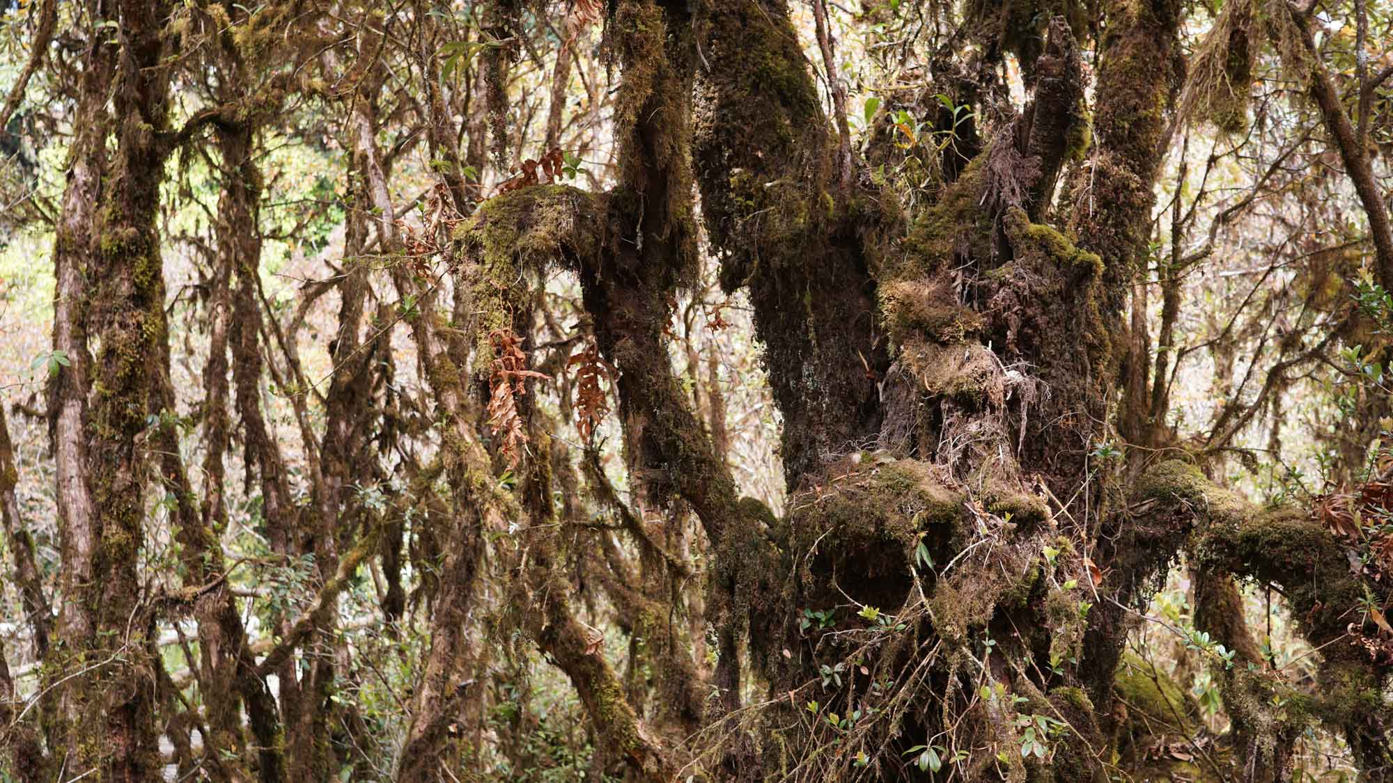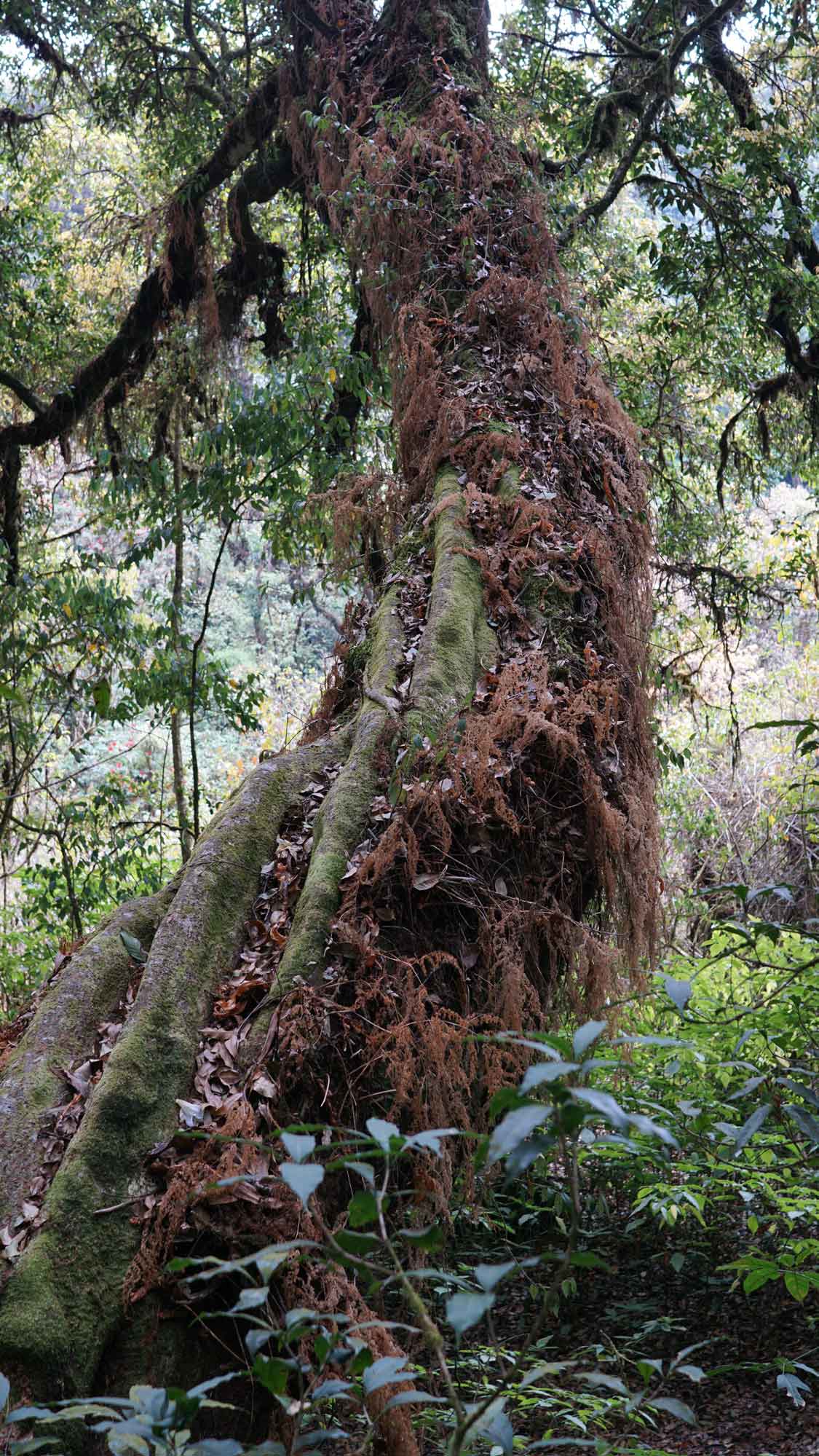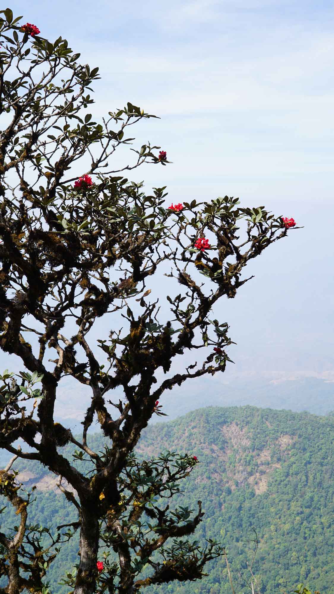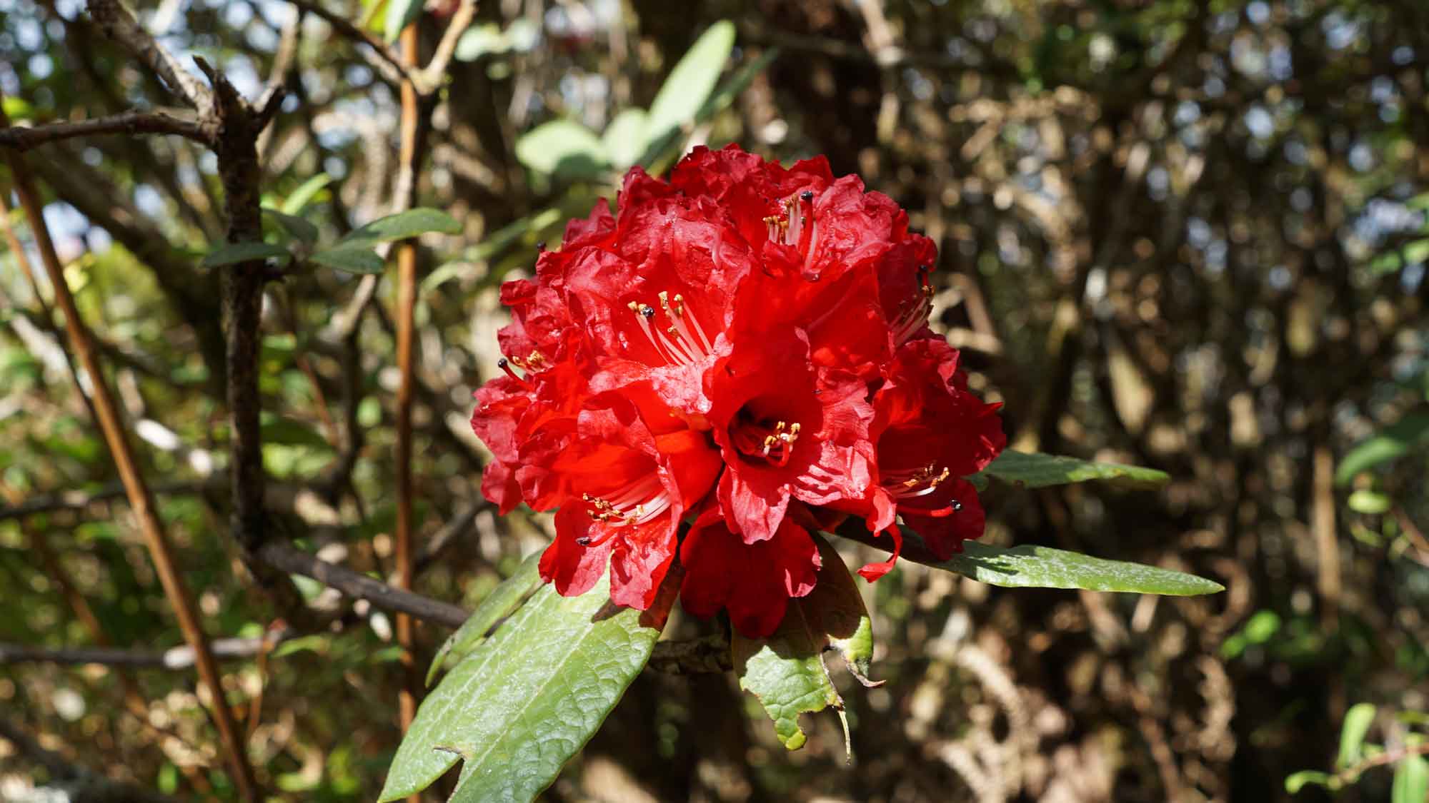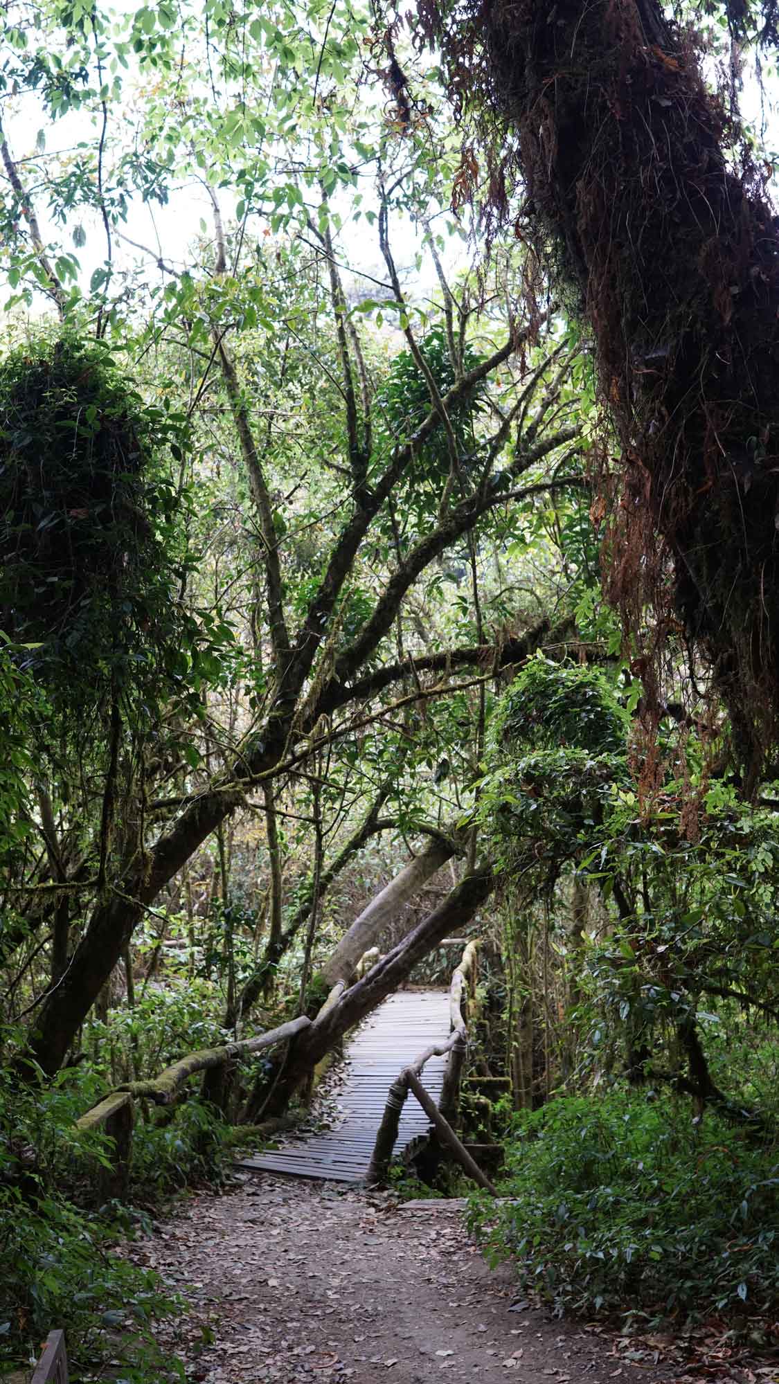 La balade est très chouette, et presque trop facile : on suit un petit pont en bois qui parcourt les parties sous les arbres, on passe devant une cascade toute mimi, puis on sort à découvert où le paysage change beaucoup. Il y a un beau point d’observation, dont on ne profite pas complètement à cause d’un groupe de chinois (désolés) qui fait beaucoup trop de bruits, mais on discute avec des thais en vacances très sympa 🙂. Ensuite on passe devant les très beaux rhododendrons en fleur, qu’ils appellent les roses sauvages, rouge vif, qui se découpent sur le ciel. On aperçoit en contrebas les deux Pagodes royales, puis on revient sous le couvert des arbres pleins de lianes et de mousse (elle est trop belle cette forêt) pour boucler la boucle. Au final on aura mis une heure et demie sans se presser, c’était nickel (même si Camille a des soifs de bonne grosse randonnée, ce sera pour la Nouvelle-Zélande !).