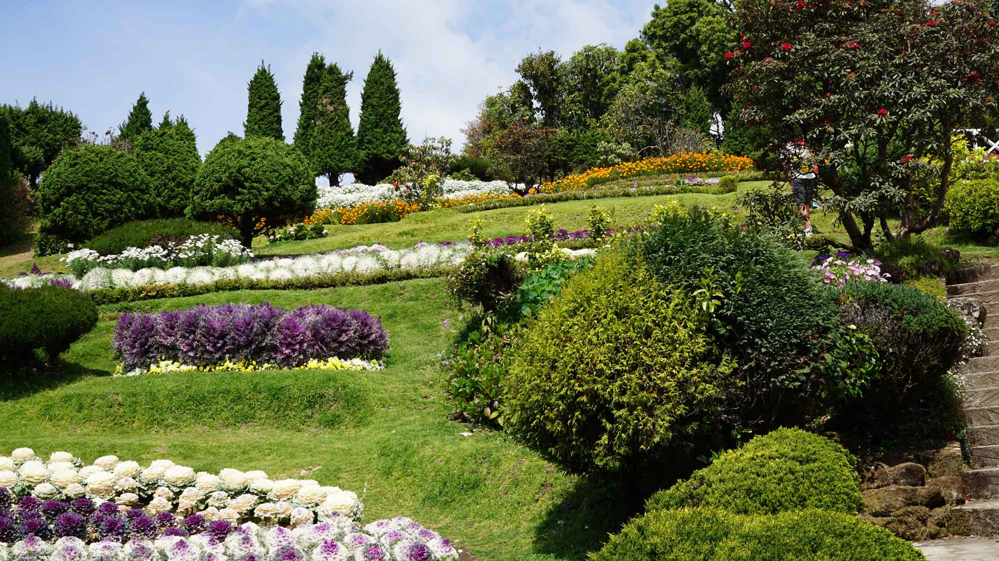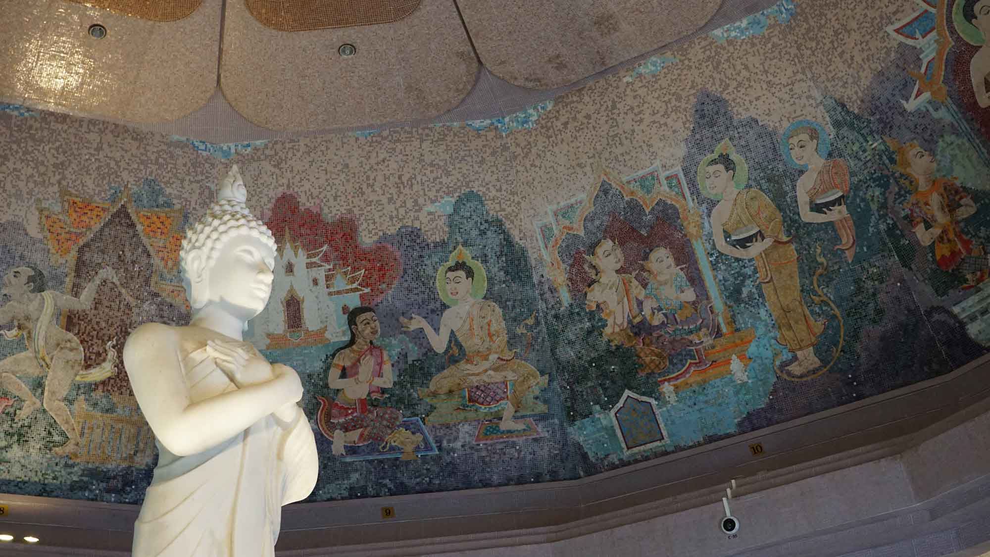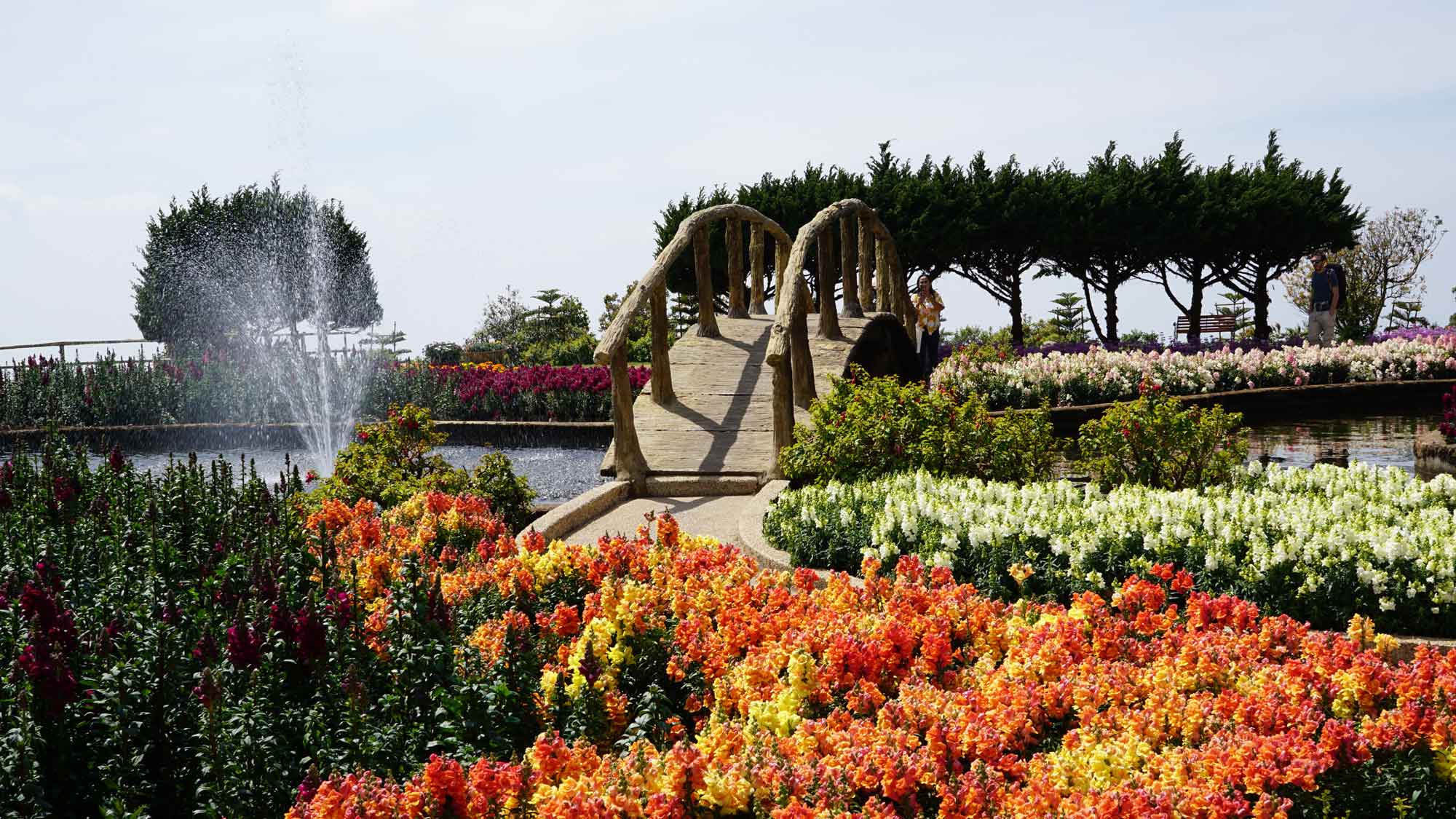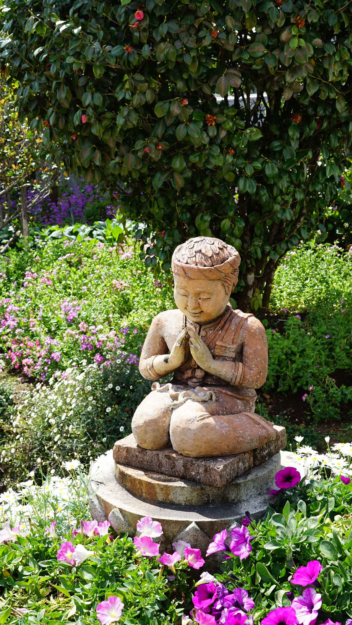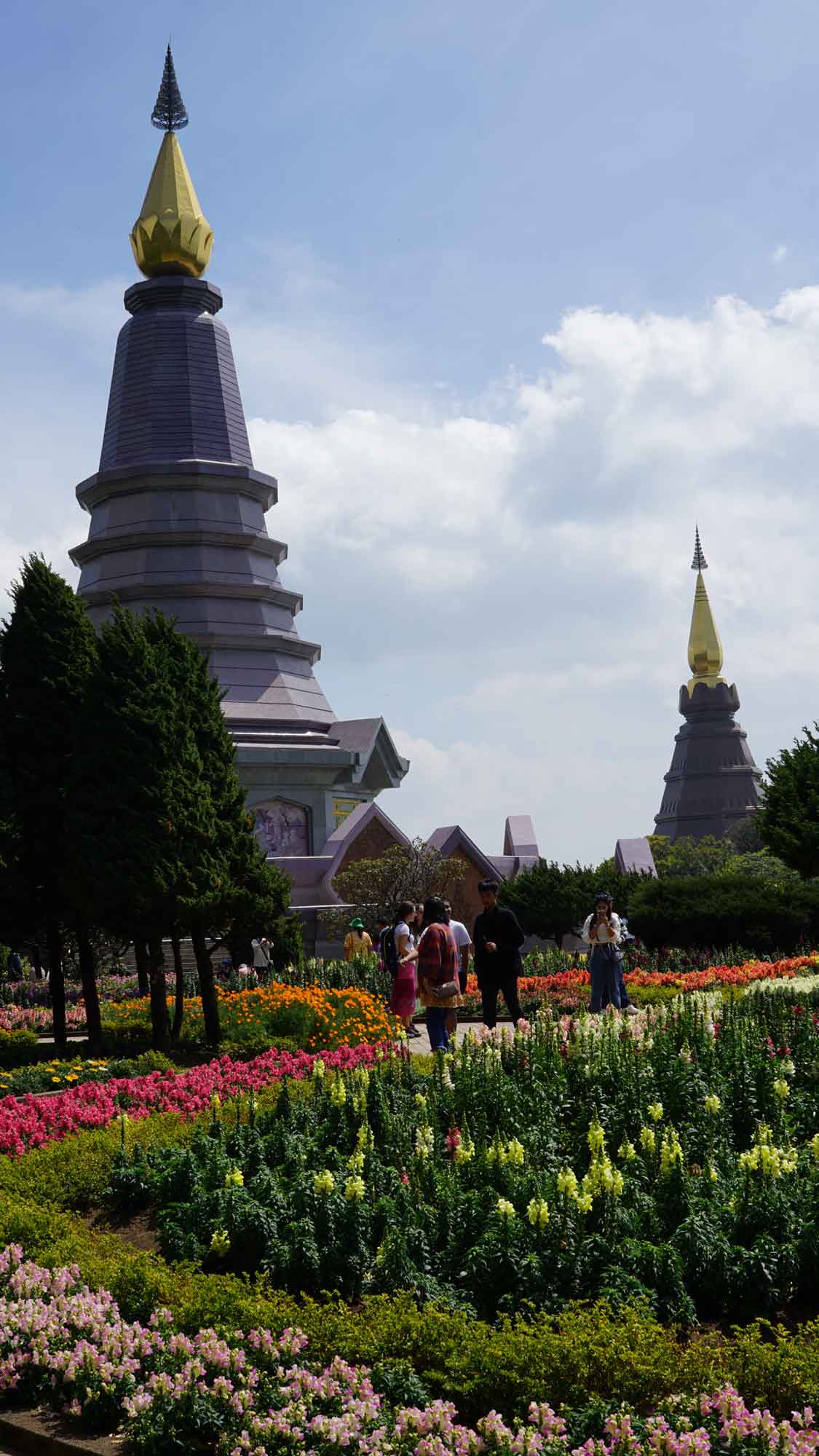 Petite pause midi avec une soupe de nouilles, puis on va visiter les Pagodes ! Il n’y a pas de bâtiment en dehors des deux immenses cônes blancs qui contiennent des images de l’histoire de Bouddha, mais à l’extérieur, les parterres de fleurs aux couleurs vives créent un jardin de dessin animé. Elles sont magnifiques !
