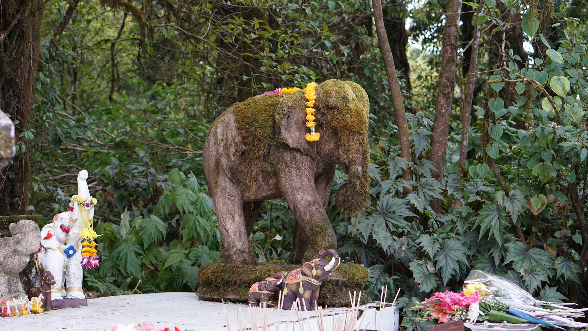 On ressort, puis on monte le chemin jusqu’au « sommet » du Doi Inthanon ; sur le chemin, à un moment où il n’y avait personne, on voit plein d’oiseaux dans les buissons devant nous ; on aura le temps de prendre une ou deux photos, mais un gros groupe de touristes (chinois) marchant et parlant fort fera fuir les oiseaux, et on ne les reverra plus 😢. Le mémorial du sommet était quand même très chouette. 🙂
