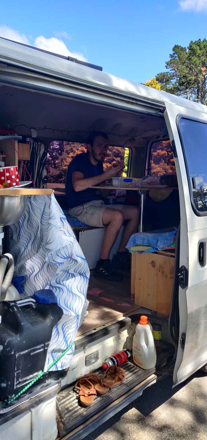 On trouvera notre bonheur à la car fair d’Auckland du samedi matin. Après avoir hésité entre trois vans différents, en avoir choisi un qui nous est passé sous le nez, contacté les propriétaires du deuxième qui nous ont dit que finalement il y en avait pour 2000$ de réparations avant qu’il roule (euuuh du coup non), on prend finalement un Nissan Caravan, un peu vieux et un peu petit, mais bien équipé et dont la précédente propriétaire (Leah, une française très sympathique et hyper débrouillarde de vingt ans 😱) avait pris soin. En plus, elle nous l’a fait à un prix super intéressant, donc tant mieux ! Nous voilà donc avec notre nouvelle maison sur roues, ses petites étagères, le lit qui se transforme en banquettes et table, son panneau solaire qui nous donne du courant, un mini-évier et un réchaud à gaz portable. Ce n’est pas grand, mais on est bien. 🙂