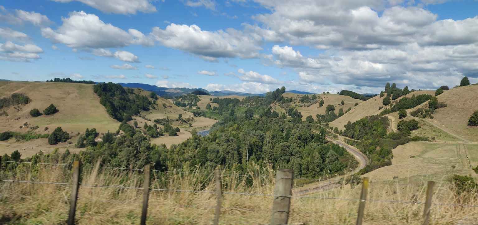 Nous voilà partis ! On est déjà heureux, les paysages néo-zélandais, même de la route, sont vraiment superbes. On dirait qu’un enfant a dessiné son idée de la campagne, puis froissé un peu le dessin pour faire du relief : des collines verdoyantes à n’en plus finir, le ciel bleu, des moutons blancs dans le ciel et beige dans l’herbe, une maison de temps en temps, et c’est tout. On est bien. 🙂