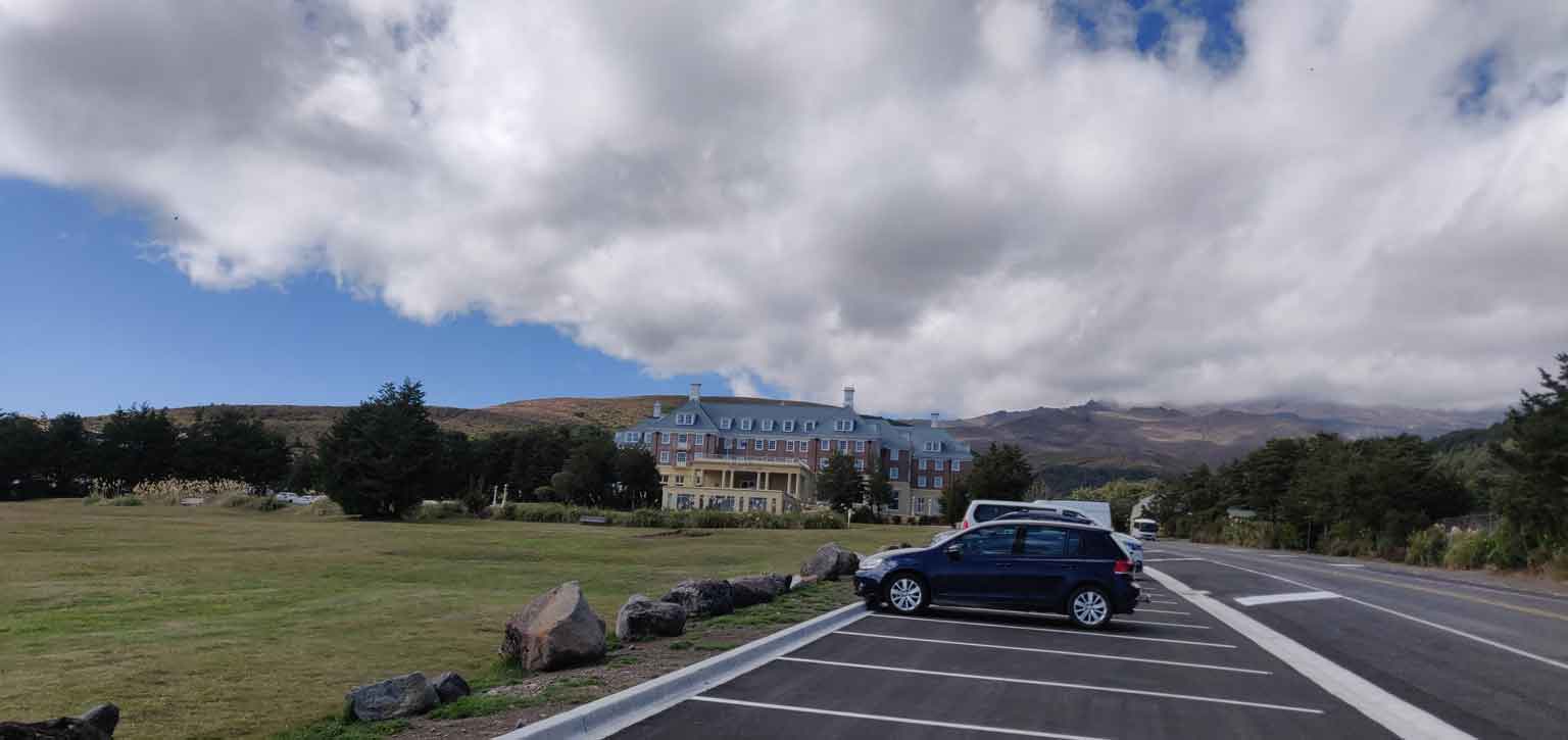 Premier jour : dur dur le réveil… Après avoir terminé les sacs, on passe à côté de l’hôtel très classe « Château Tongariro » 😛 pour aller au centre visiteur du parc (bien organisé, avec même une petit expo !) pour vérifier nos informations. On tombe sur un maori hyper gentil qui nous explique qu’il y a peut-être moyen de faire la grosse journée le premier jour malgré les réservations, car souvent des gens changent leurs plans et libèrent des places dans les refuges. On ne pensait pas que ce serait possible, du coup on est parti un peu tard… Tentons quand même !