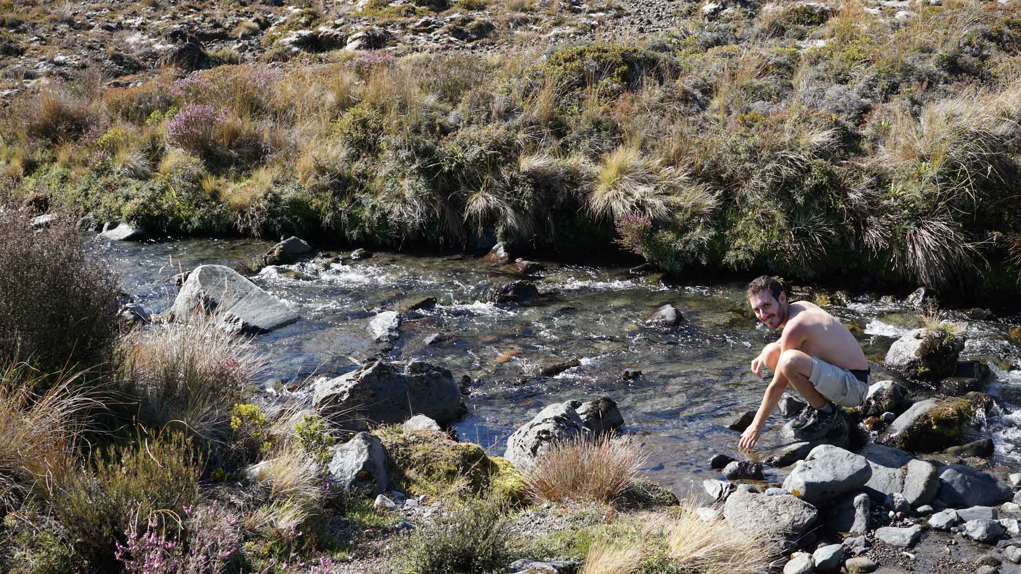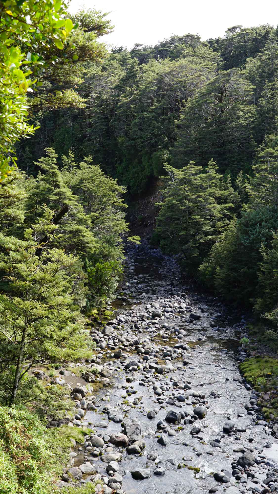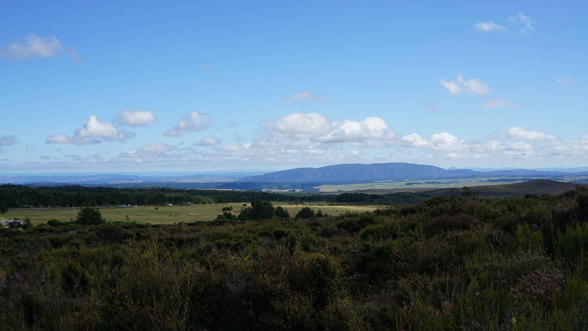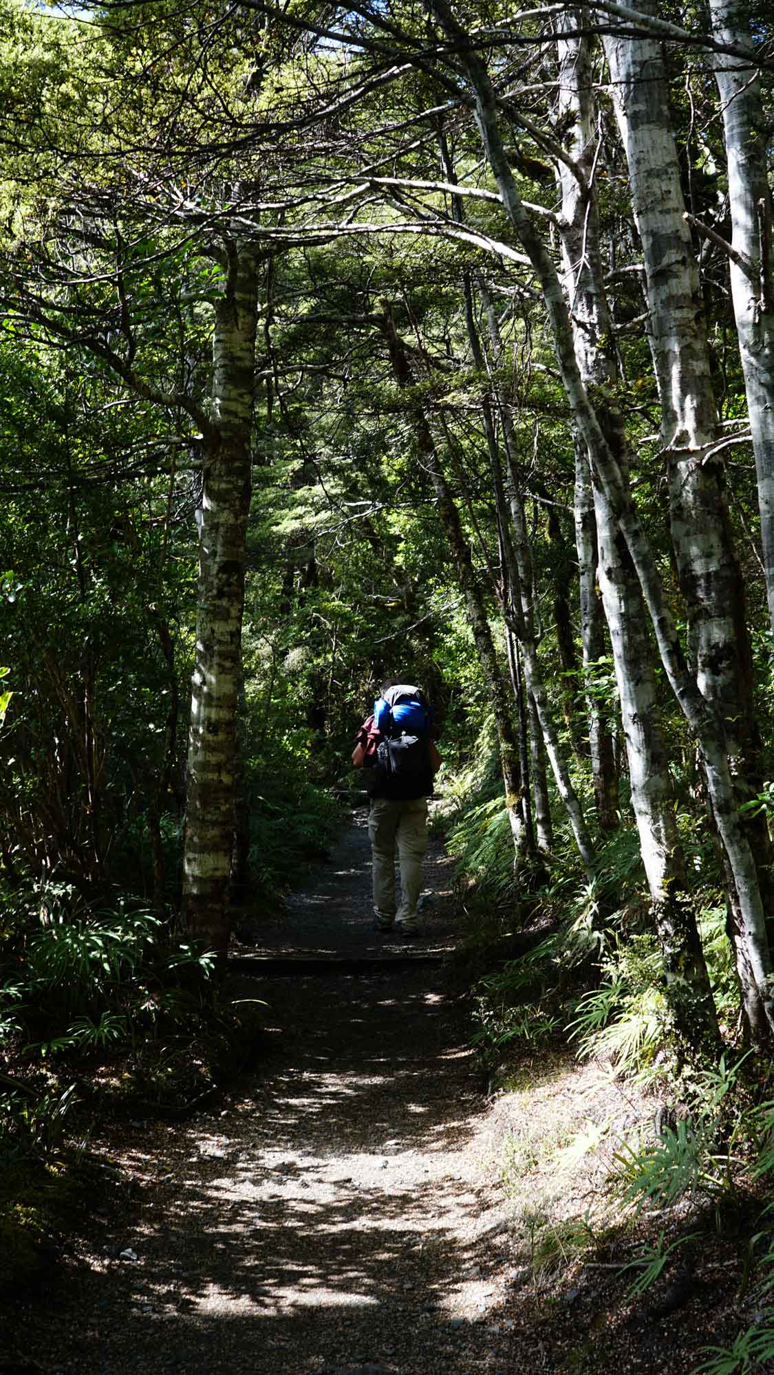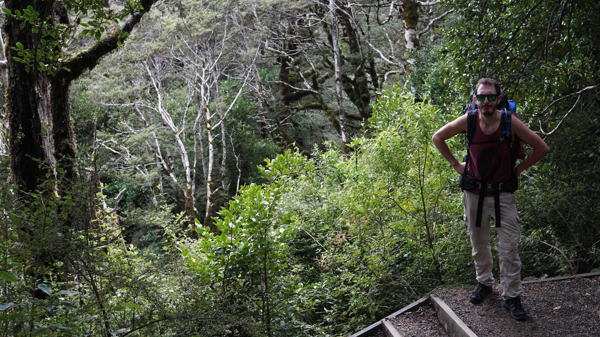 Le lendemain matin, le photographe, apprenant que Camille est chanteuse, lui propose de la filmer pour insérer une de ses chansons dans le documentaire qu’il est en train de tourner sur les randonnées de Nouvelle-Zélande 🙂. Petit moment tournage donc, puis on termine les affaires et on se remet en route, selon la tradition, à 11h 😛. Le paysage est moins changeant pour cette dernière partie : steppes, petits arbustes, et la vue qui se libère doucement sur le paysage du reste du parc national, avant de retrouver notre jolie forêt du départ.