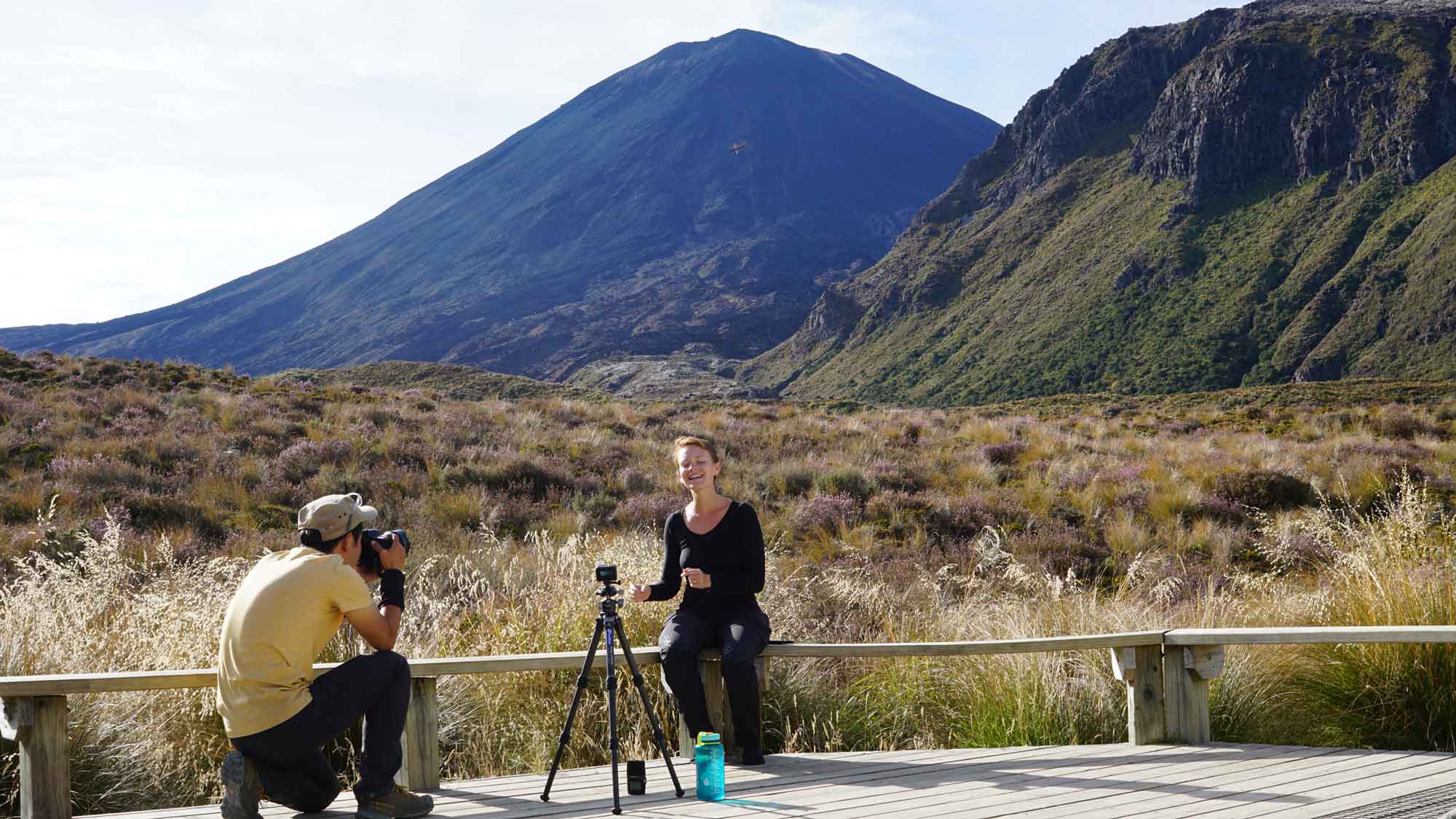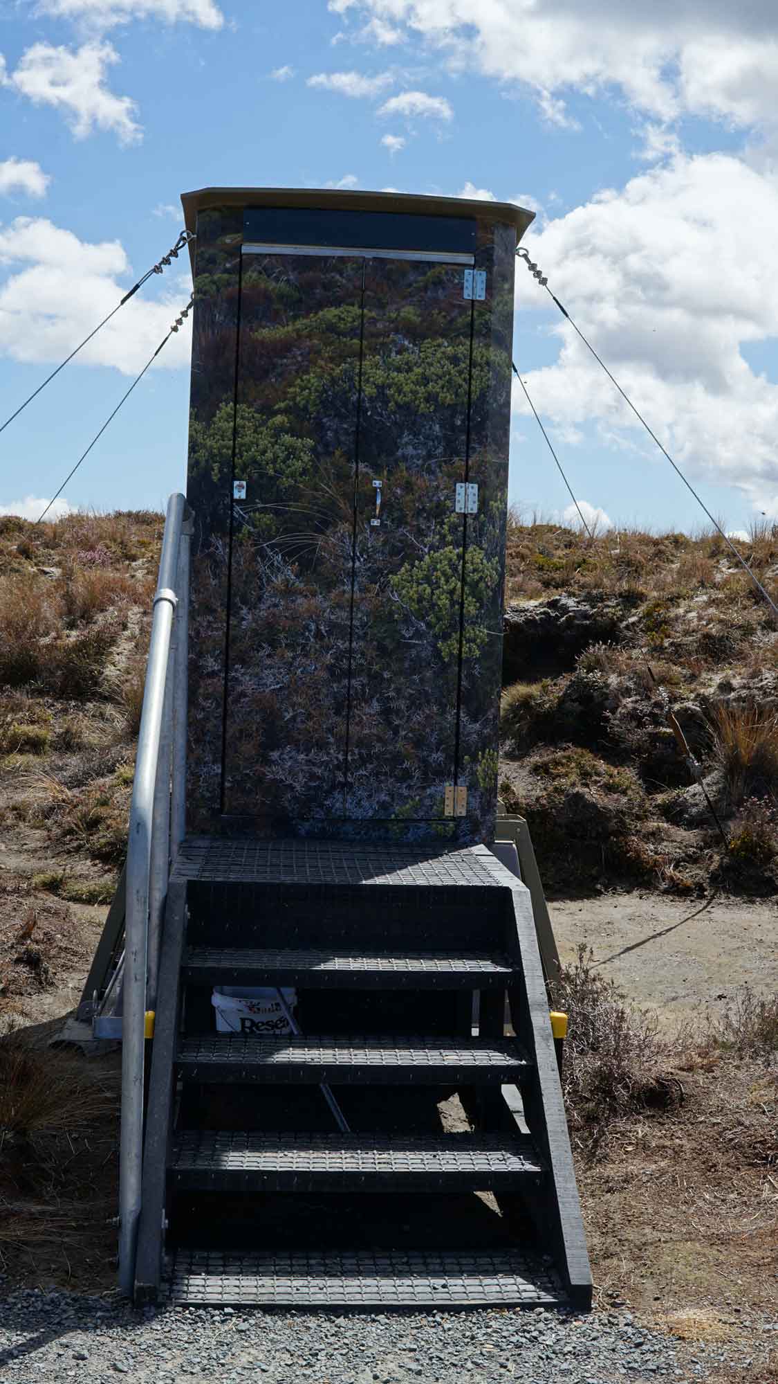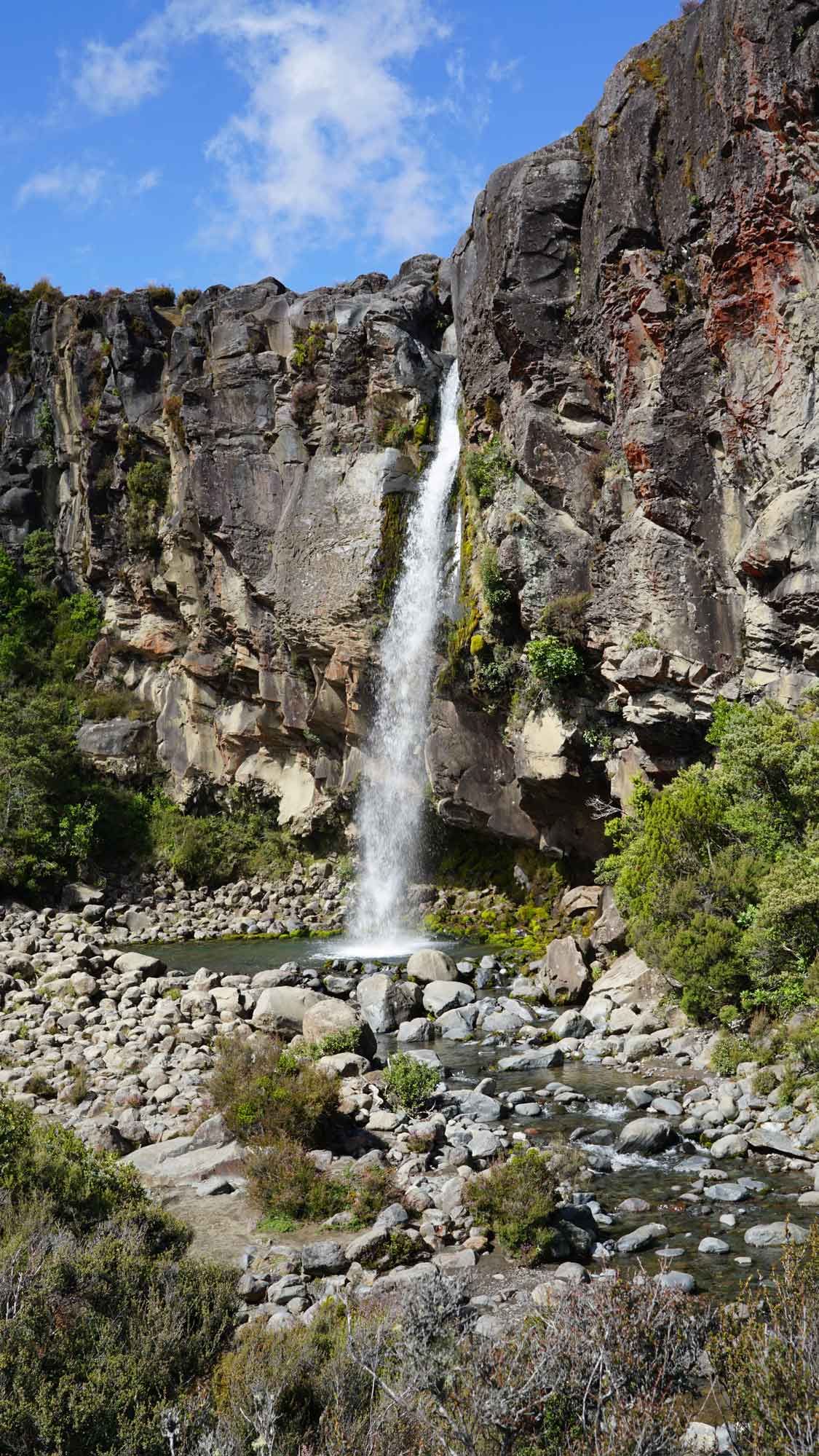 La voie débouche ensuite sur une cascade, avec encore un peu de monde : couples plus âgés ou avec des enfants, qui font des petites balades de deux heures autour du centre visiteur. Première photo avec la vue sur le reste du parc national en dessous. Ensuite, on fait un petit crochet au Lower lake où on mange nos sandwichs, puis un premier arrêt aux toilettes mythiques du Tongariro dont les murs sont couverts de photos de nature pour le camoufler. 😊