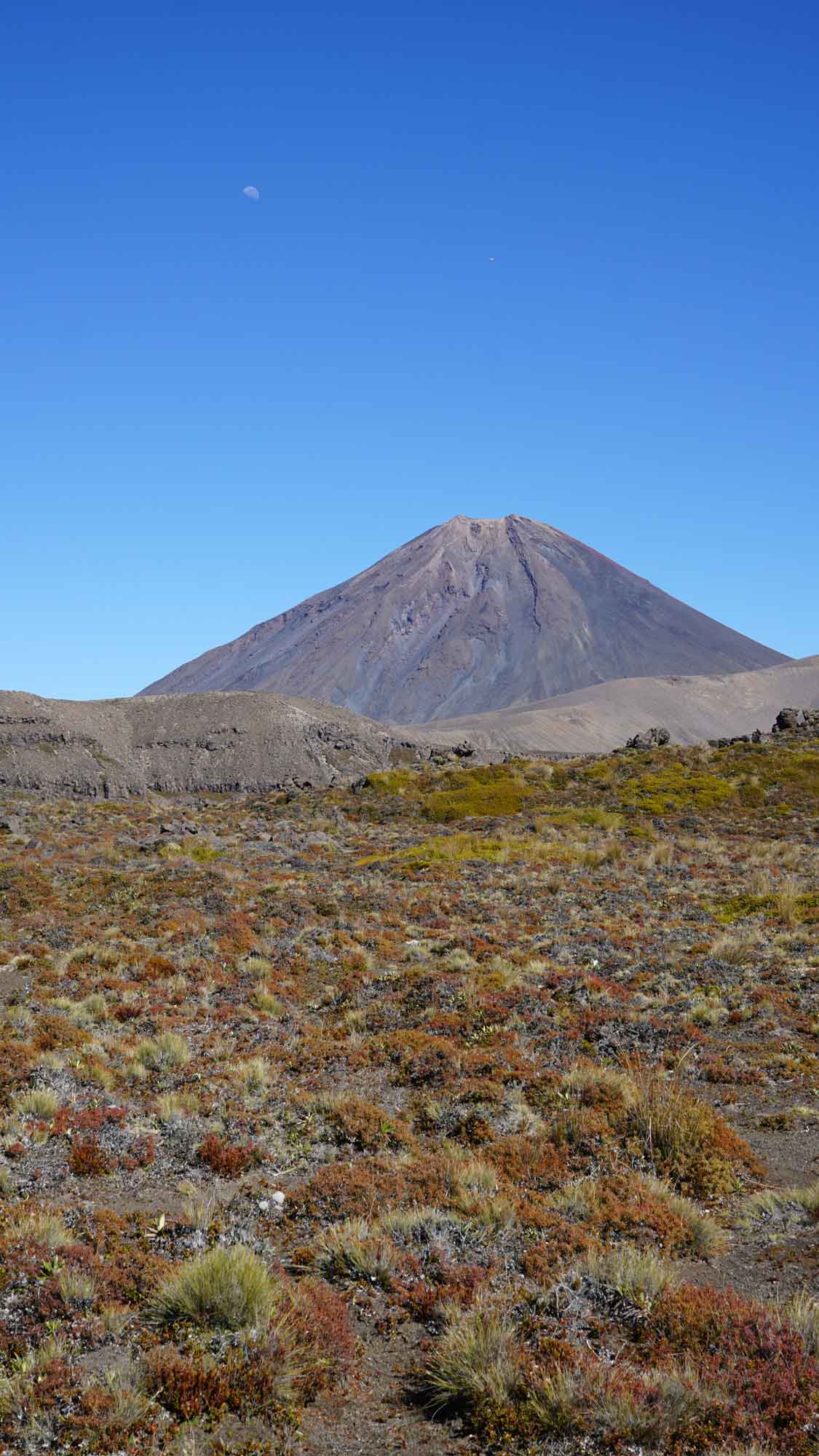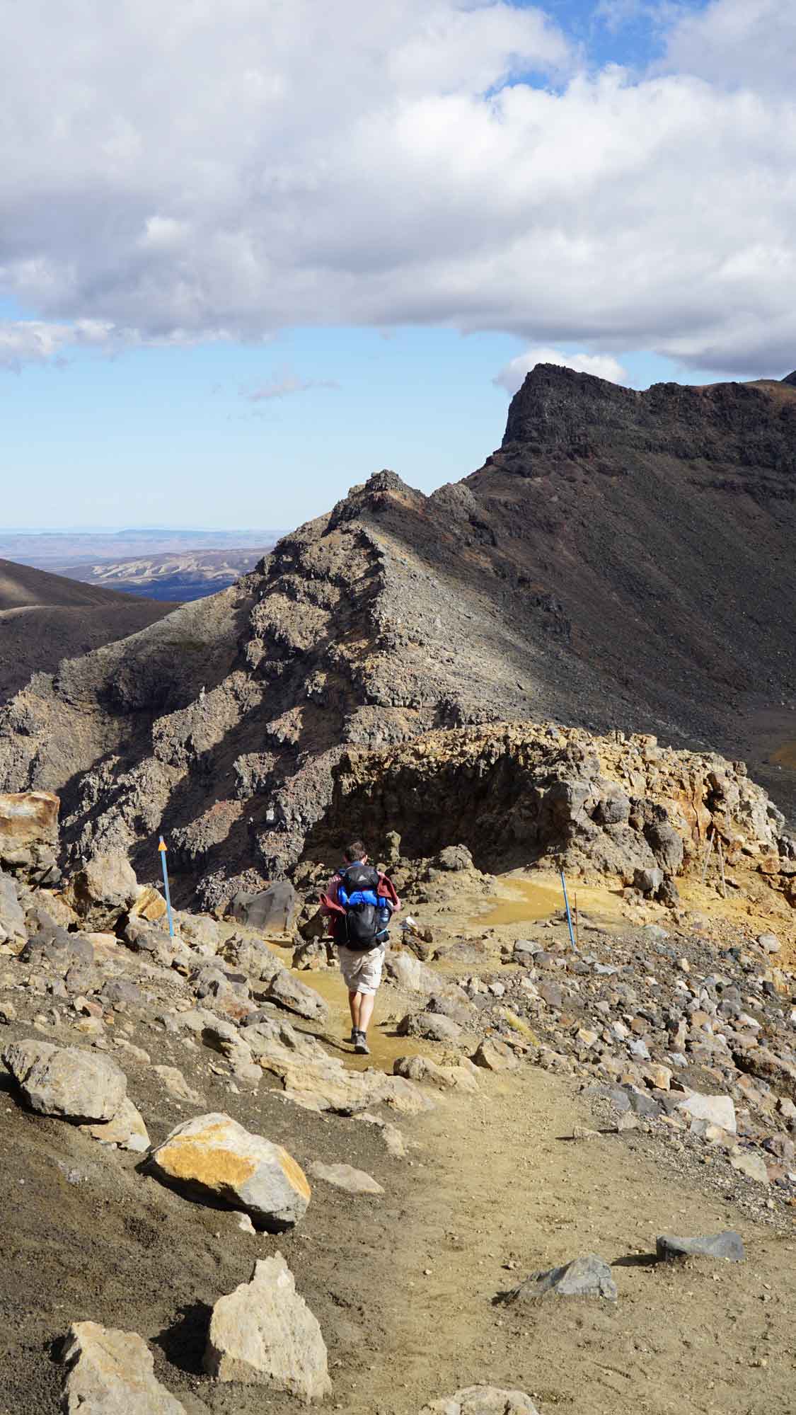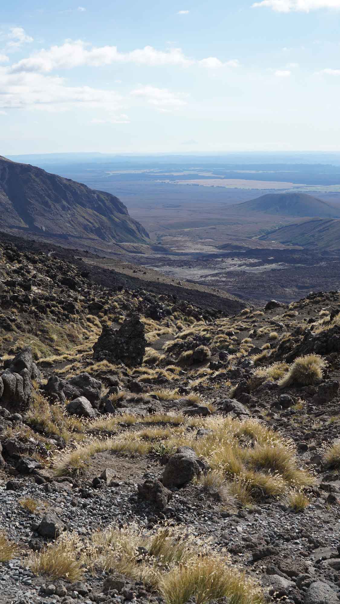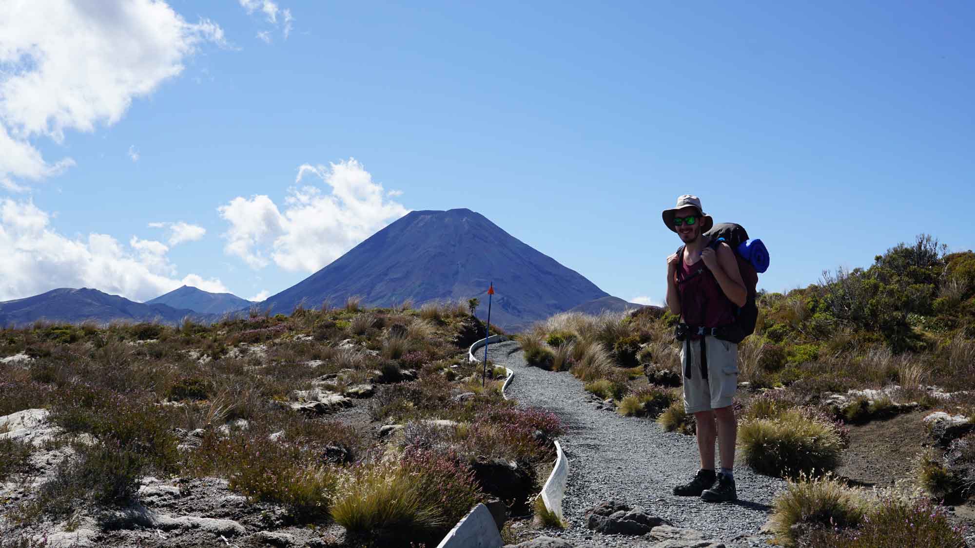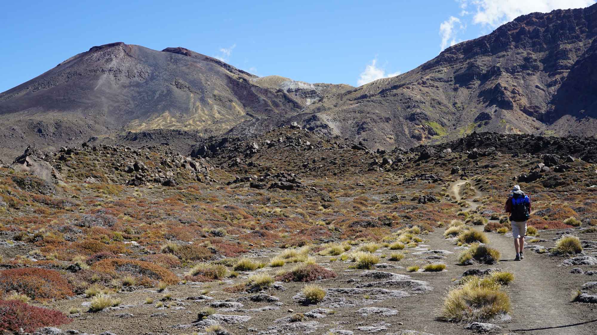 C’est parti pour la balade. Le paysage est très varié : le chemin commence au milieu de buissons, avec vue sur le Ngauruhoe, le « volcan du Mordor » autour duquel on va décrire une boucle, sommet sacré pour les Maori. Très souvent, on suit un chemin en bois (comme on avait vu en Asie), qui rend la marche bien plus simple). La météo est idéale, d’ailleurs Romain qui l’a sous-estimée s’est tapé un coup de soleil monstrueux sur les épaules. 😅