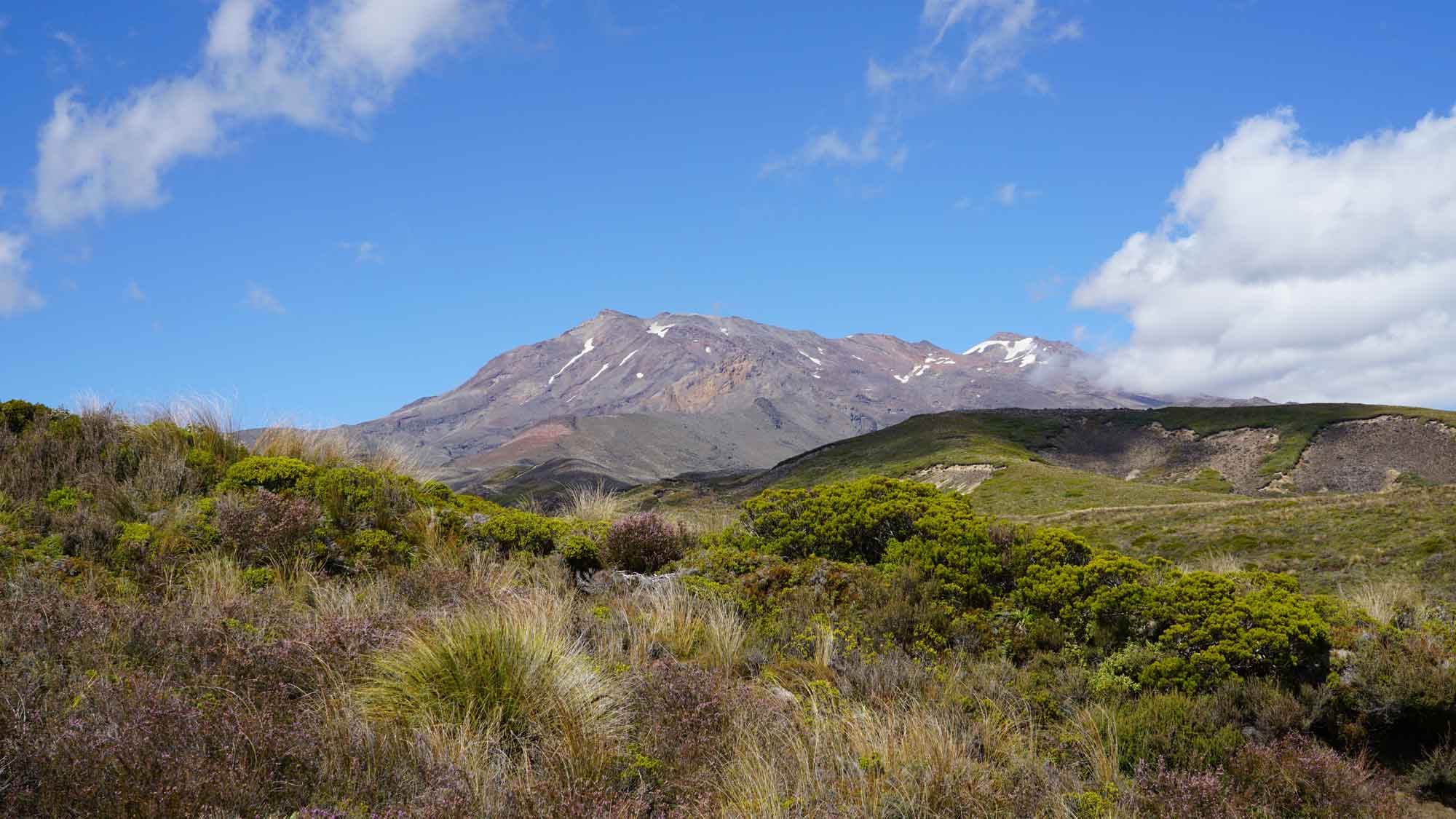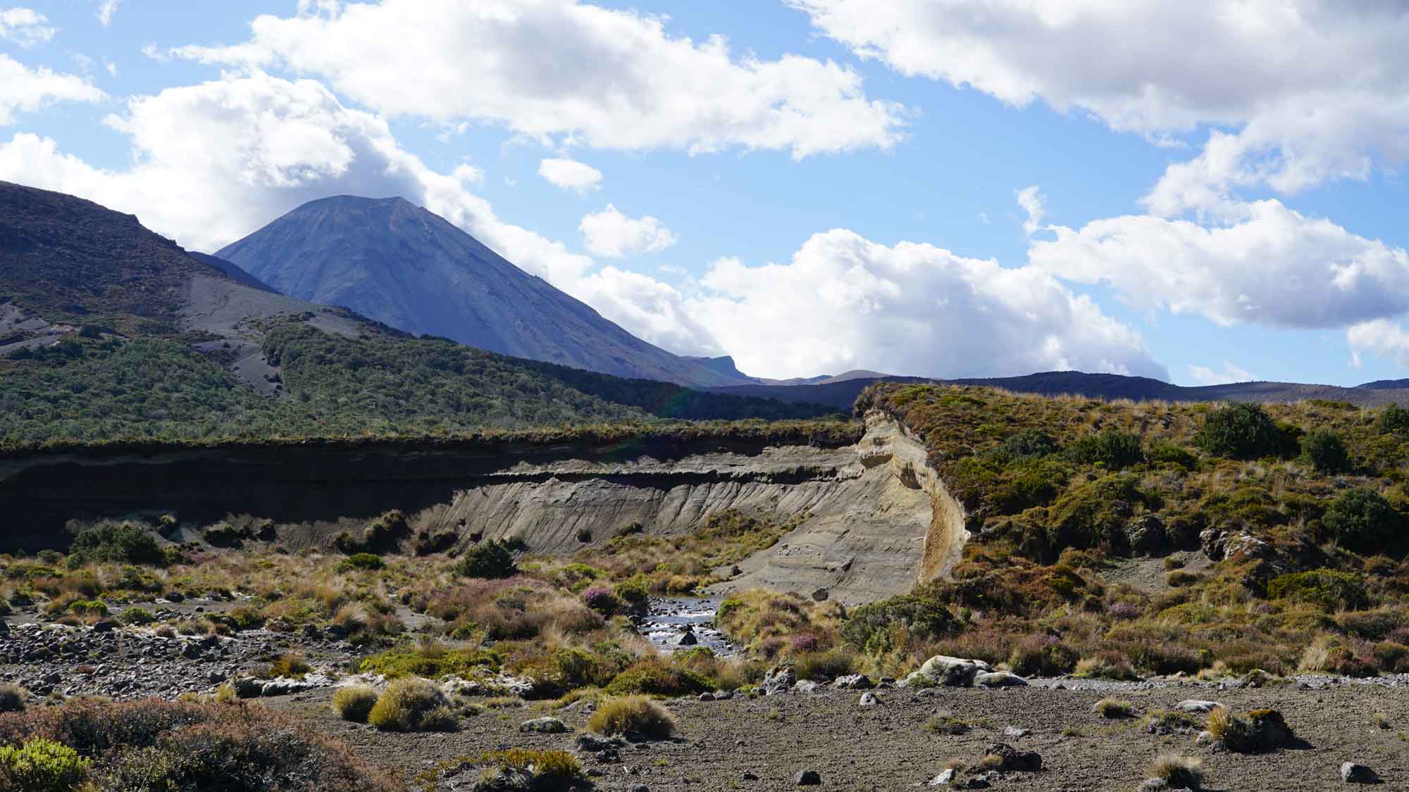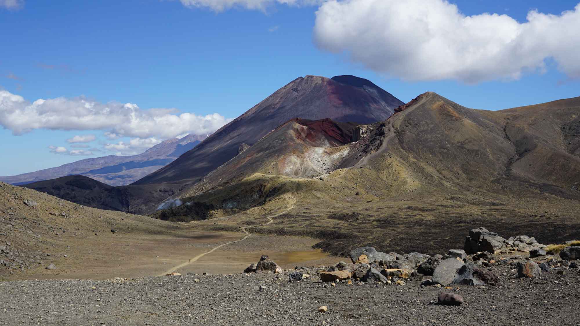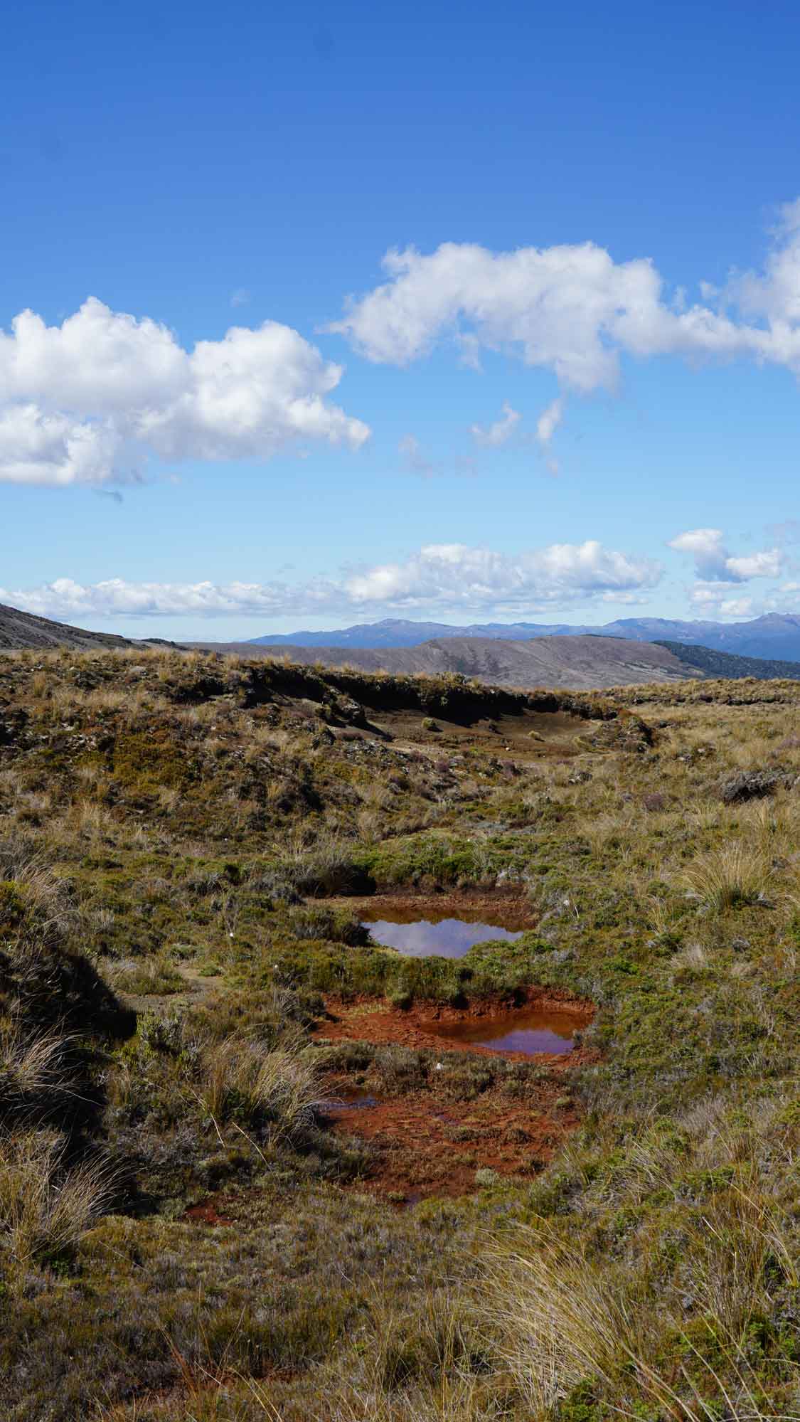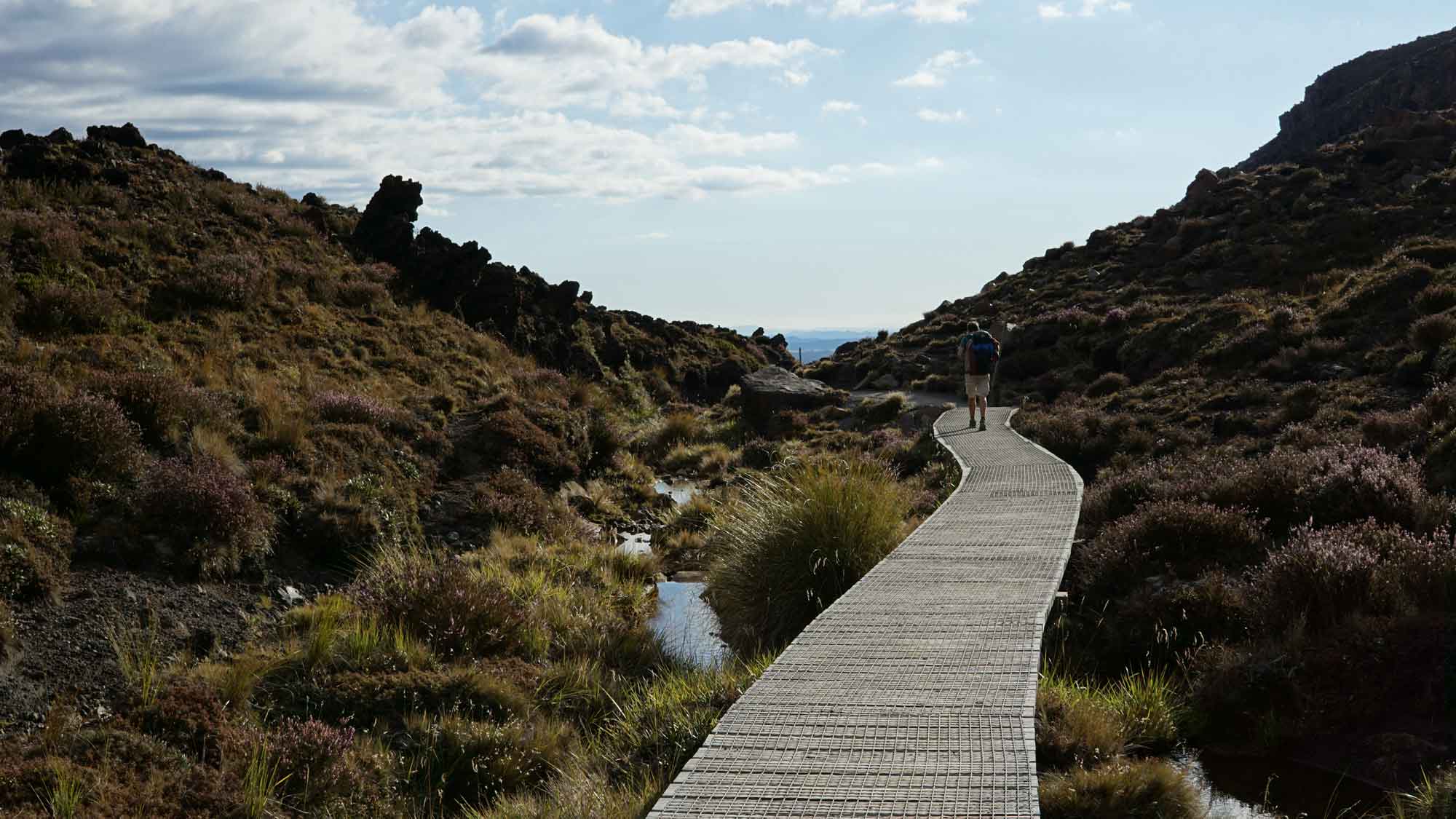 C’est parti pour la balade. Le paysage est très varié : le chemin commence au milieu de buissons, avec vue sur le Ngauruhoe, le « volcan du Mordor » autour duquel on va décrire une boucle, sommet sacré pour les Maori. Très souvent, on suit un chemin en bois (comme on avait vu en Asie), qui rend la marche bien plus simple). La météo est idéale, d’ailleurs Romain qui l’a sous-estimée s’est tapé un coup de soleil monstrueux sur les épaules. 😅