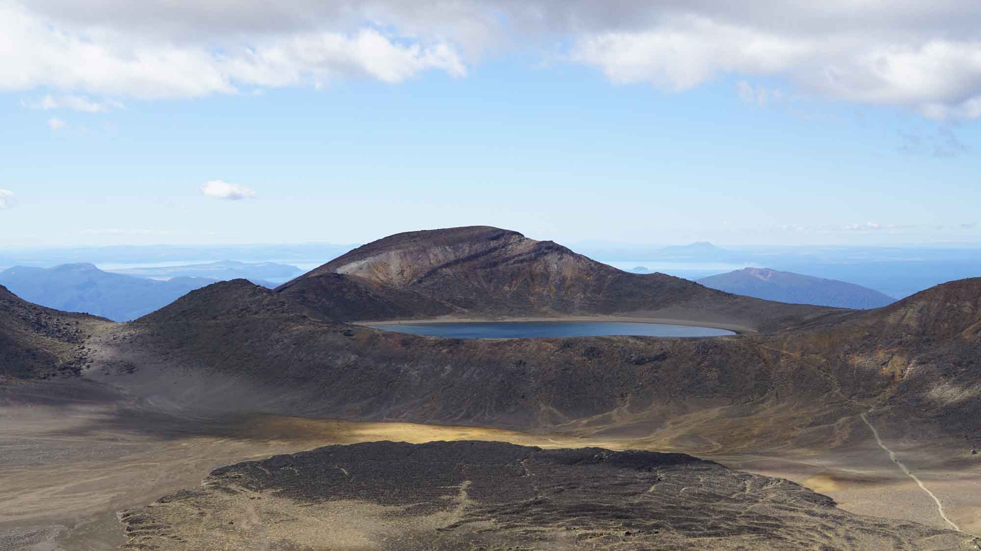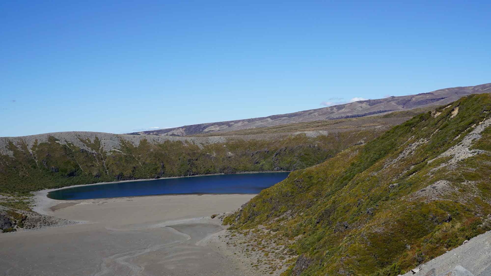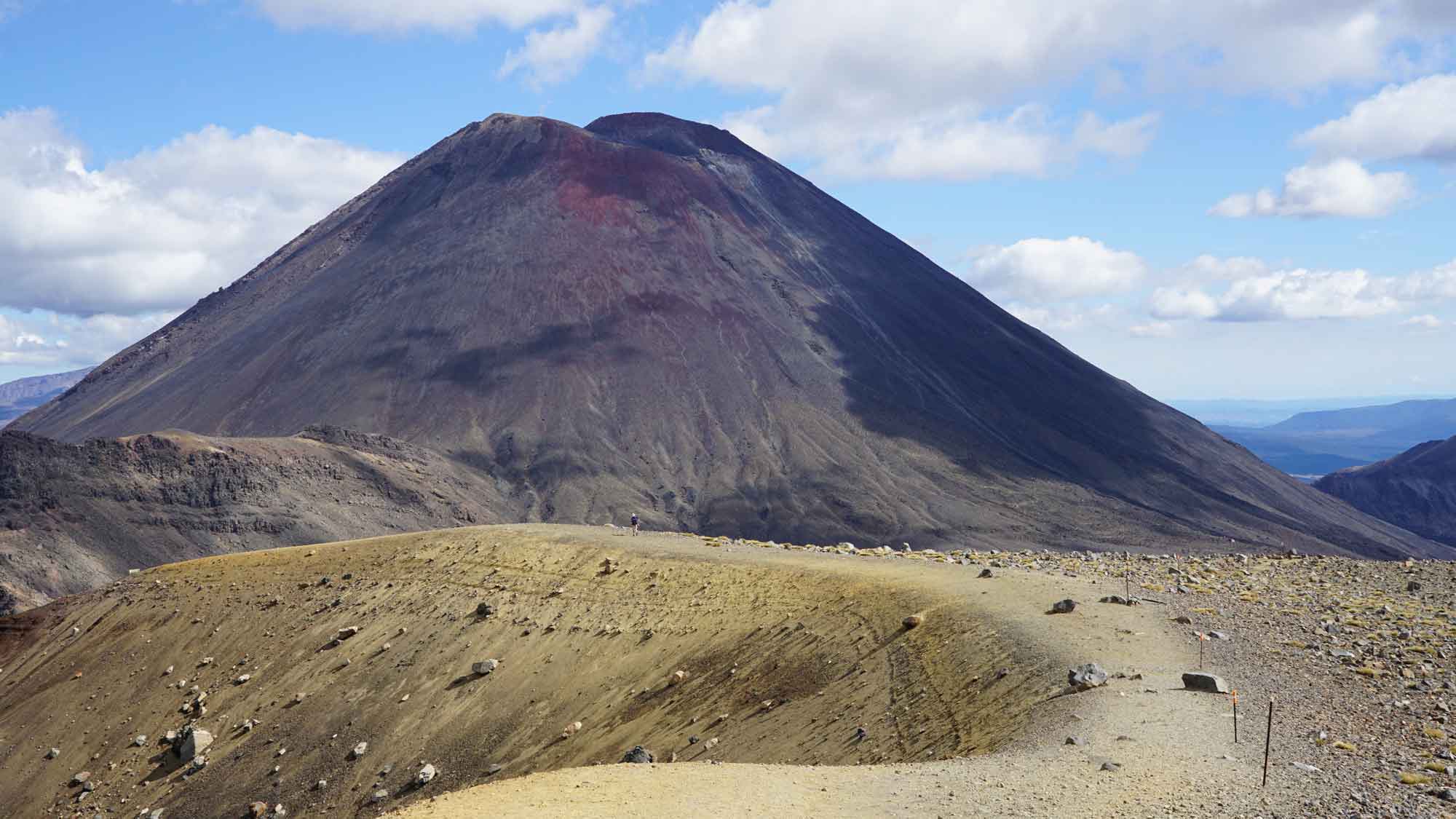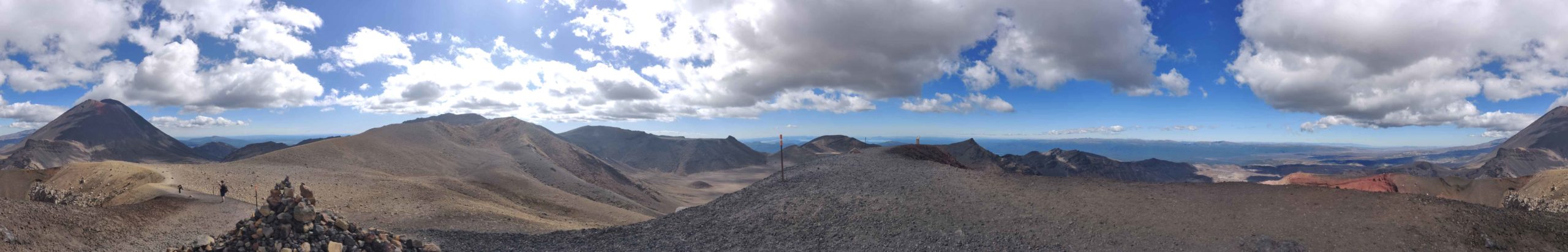 Une vue à 360° nous attend, avec le volcan, les trois lacs dont le Green Lake qu’on a passé en montant, le Blue lake au loin, le Red Crater et le Mont Ngauruhoe, plus proche que jamais. C’est de là que partait le sentier pour grimper sur le volcan, mais qui est interdit depuis 2017 car c’est un sacrilège pour les maori, dont le volcan est une divinité. On ne l’aurait de toute façon pas tenté, ça a l’air atroce 😛. Le vent souffle, mais le ciel est bleu avec quelques nuages histoire de faire la déco. 🙂