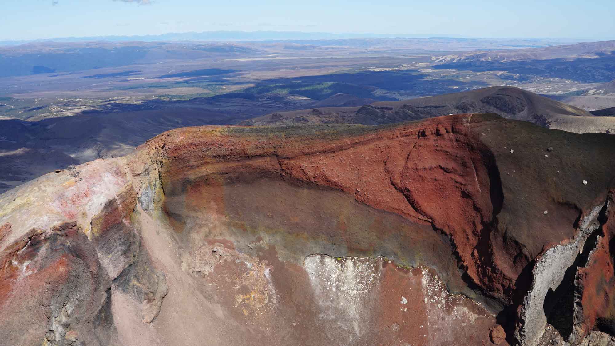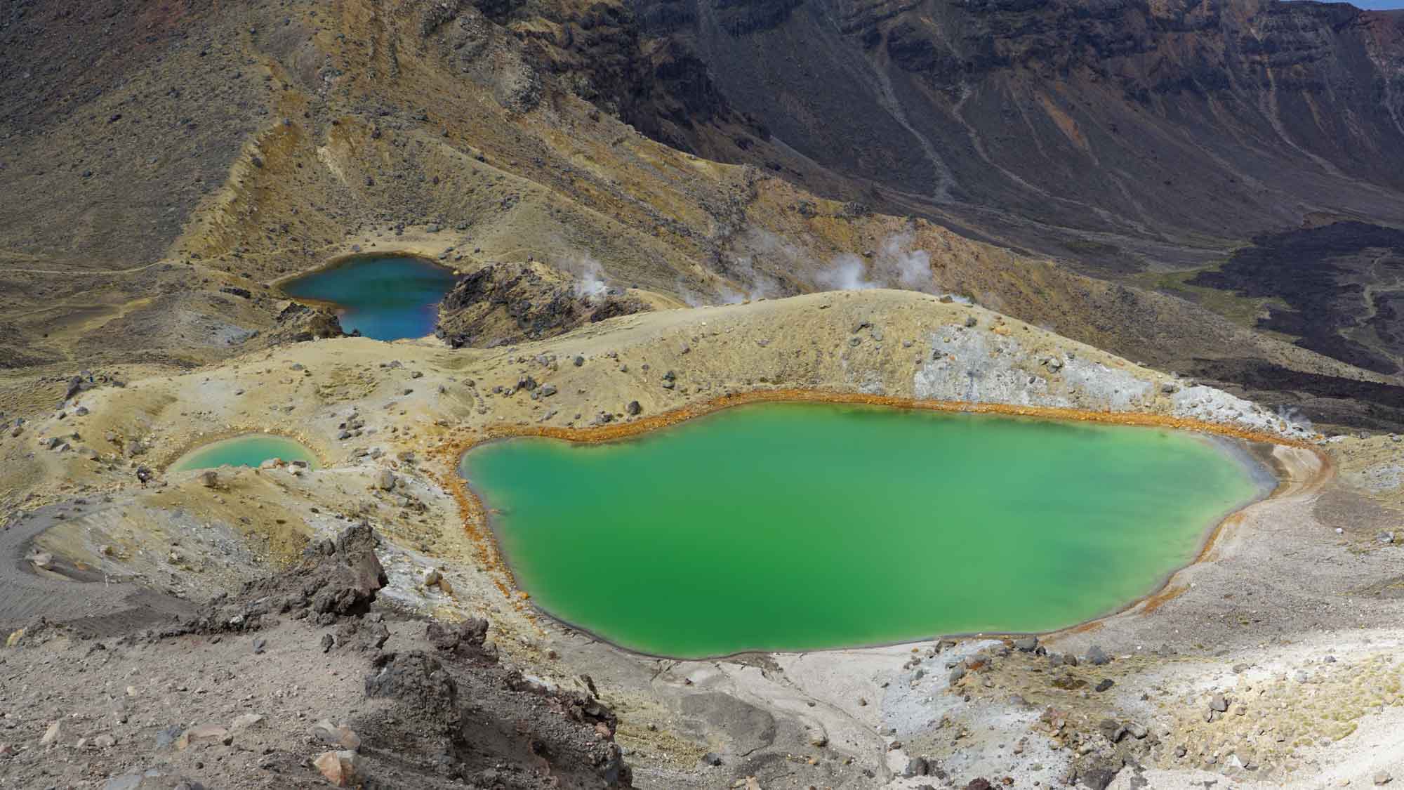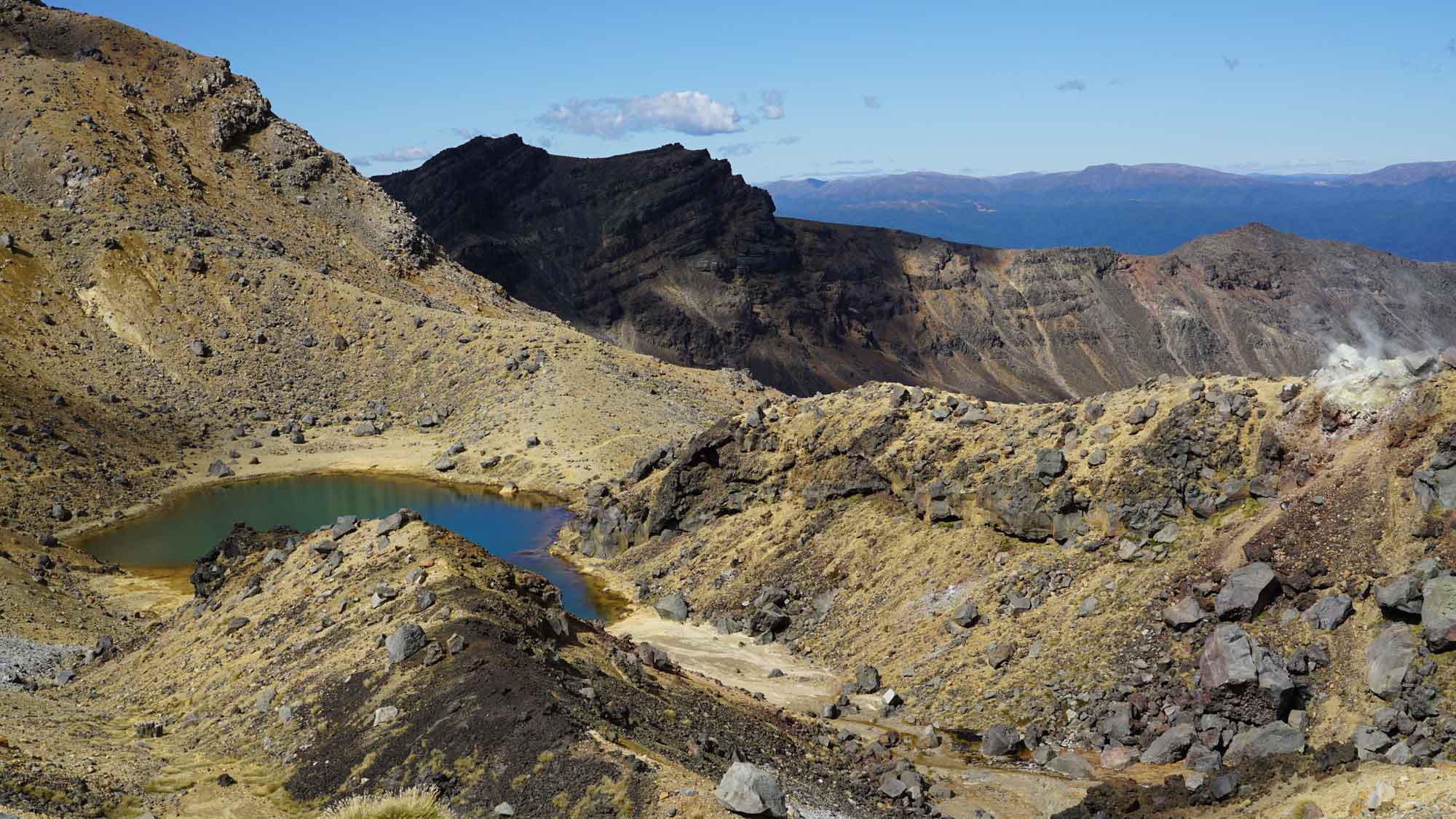 Une vue à 360° nous attend, avec le volcan, les trois lacs dont le Green Lake qu’on a passé en montant, le Blue lake au loin, le Red Crater et le Mont Ngauruhoe, plus proche que jamais. C’est de là que partait le sentier pour grimper sur le volcan, mais qui est interdit depuis 2017 car c’est un sacrilège pour les maori, dont le volcan est une divinité. On ne l’aurait de toute façon pas tenté, ça a l’air atroce 😛. Le vent souffle, mais le ciel est bleu avec quelques nuages histoire de faire la déco. 🙂
