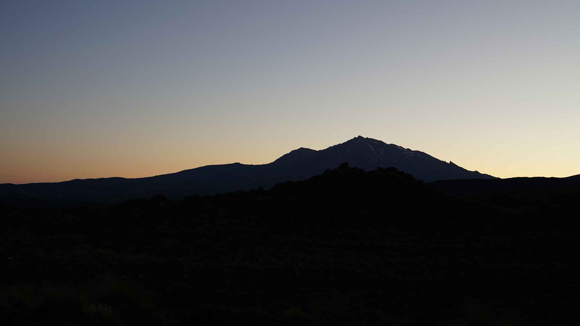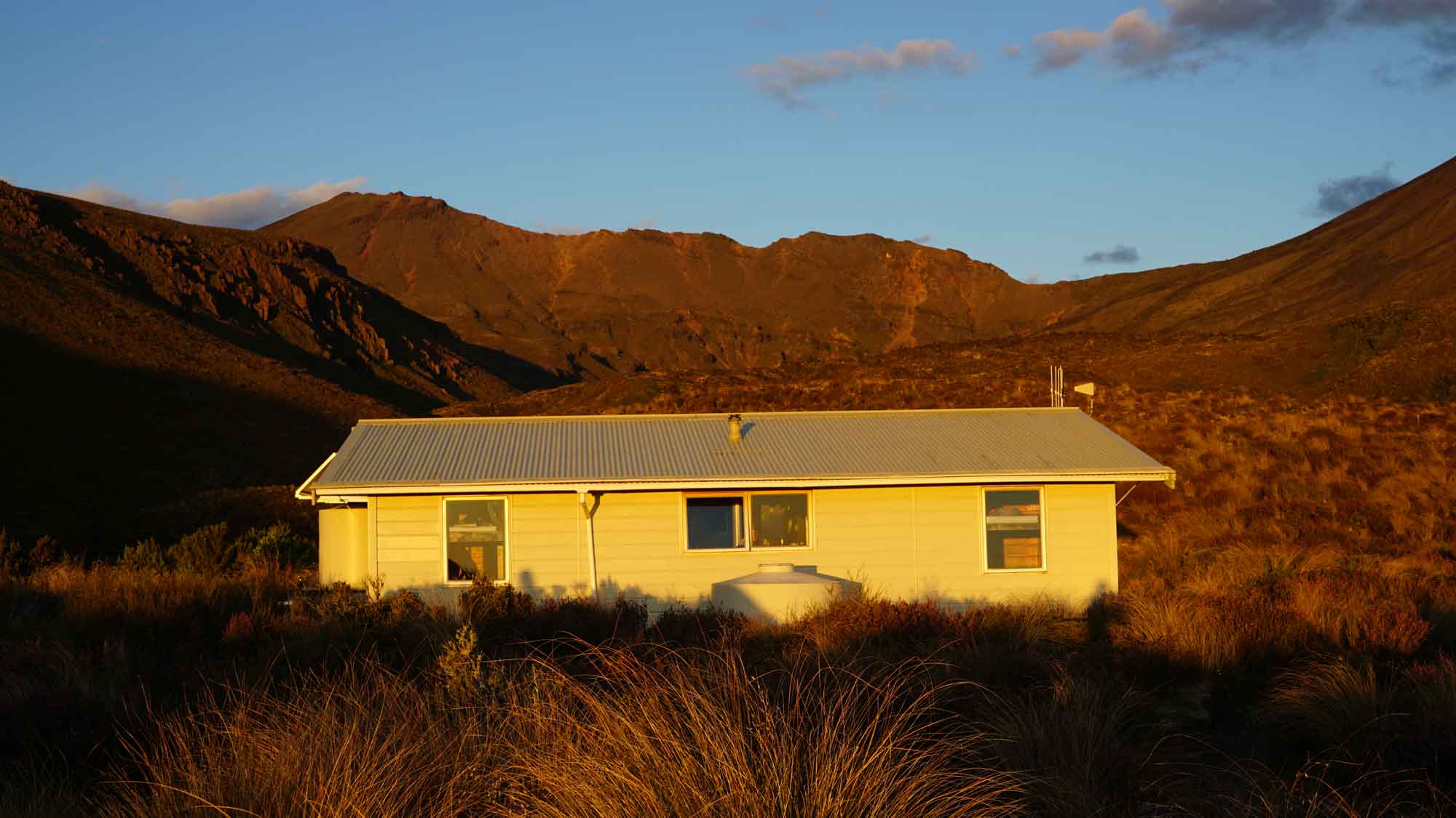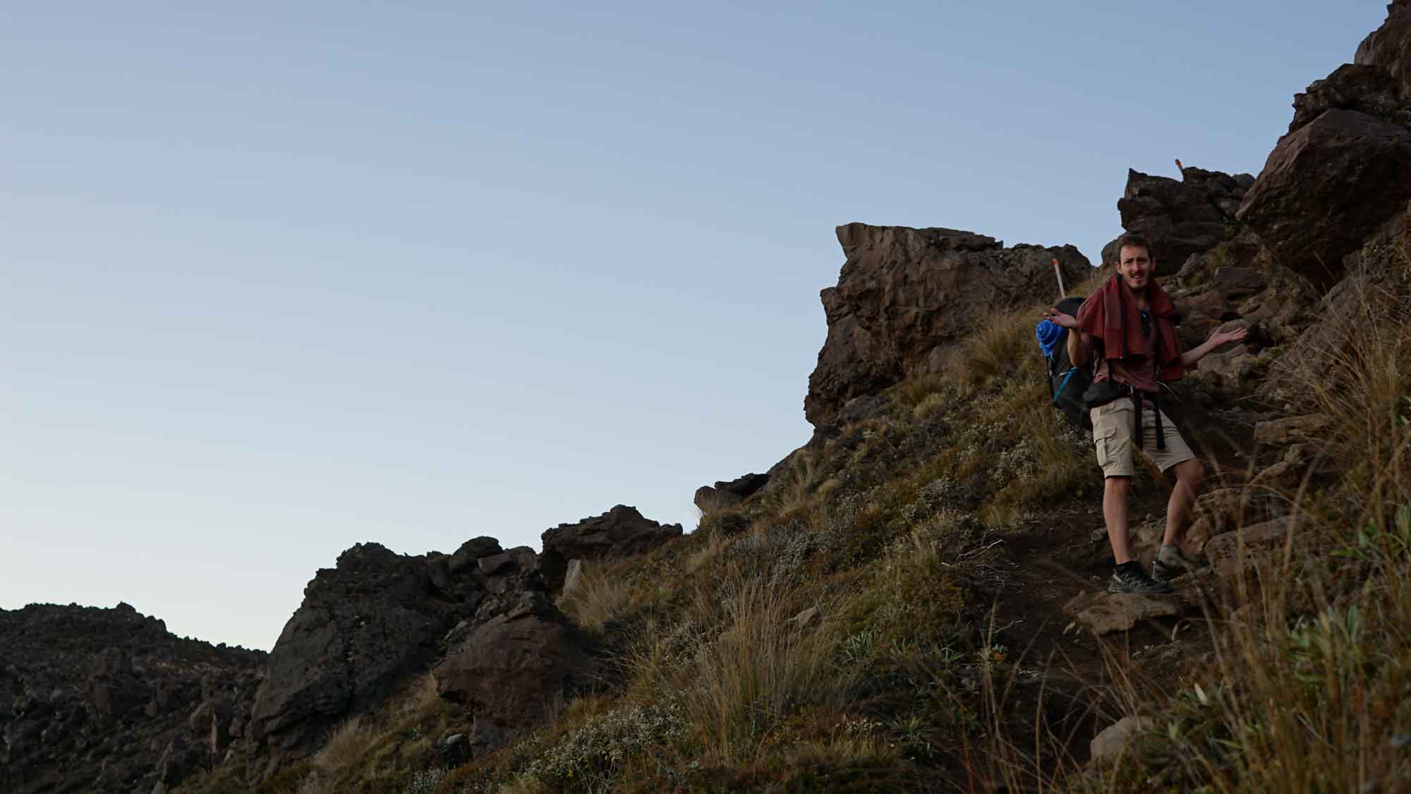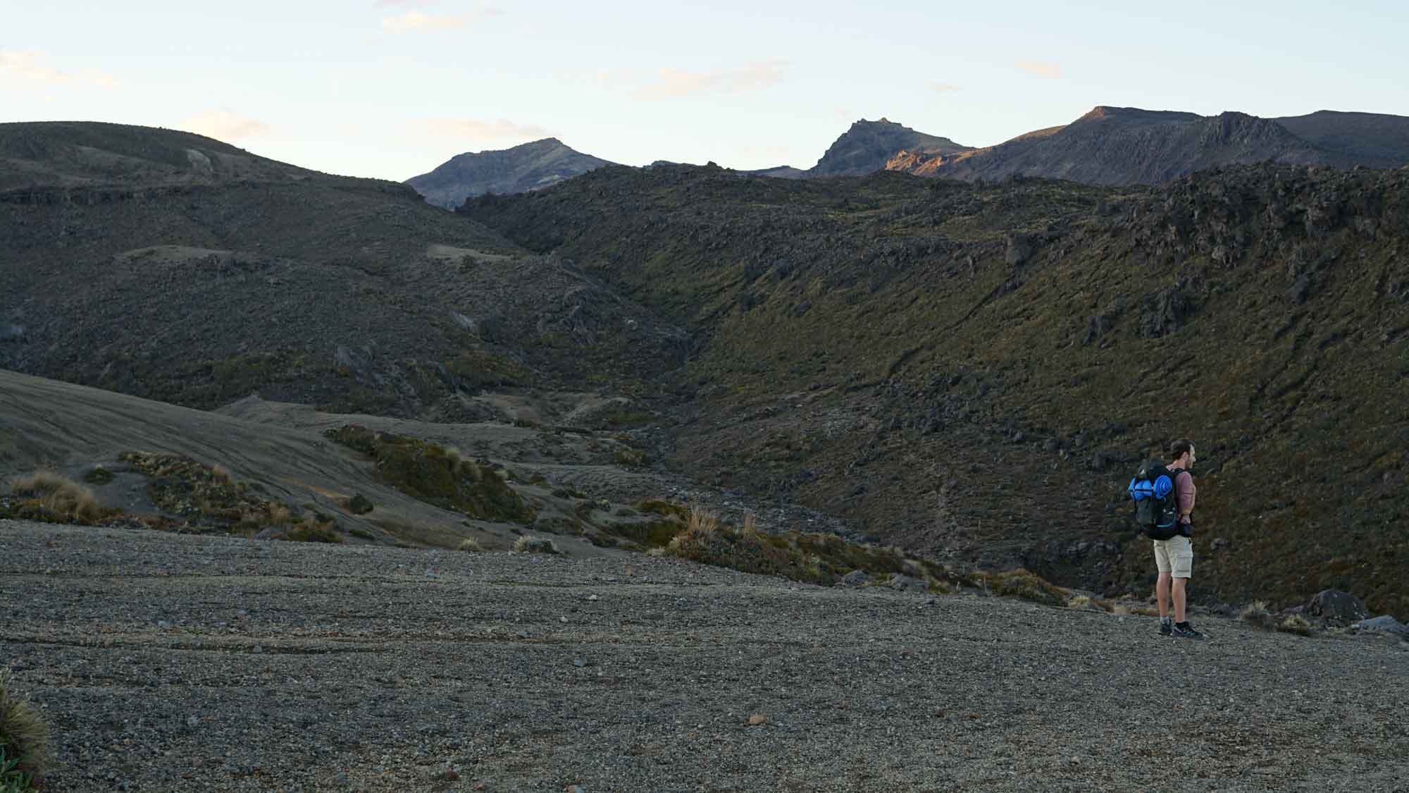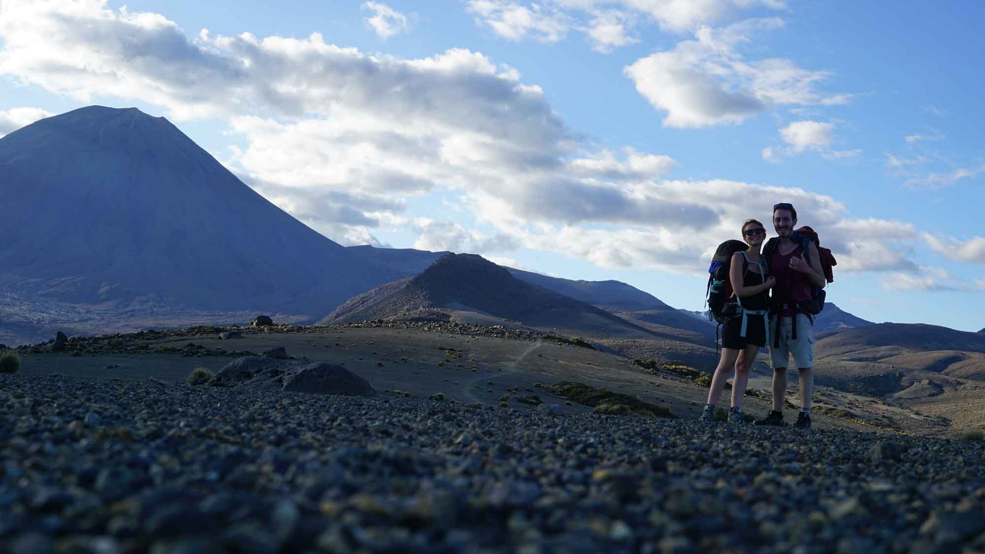 Ensuite on ressort de l’autre côté de la colline, et le paysage devient plus aride, plus lunaire. On se rapproche du volcan et on se fait plaisir avec quelques photos, même si Camille commence à avoir mal aux pieds comme ça ne lui est jamais arrivé et que Romain ne sent plus ses cuisses 🤣. Le jour tombe petit à petit, mais le chemin n’arrête pas de descendre et remonter et on fatigue un peu 😊. Le soleil disparaît derrière le volcan, les couleurs sont magnifiques mais la lumière baisse très vite… et on arrive au refuge Oturere piiiile poil quand la nuit arrive, à 20h (donc on a bien mis trois heures comme on avait vu et pas deux heures et demi comme le disait le ranger 😅).