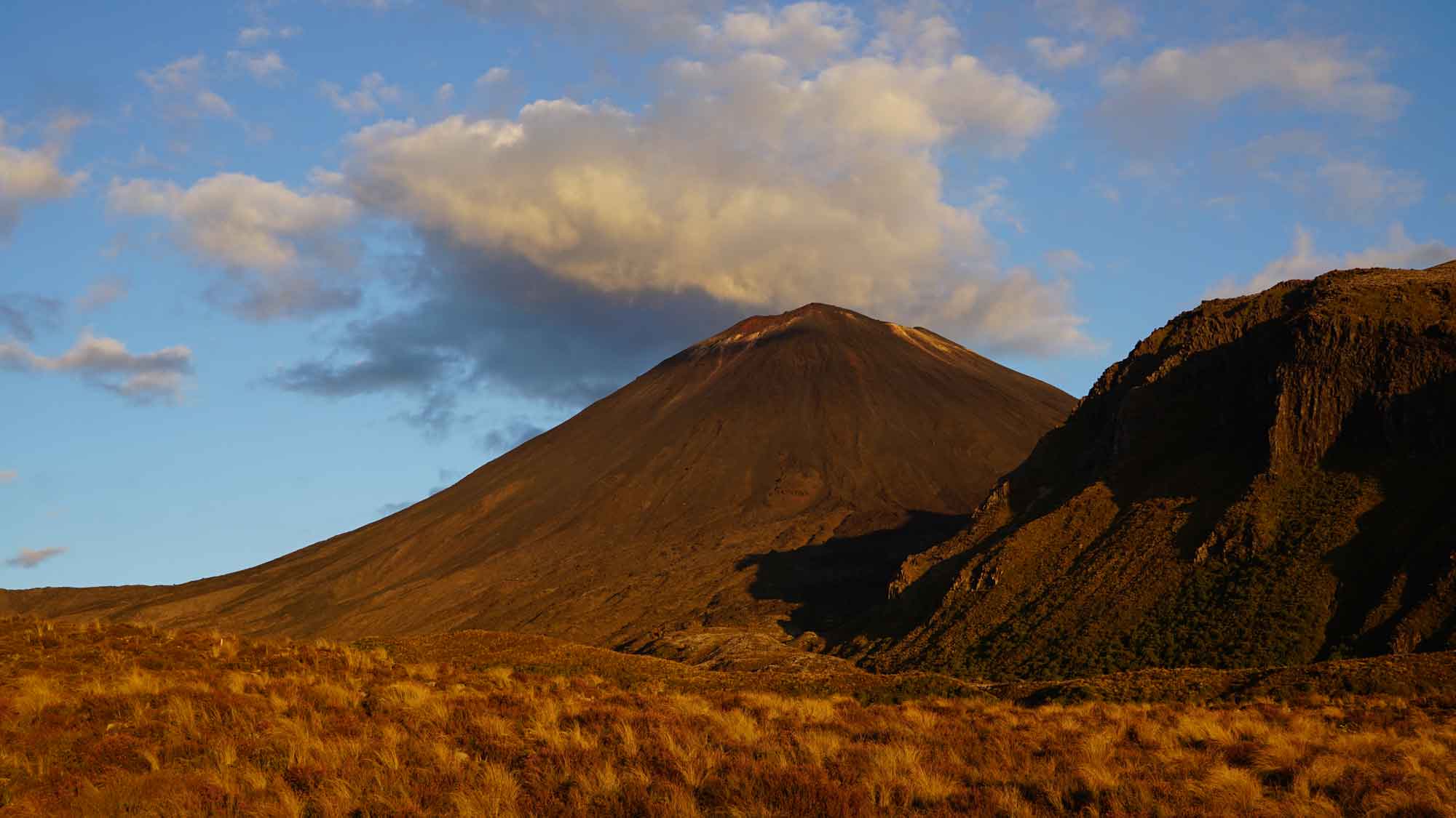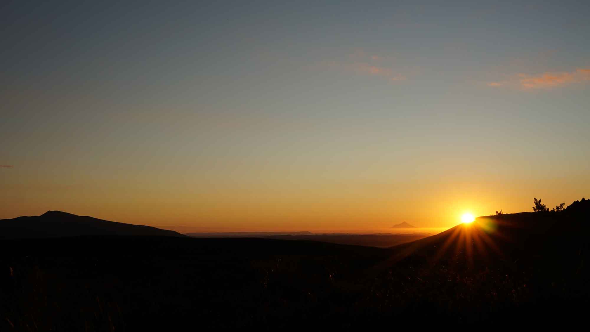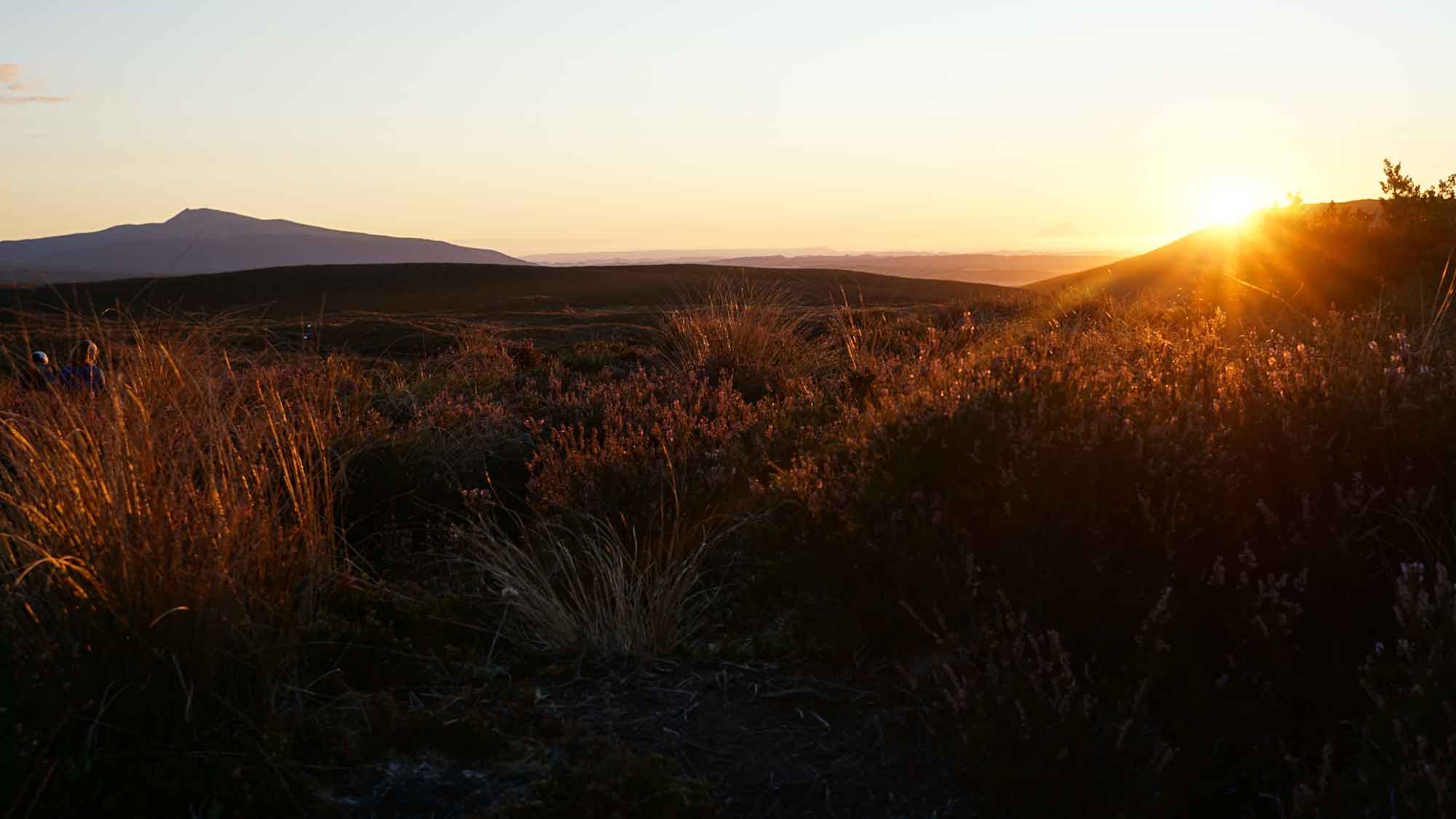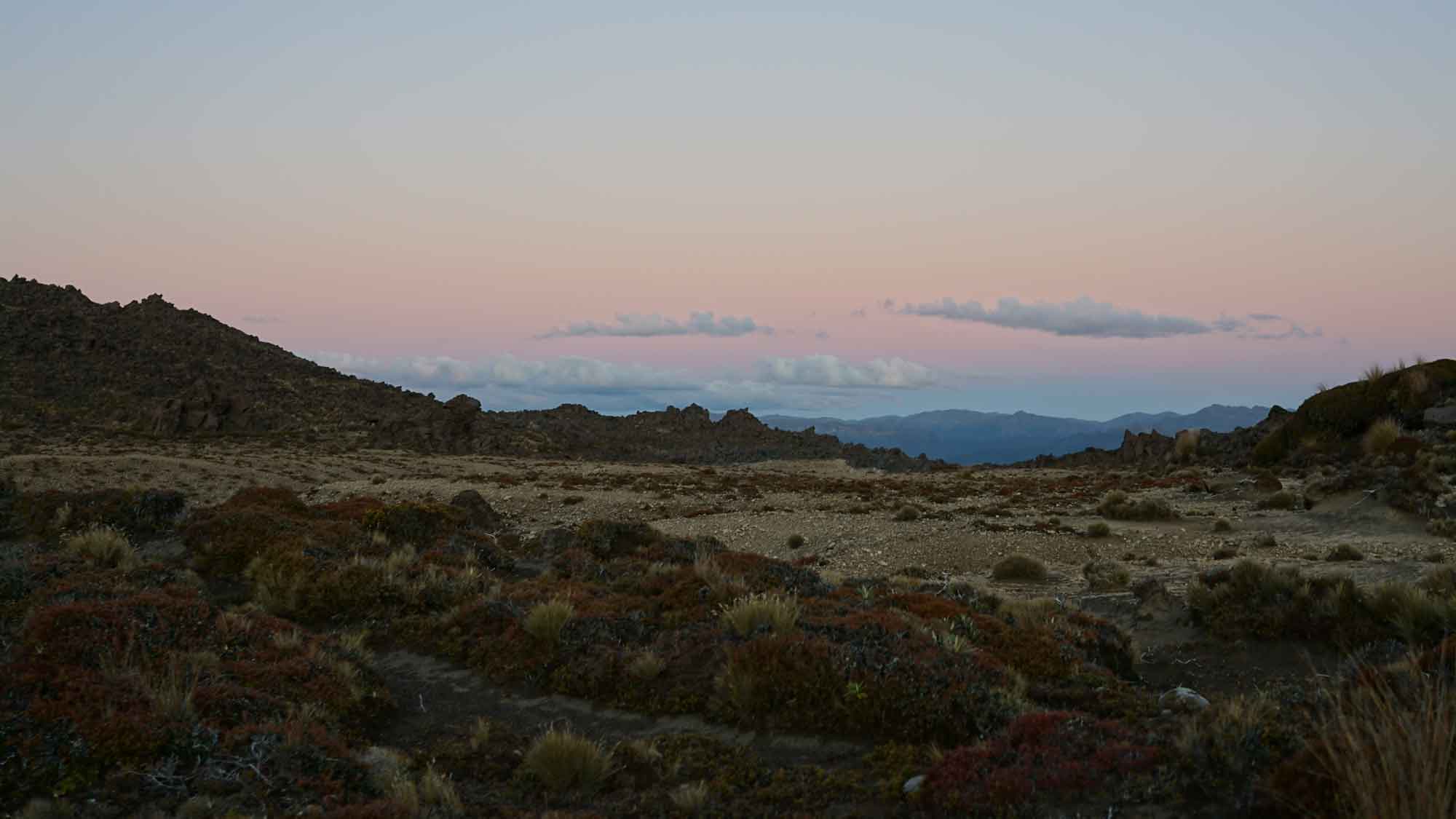 Cette fois, on a eu le temps de s’installer et de manger, et Camille peut profiter du magnifique coucher de soleil sur la vallée, avec vue au loin sur le mont Taranaki (retenez ce nom, vous en entendrez parler de nouveau…). Avant de se coucher, on discute un peu avec le photographe japonais croisé plus tôt, un couple de néerlandais et une singapourienne venue en solo. Ils ont tous l’air très sympa, dommage qu’on n’ait pas plus de temps à passer ensemble !