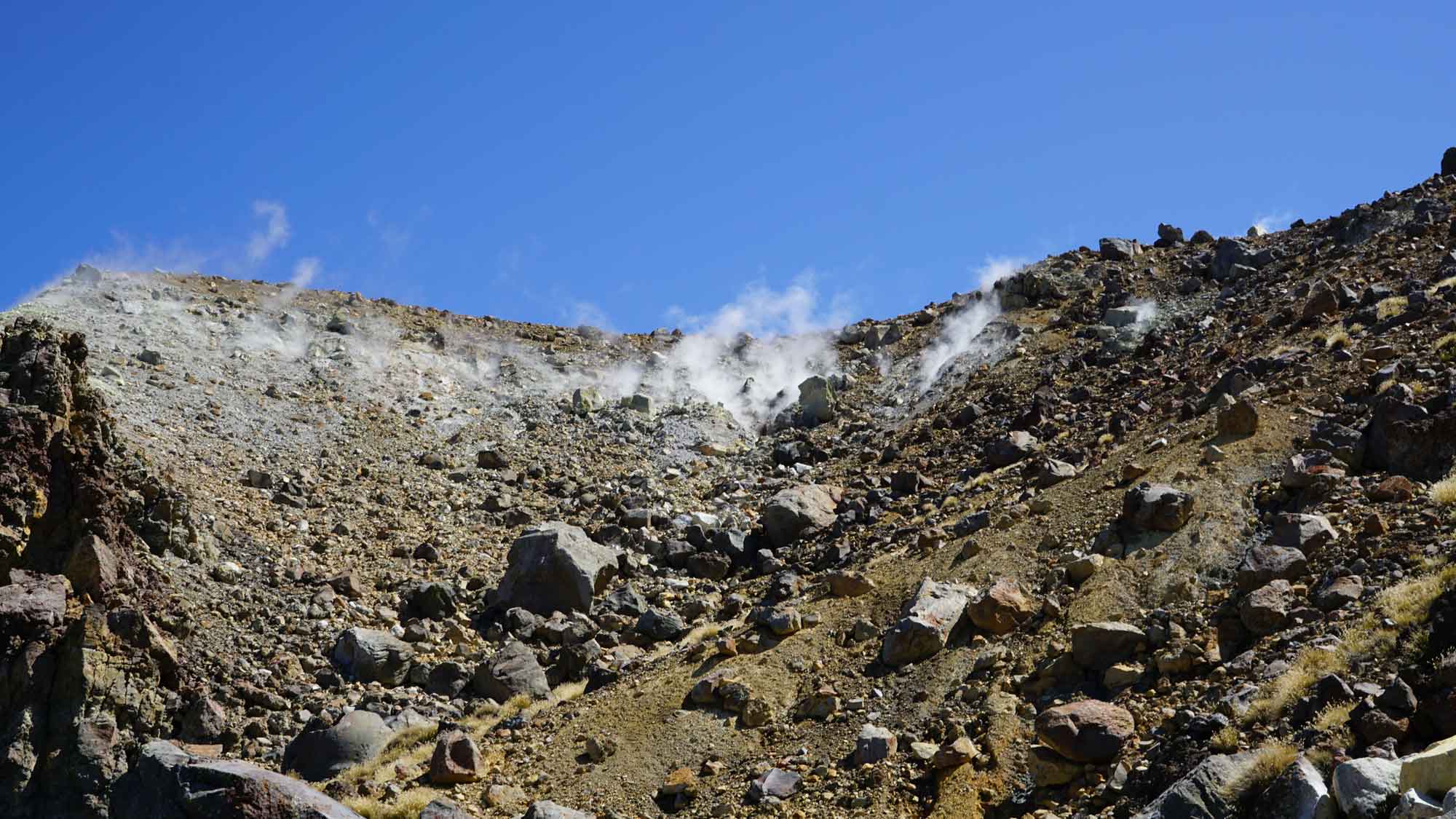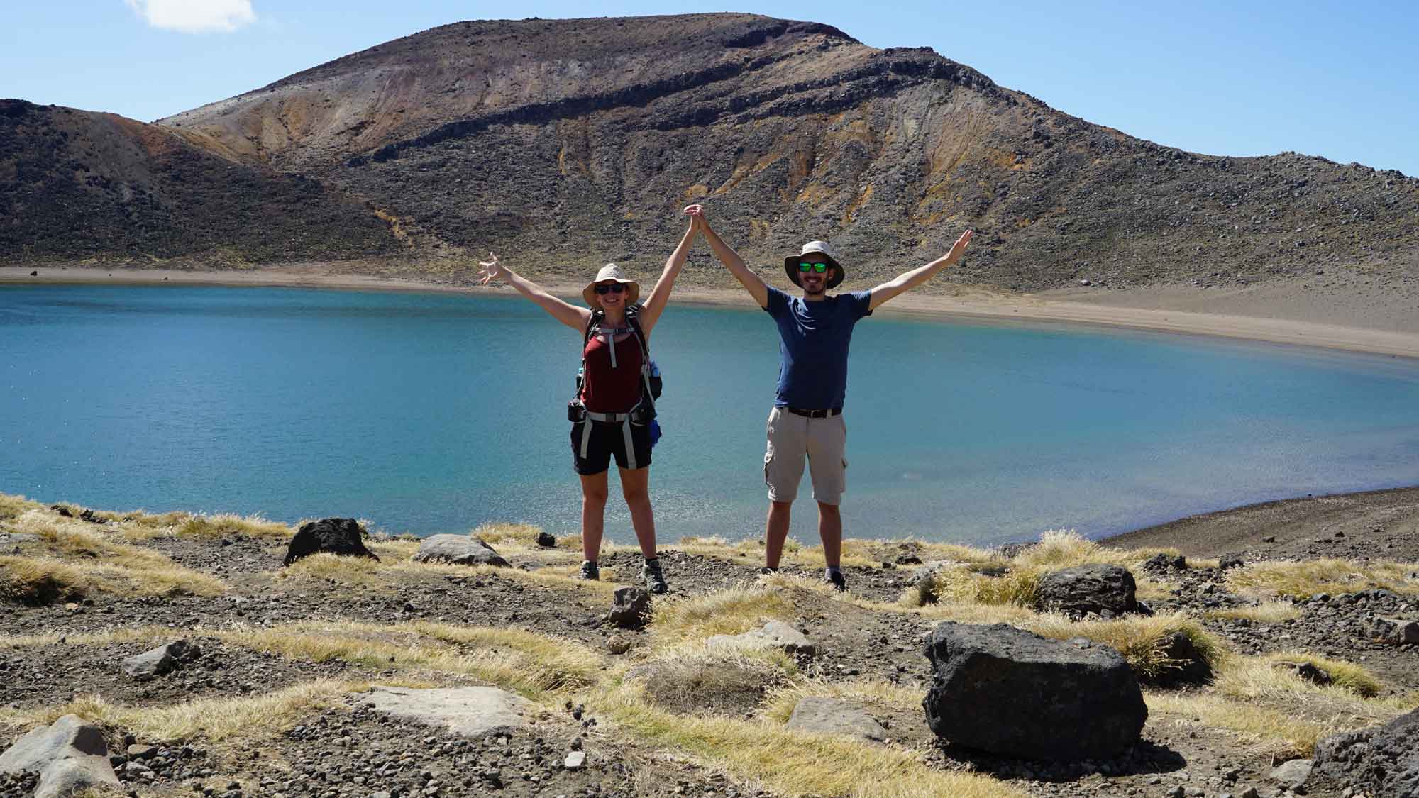 On arrive en haut de la première montée — en passant le col où on voit des colonnes de fumée de soufre, car le volcan est actif ! — avec une première récompense : un lac magnifique, avec des reflets bleus et mauves. On se pose là pour manger, et on voit pas mal de groupes passer de l’autre côté du lac : ce sont les derniers groupes de randonneurs qui font le très fréquenté Alpine Crossing. On les aura très peu vus (une vingtaine sur les deux mille qui ont suivi le chemin ce jour-là d’après la ranger 😯), et on n’en est pas mécontents 😊. On fait un crochet de quarante minutes aller-retour pour aller voir le Blue Lake, puis on s’attaque au dernier morceau, le plus costaud, de la montée : le flanc du Red Crater, fait de roche et terreau volcanique, qui roule et s’enfonce sous nos pas. Honnêtement, malgré ce que nous ont dit les gens qu’on avaient croisés, on est contents de l’avoir fait dans ce sens-là ! En donnant des petits coups de pied pour assurer la prise et en se penchant bien en avant, on arrive jusqu’en haut, complètement crevés… mais.