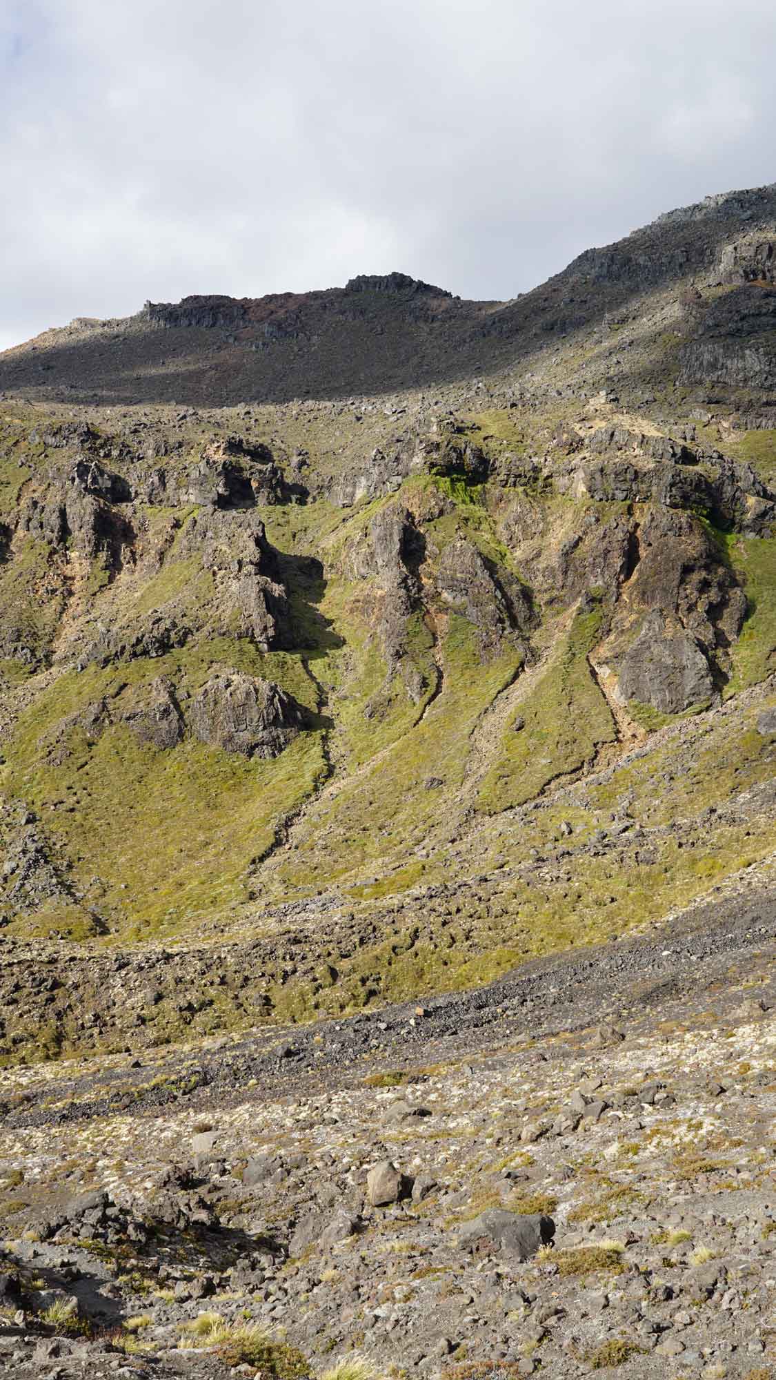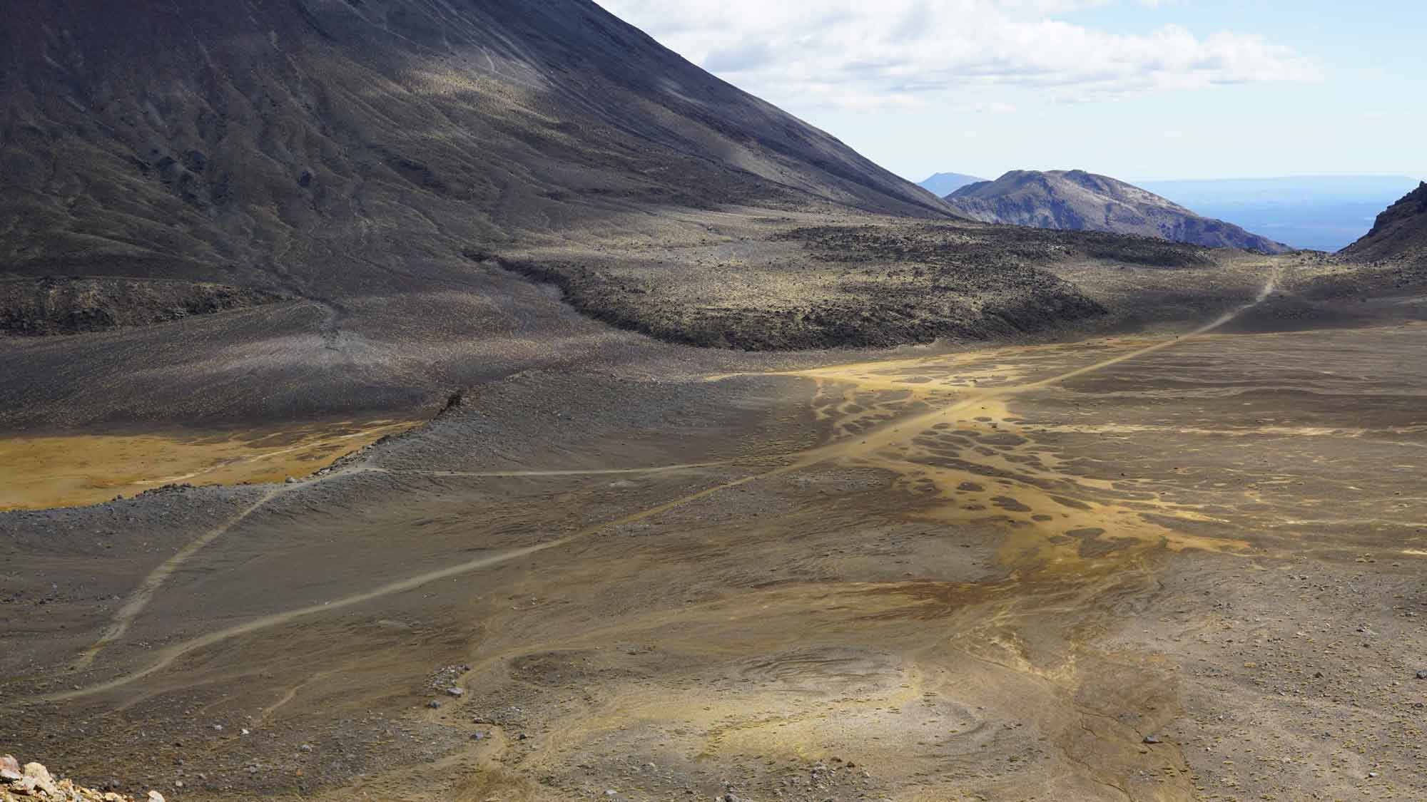 On continue… et là il n’y a plus personne, c’est génial. On essaye de se motiver à avancer vite pour se laisser une possibilité de faire le deuxième tronçon dans la journée (si on arrive au premier refuge Waihohonu avant 16h ça peut encore le faire), mais on se fait pas trop d’illusion… Comme la balade tourne autour du volcan Ngauruhoe, on passe devant la face exacte où ils ont tourné les scènes du Mordor, c’est trop bien ! On parle du Seigneur des Anneaux (forcément), en s’arrêtant un peu quand on croise des gens qui arrivent de l’autre sens, l’air bien crevés. Quand on leur raconte notre plan de condenser deux jours en un, ils répondent « ben ça va être une grooosse journée votre deuxième jour… », mais bon, c’est un peu tard pour s’inquiéter hein. 😛