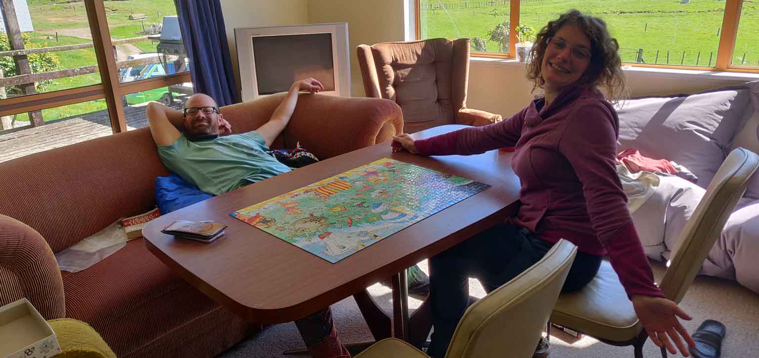 Même si on est isolés, on ne s’ennuie pas : avec le van, Camille a récupéré une petite guitare bleue, et tout le monde s’y met (même Romain, qui sait maintenant accompagner La Corrida de Cabrel !). Camille donne des cours de musique à Sara et Juan, et Sara donne des cours d’italien. Grâce aux films et aux livres que nous avions téléchargés suite à vos petites recommandations, nous avons de quoi nous faire des après-midi lecture et des soirées cinéma (et nous traumatiser avec Melancholia le premier soir haha). Ainsi que quelques soirées puzzle et jeux, Time’s Up et Concept dont Camille s’amuse à recréer un plateau.