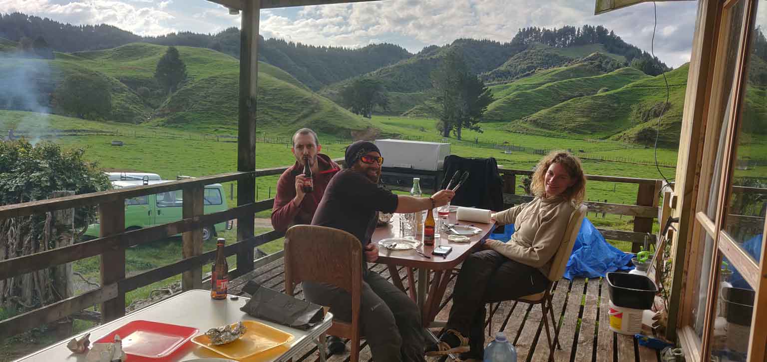 Le 11 mai, un mois et demi après notre arrivée, la Nouvelle-Zélande qui avait réagi très vite au virus a levé le confinement. On a pu en profiter pour voir nos voisins, davantage que pour leur donner des tartes aux pommes entre deux portes pour respecter la « bubble » — la bulle que les néo-zélandais devaient maintenir autour de leur famille la plus proche pour limiter la propagation du virus. Le 15 mai, tout excités, on est allés dîner chez Vik et Sally (le chasseur de sanglier, adorable, avec une stature de viking), puis deux jours plus tard, on a fêté les 29 ans de Romain avec un déjeuner en terrasse à douze avec les trois familles des voisins. 😀