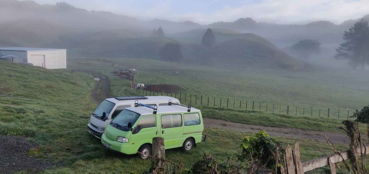 Ce fut notre seconde expérience « pure Nouvelle-Zélande » — après le sanglier sans tête de l’épisode précédent — pour faire démarrer un van en le faisant rouler, on le tire avec… un tracteur, évidemment !